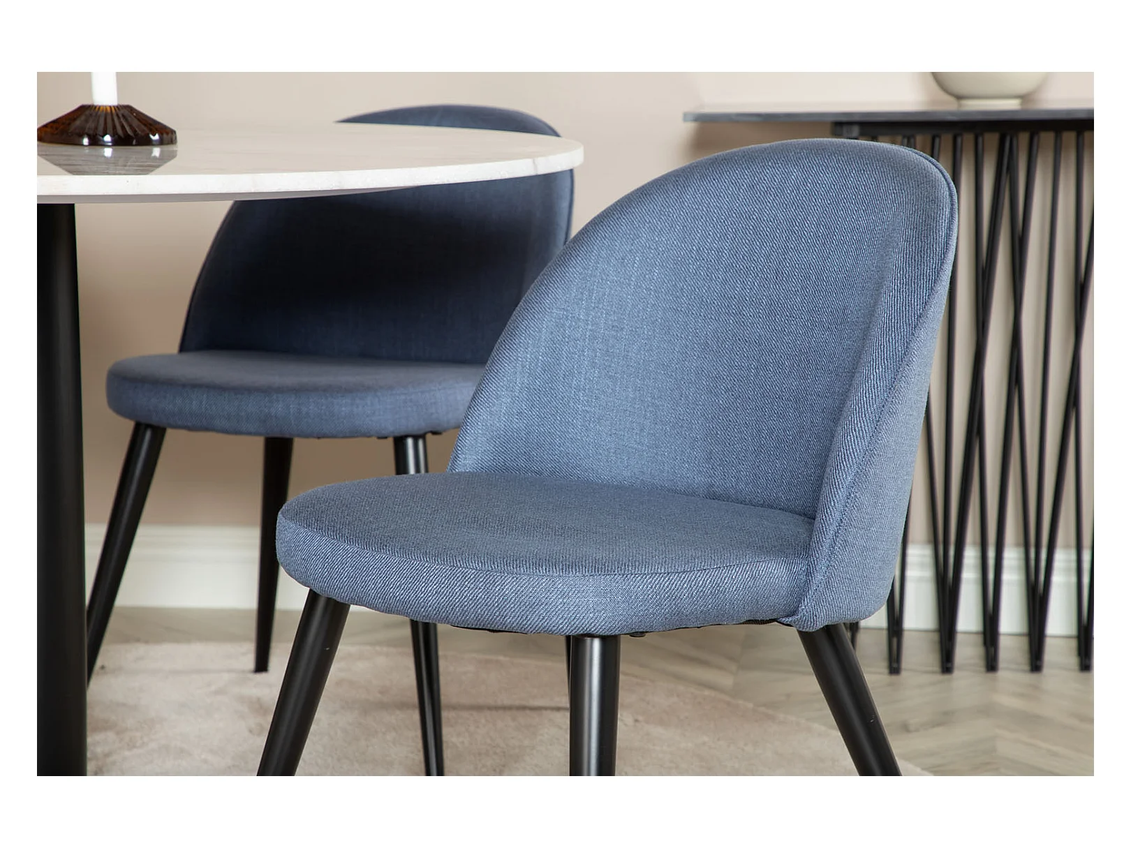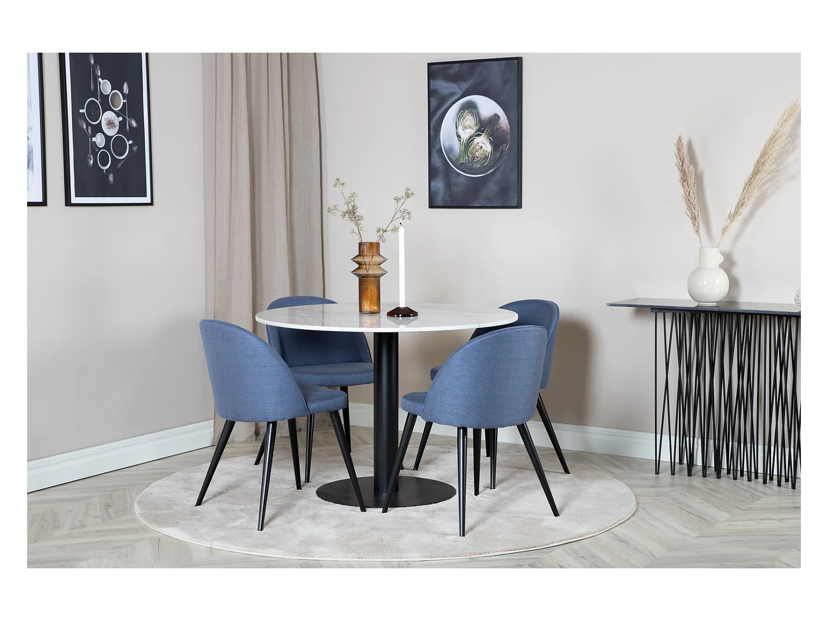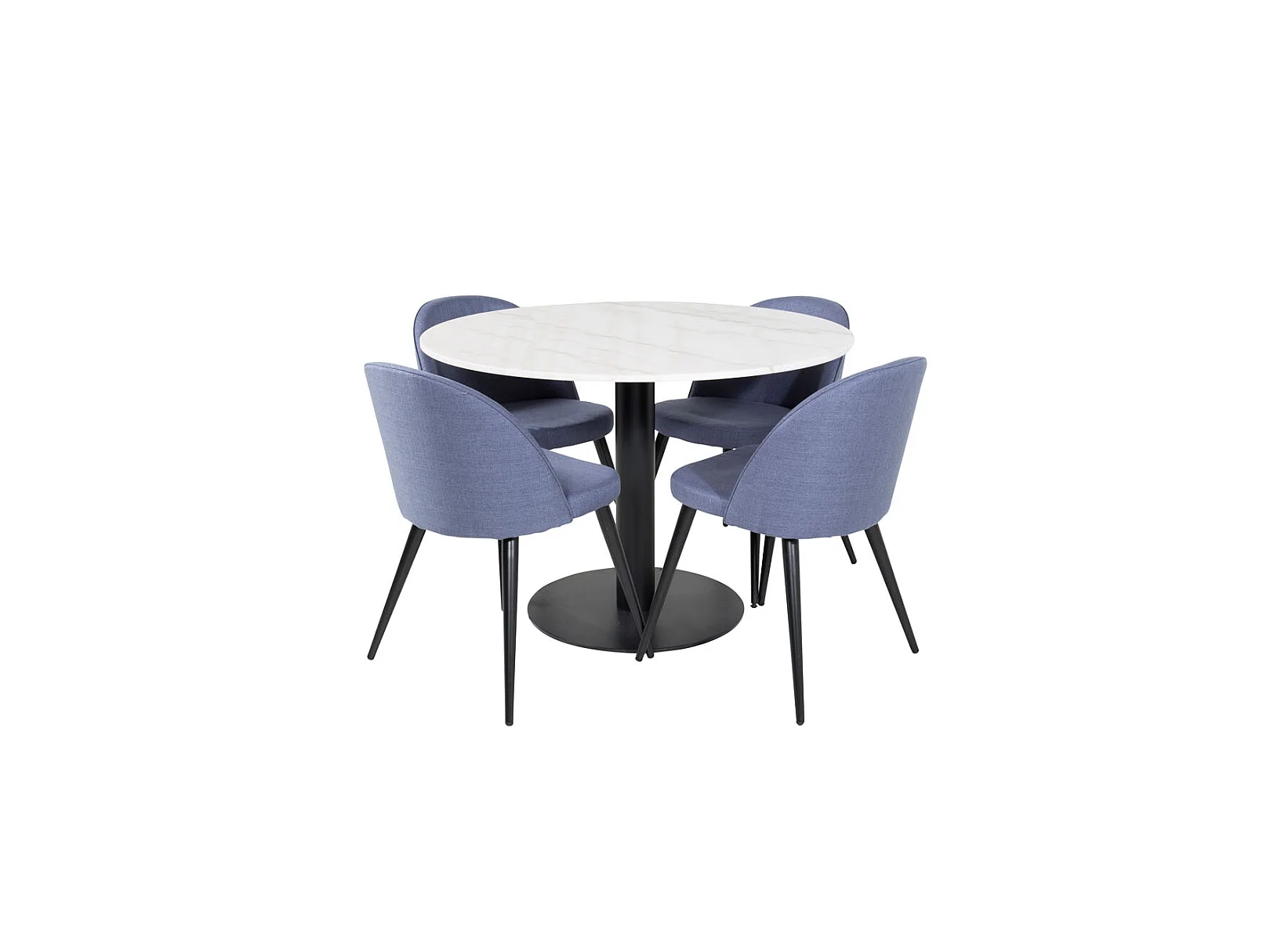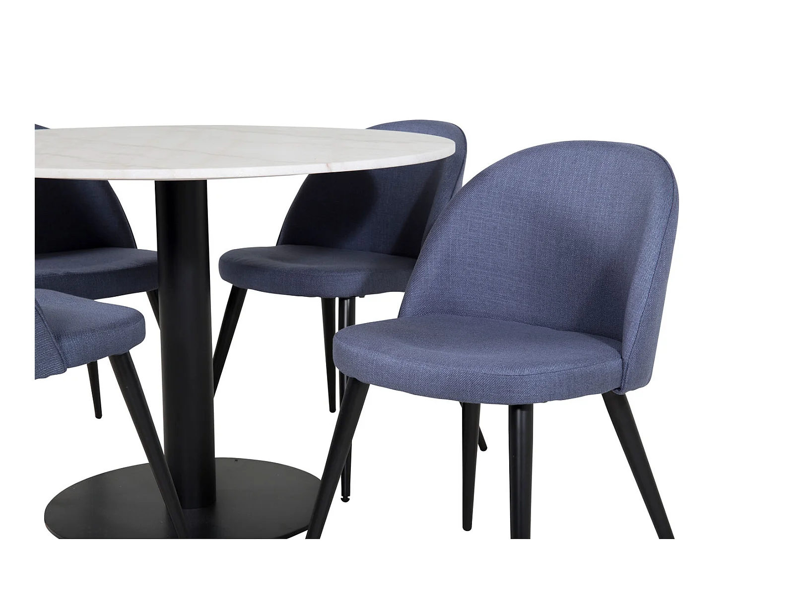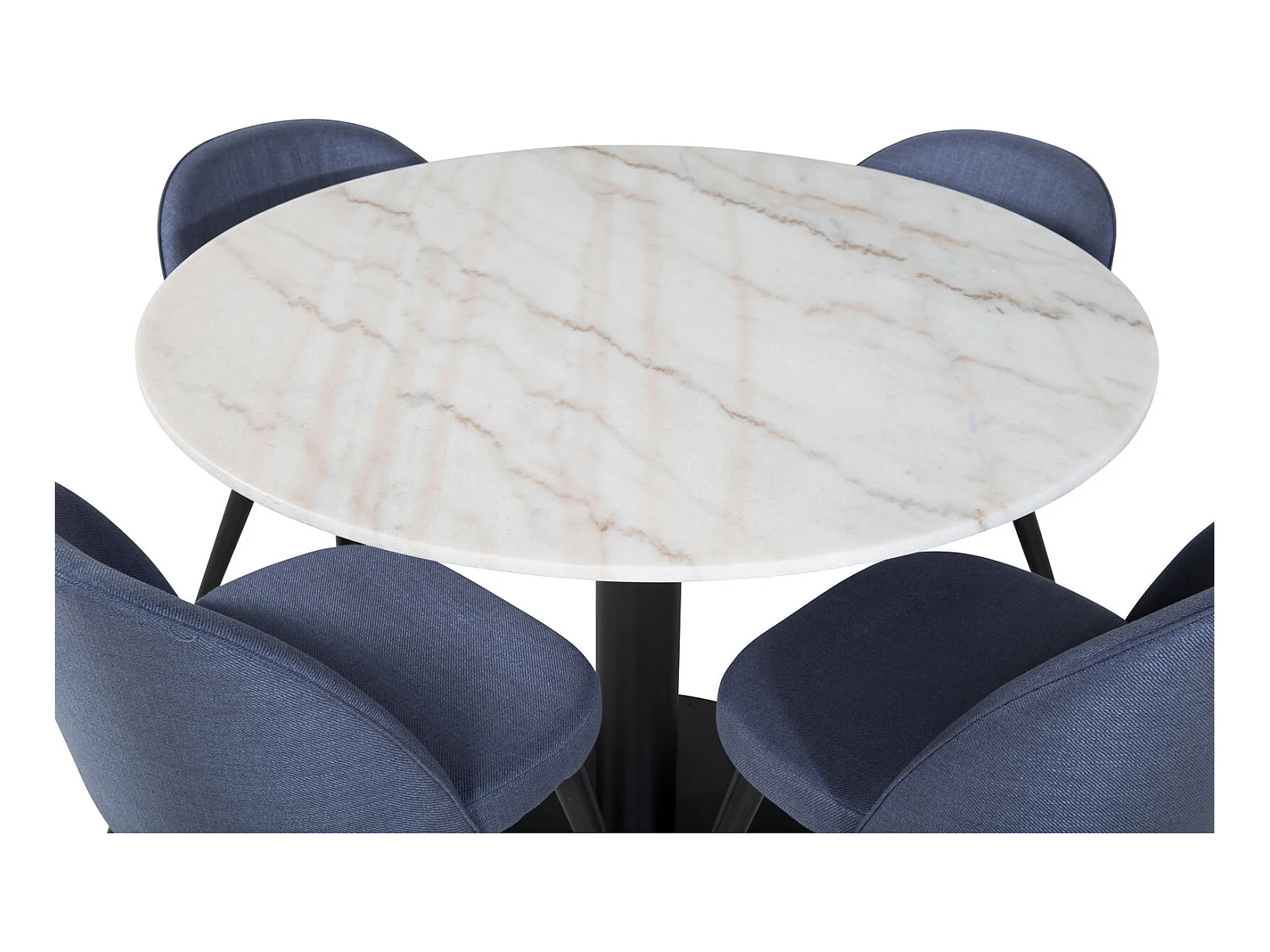 EstelleØ106WHBL eethoek eetkamertafel wit, marmer en 4 Velvet eetkamerstal blauw.