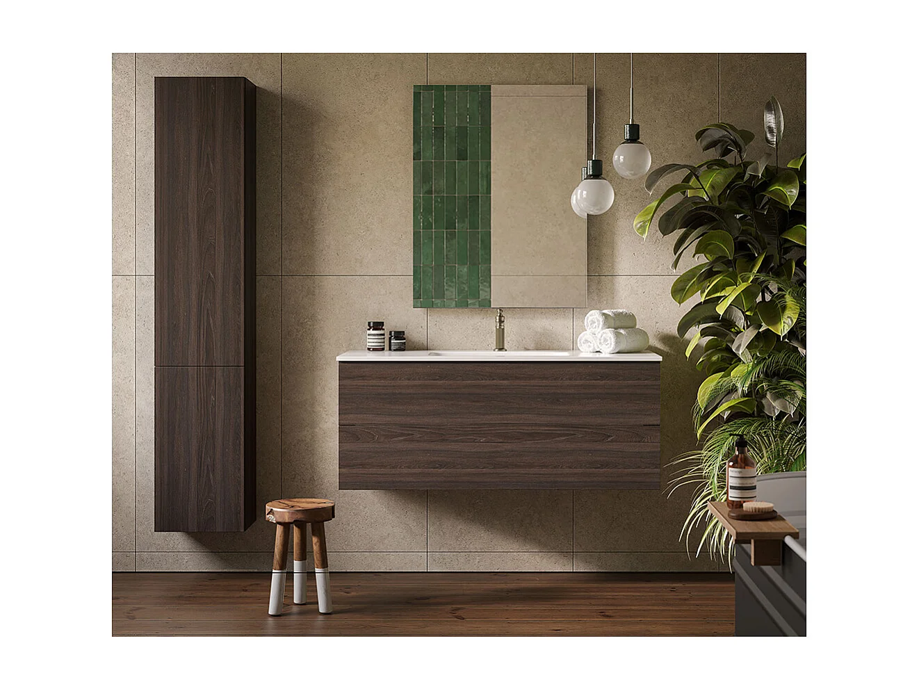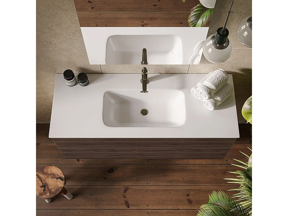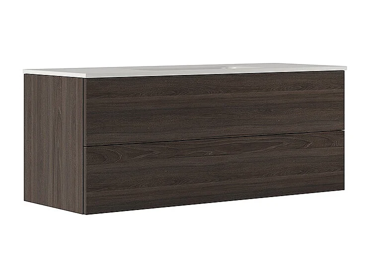 Etherische Badkamerkast, Donker Eikenhout Afwerking, 2 Lades En Centrale Wastafel