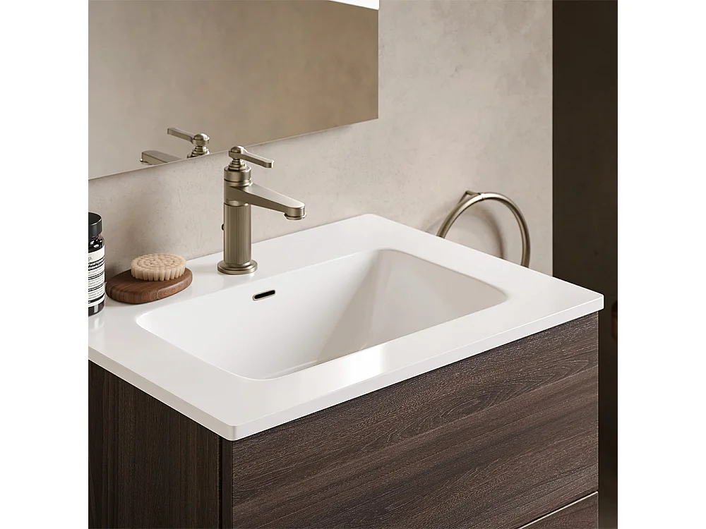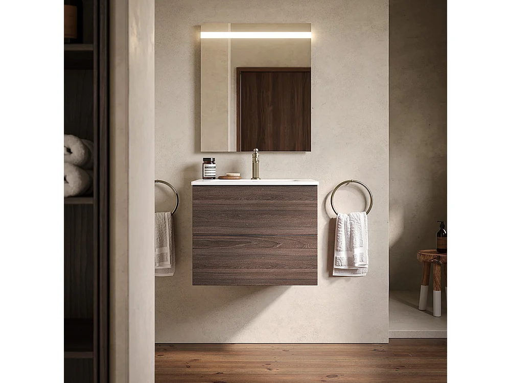 Etherische Badkamerkast, Donker Eikenhout Afwerking, 2 Lades En Centrale Wastafel