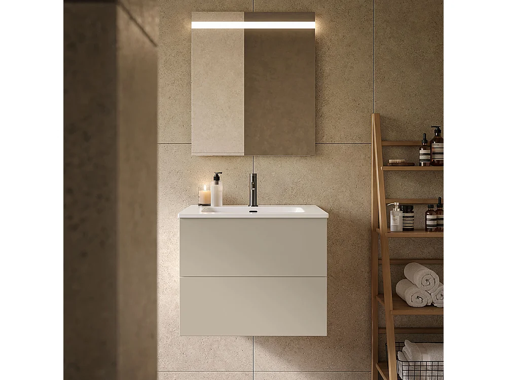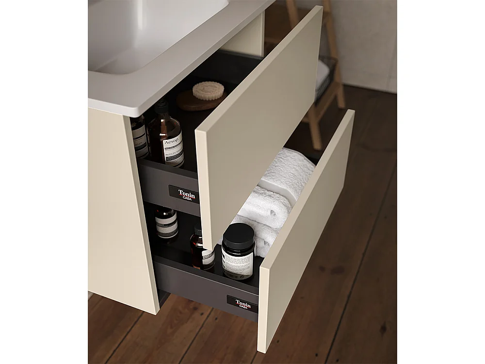 Etherische Badkamerkast, Duifgrijs Afwerking, 2 Lades En Centrale Wastafel