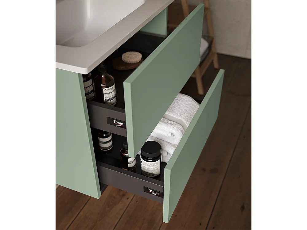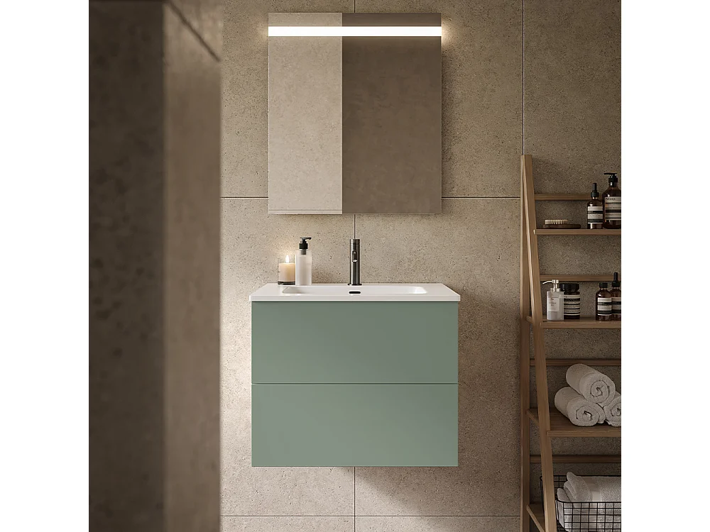Etherische Badkamerkast, Duifgrijs Afwerking, 2 Lades En Centrale Wastafel