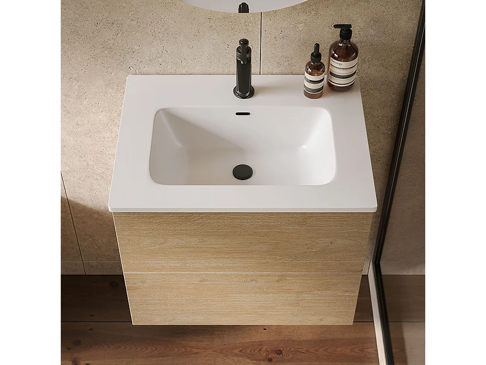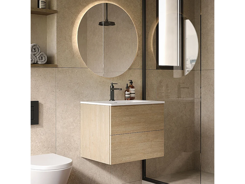 Etherische Badkamerkast, Gebleekte Eikenhouten Afwerking, 2 Lades En Centrale Wastafel