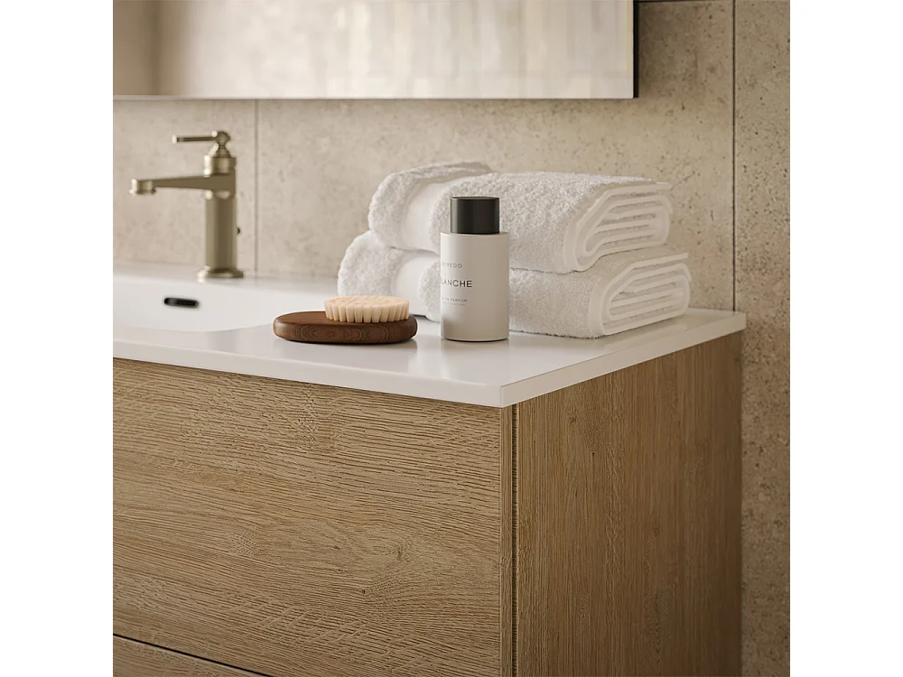 Etherische Badkamerkast, Gebleekte Eikenhouten Afwerking, 2 Lades En Centrale Wastafel