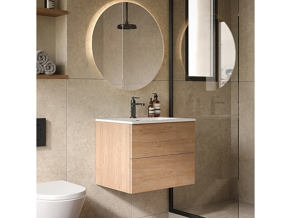 Etherische Badkamerkast, Natuurlijke Eikenhouten Afwerking, 2 Lades En Centrale Wastafel