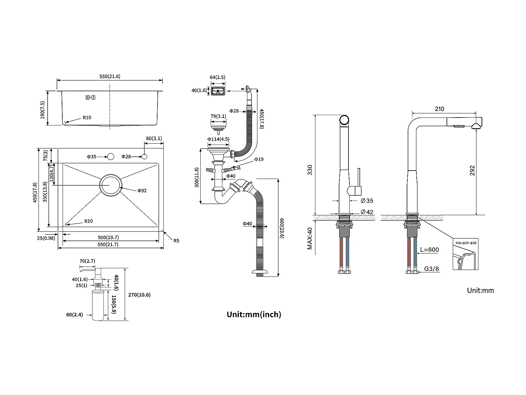 EviEr Keuken 1 Bak 55*45CM Inbouw- en Opbouwspoelbak met Zeepdispenser+Mengkraan Keuken met 360° Draaibare Uittrekbare Handdouche, Geborsteld