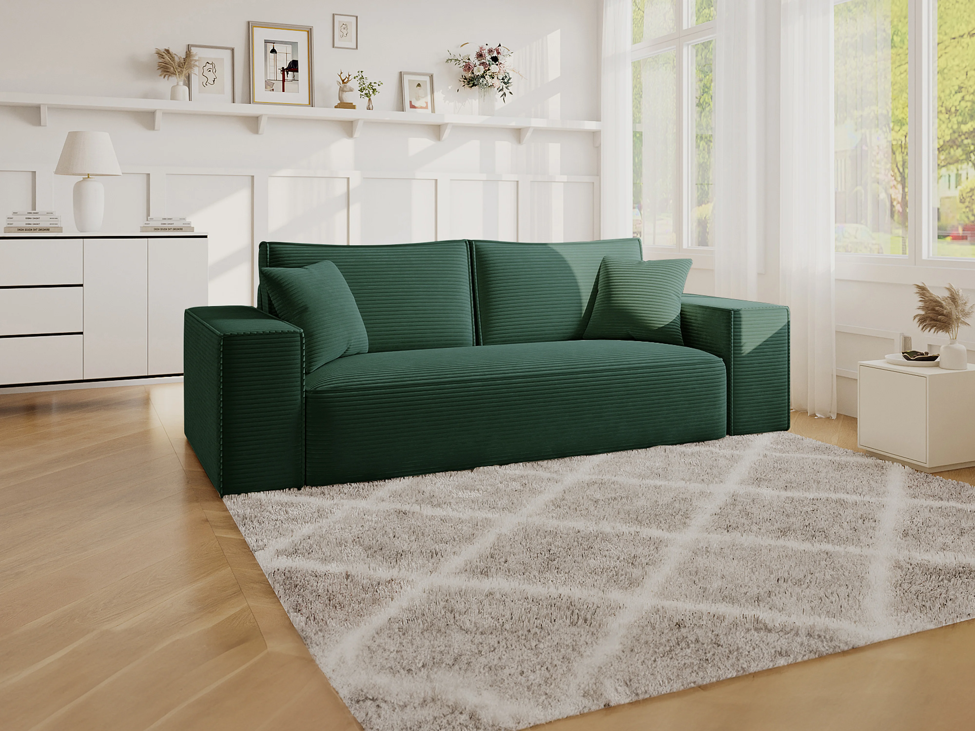 Express-driezitsslaapbank van spargroen ribfluweel - Bed 140 cm - Matras 14 cm met vormgeheugen - AMELIA