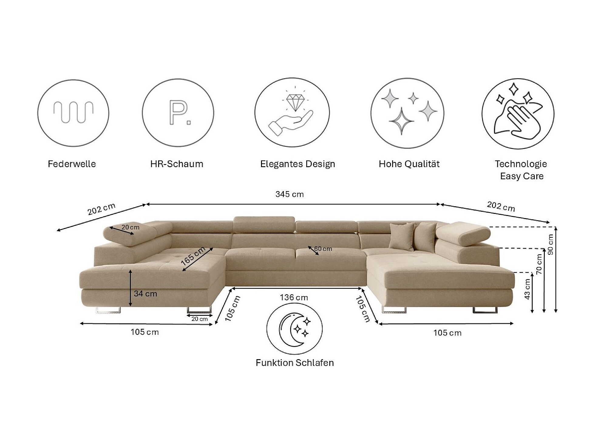 FALIO U-vormige hoekbank met slaapfunctie, stof Noel, lichtbeige