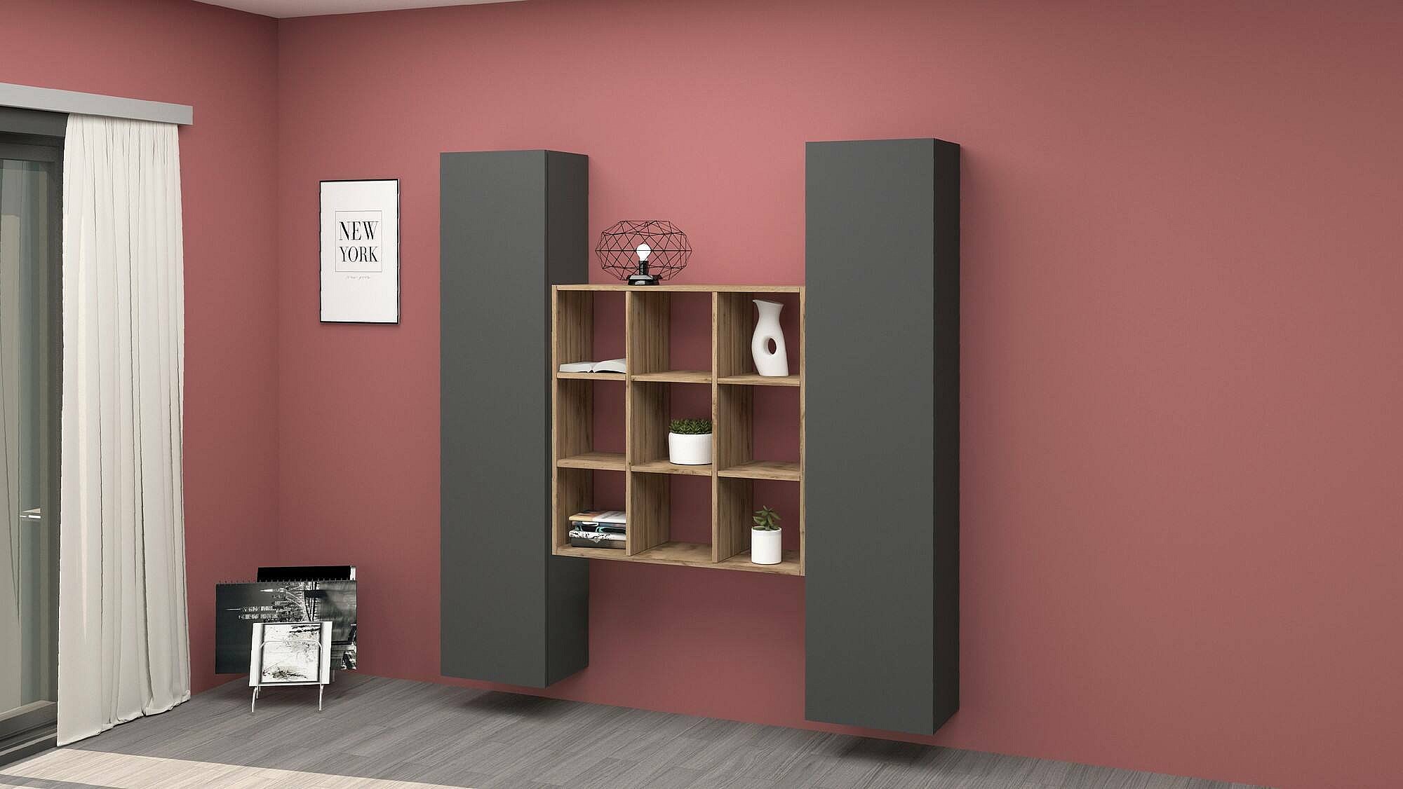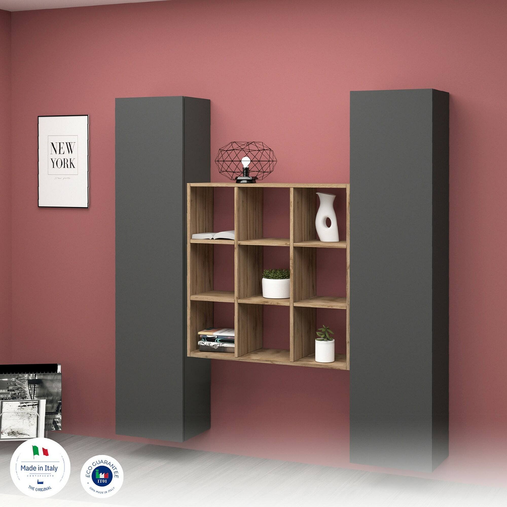 Franco dressoir, Woonkamerset met 2 deuren en planken, Woonkamerbuffet, Keukendressoir, 100% Made in Italy, 140x30h180 cm, Antraciet en Esdoorn