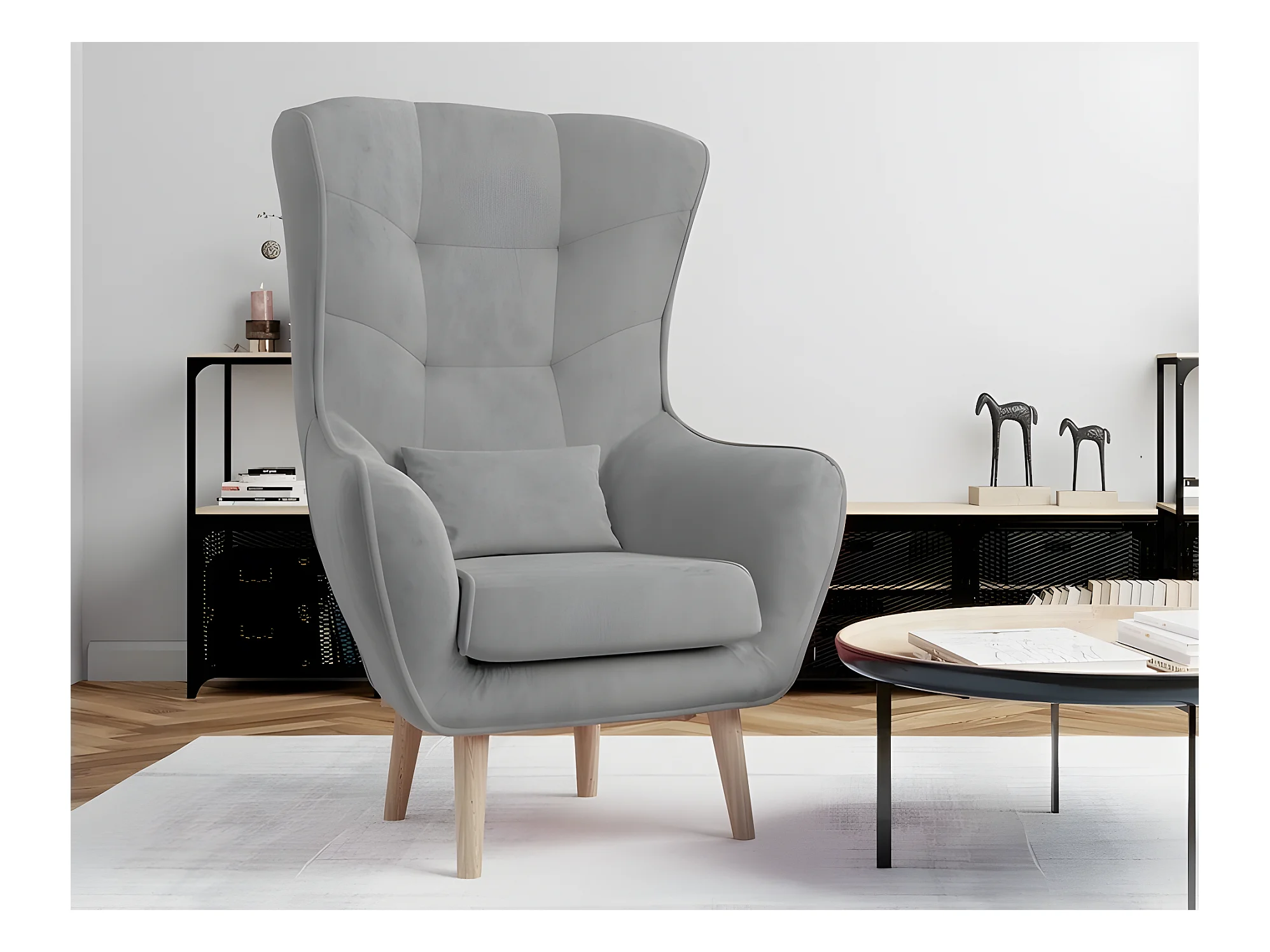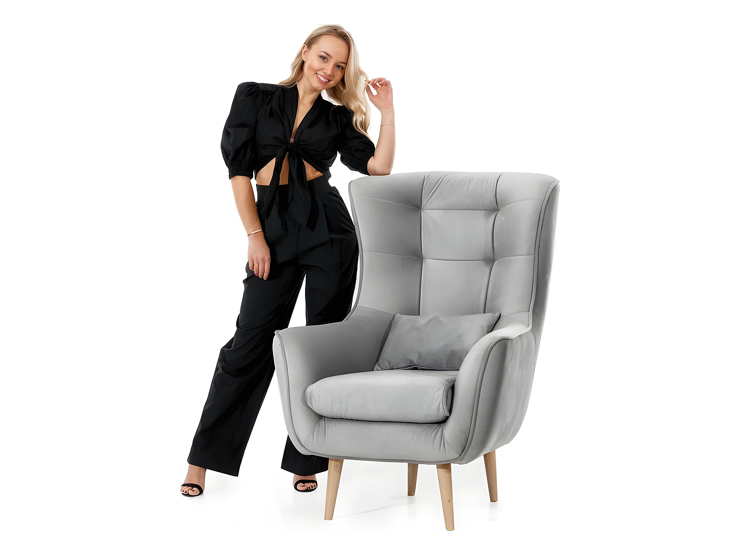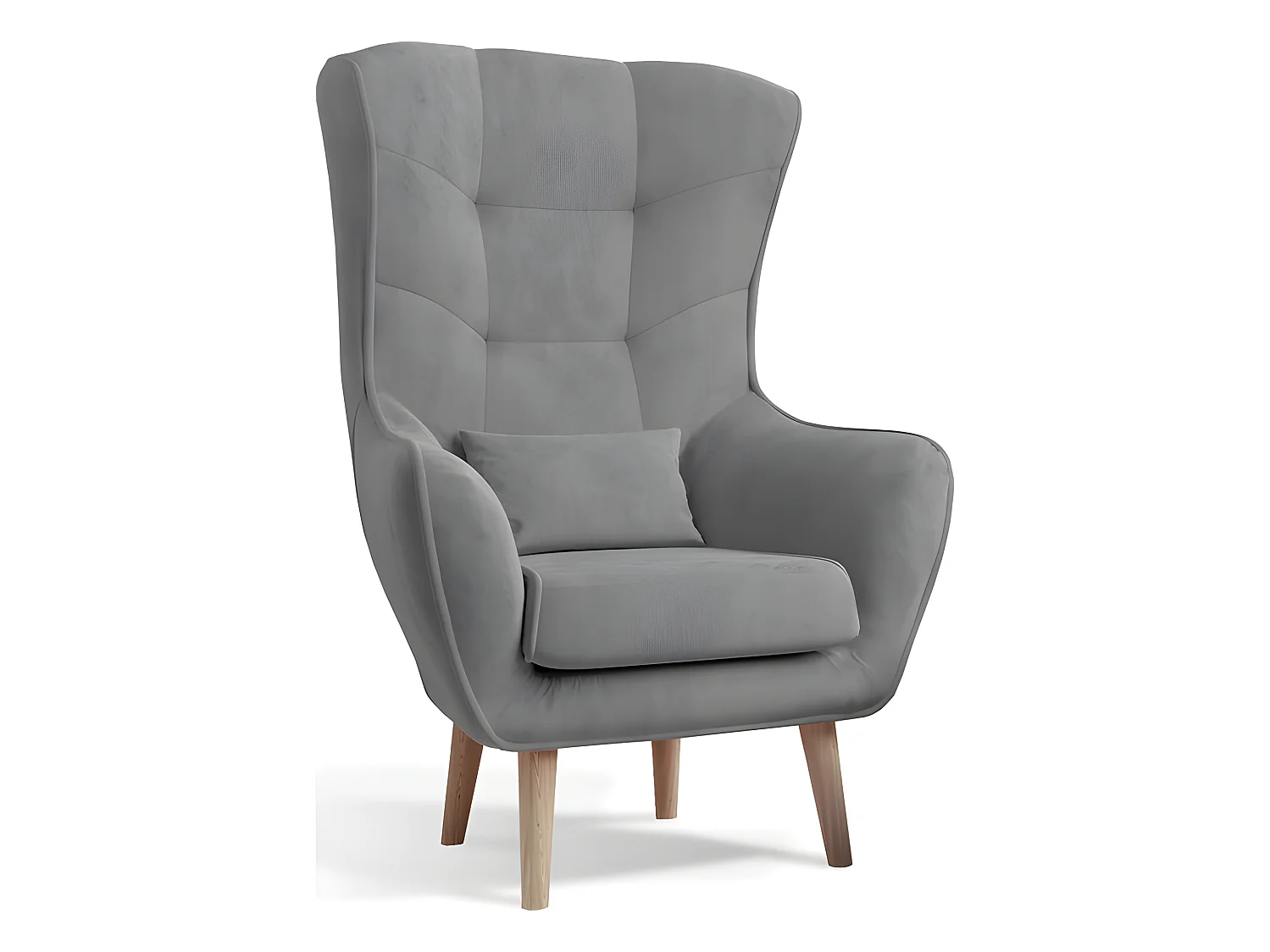 Luxe donkergrijze fluwelen fauteuil met hoge armleuningen en houten poten
