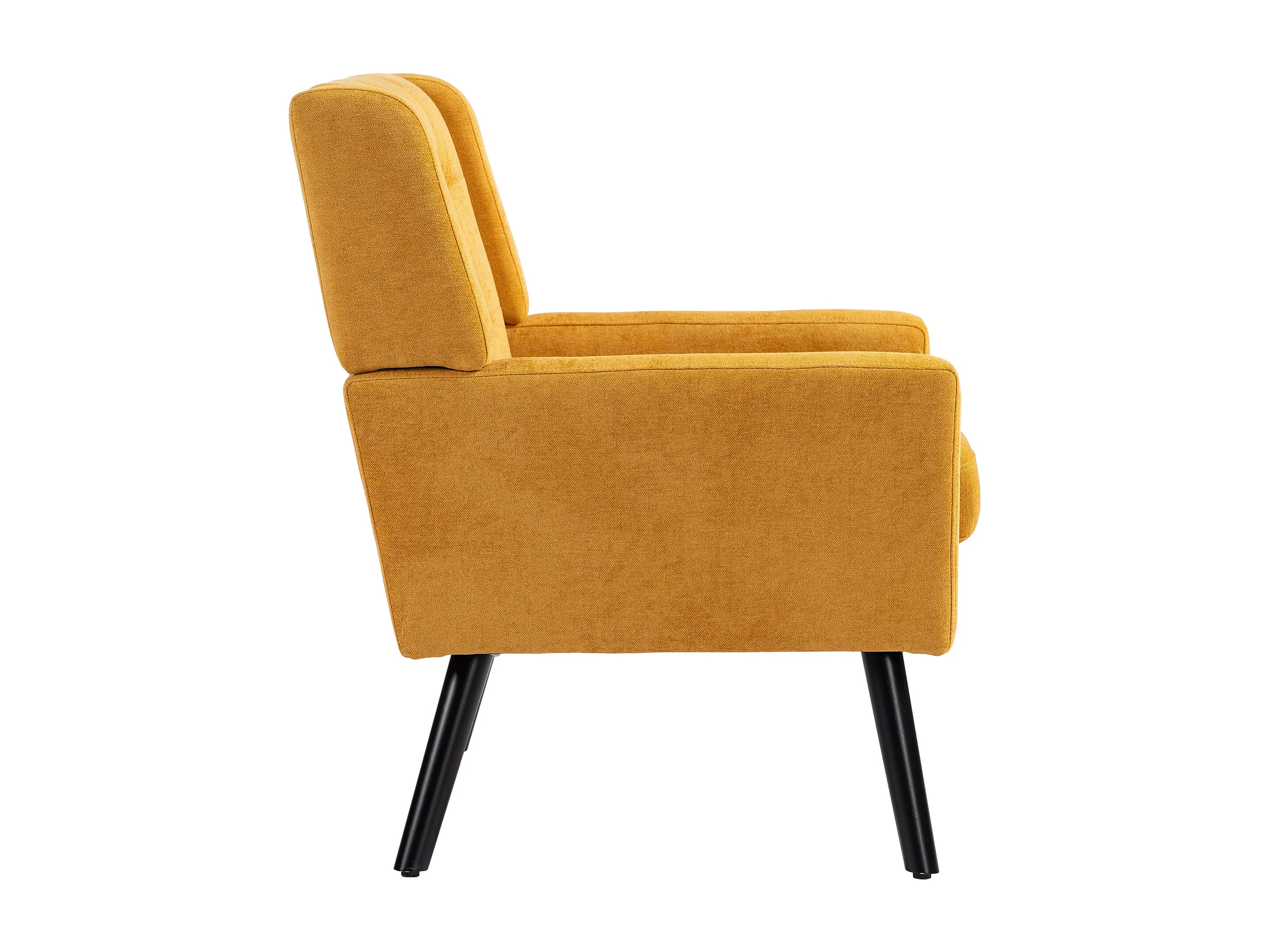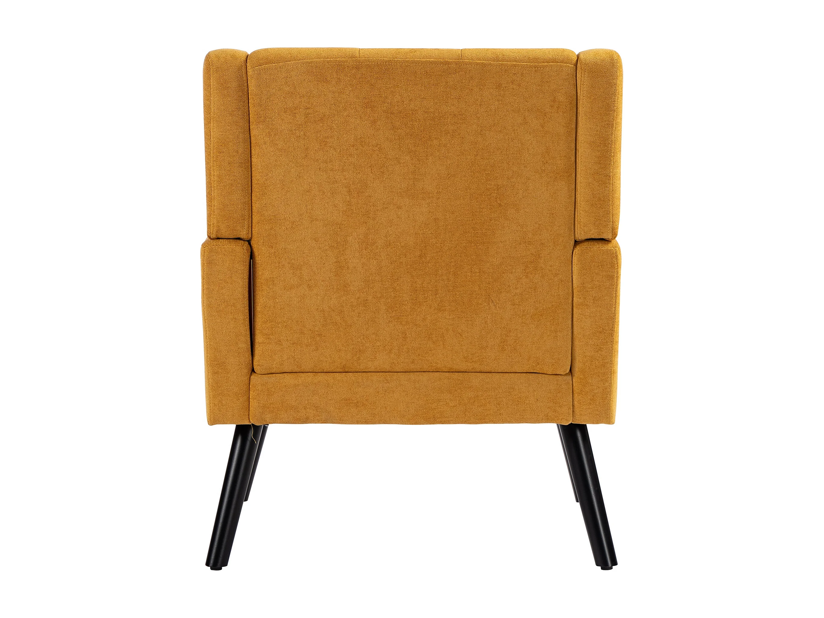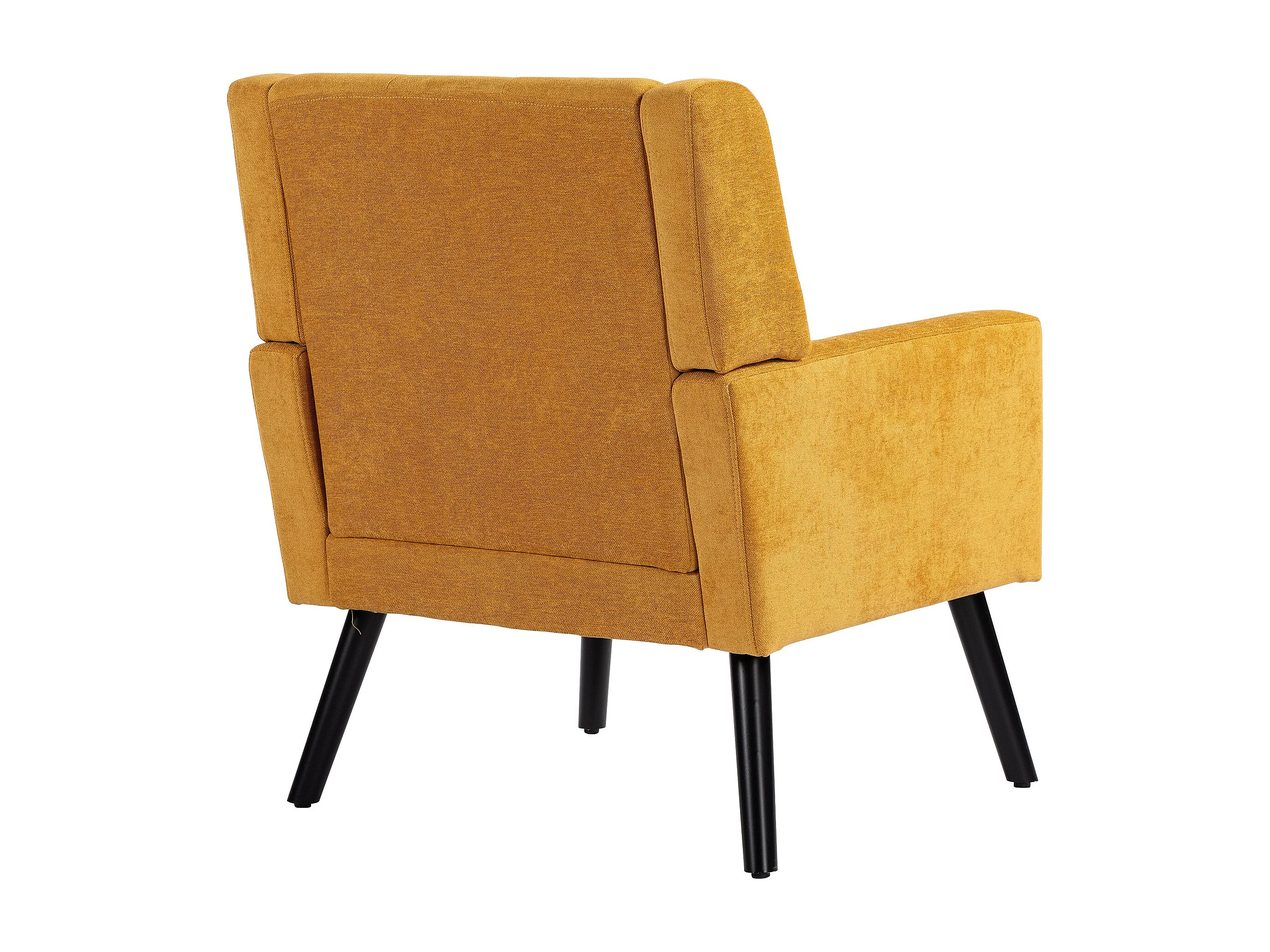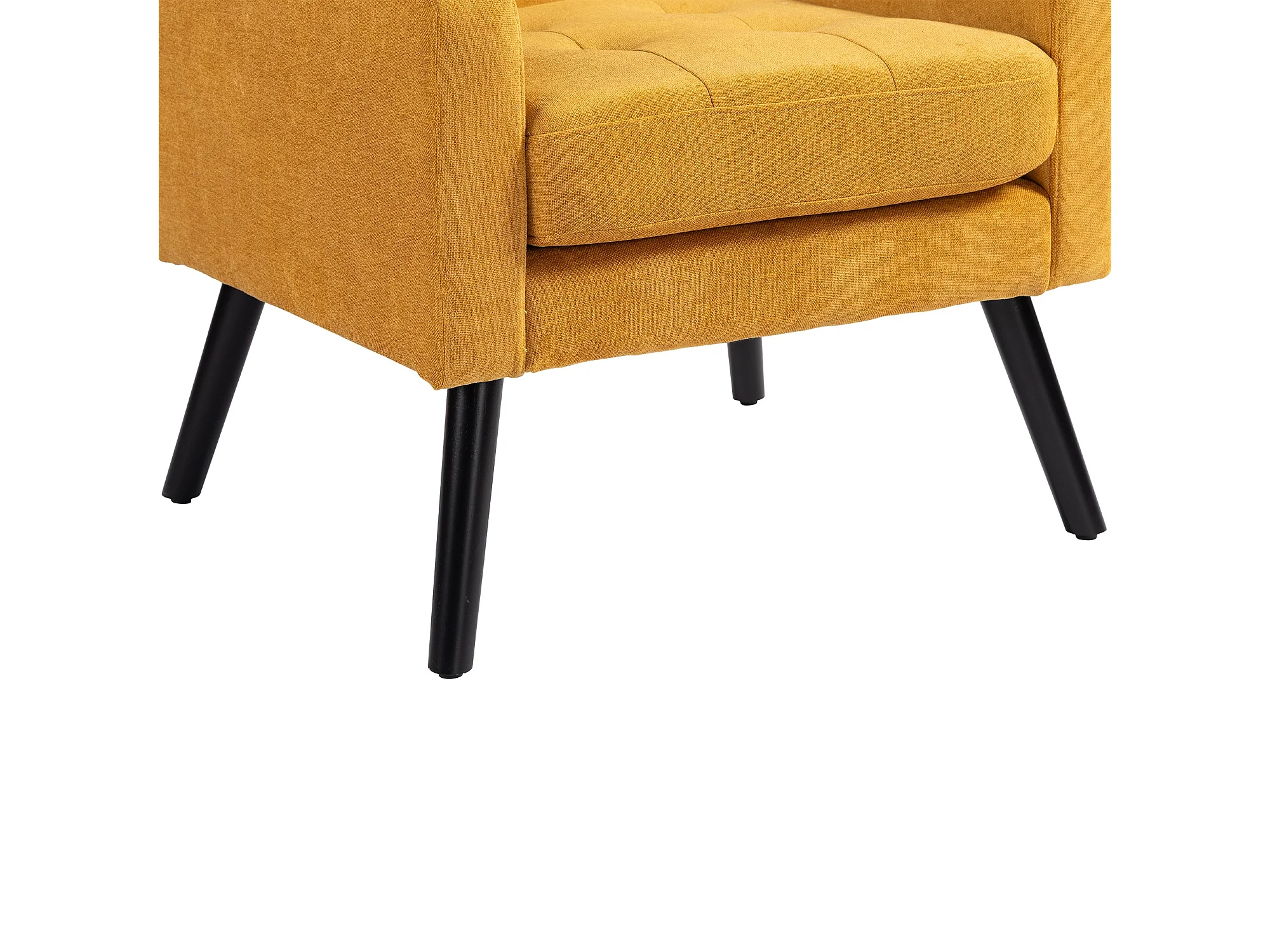 Fauteuil bekleed met gele linnen stof en houten poten.