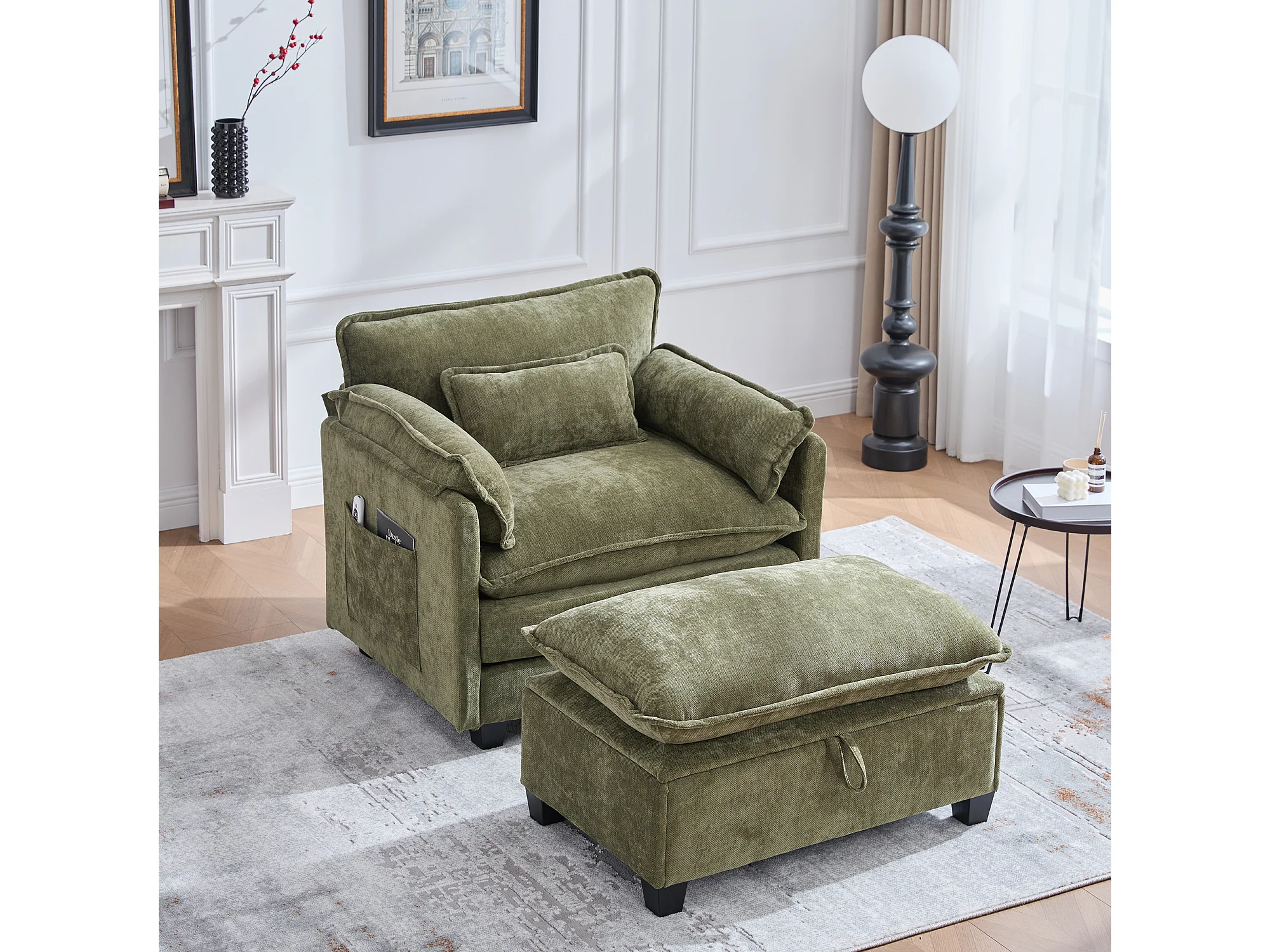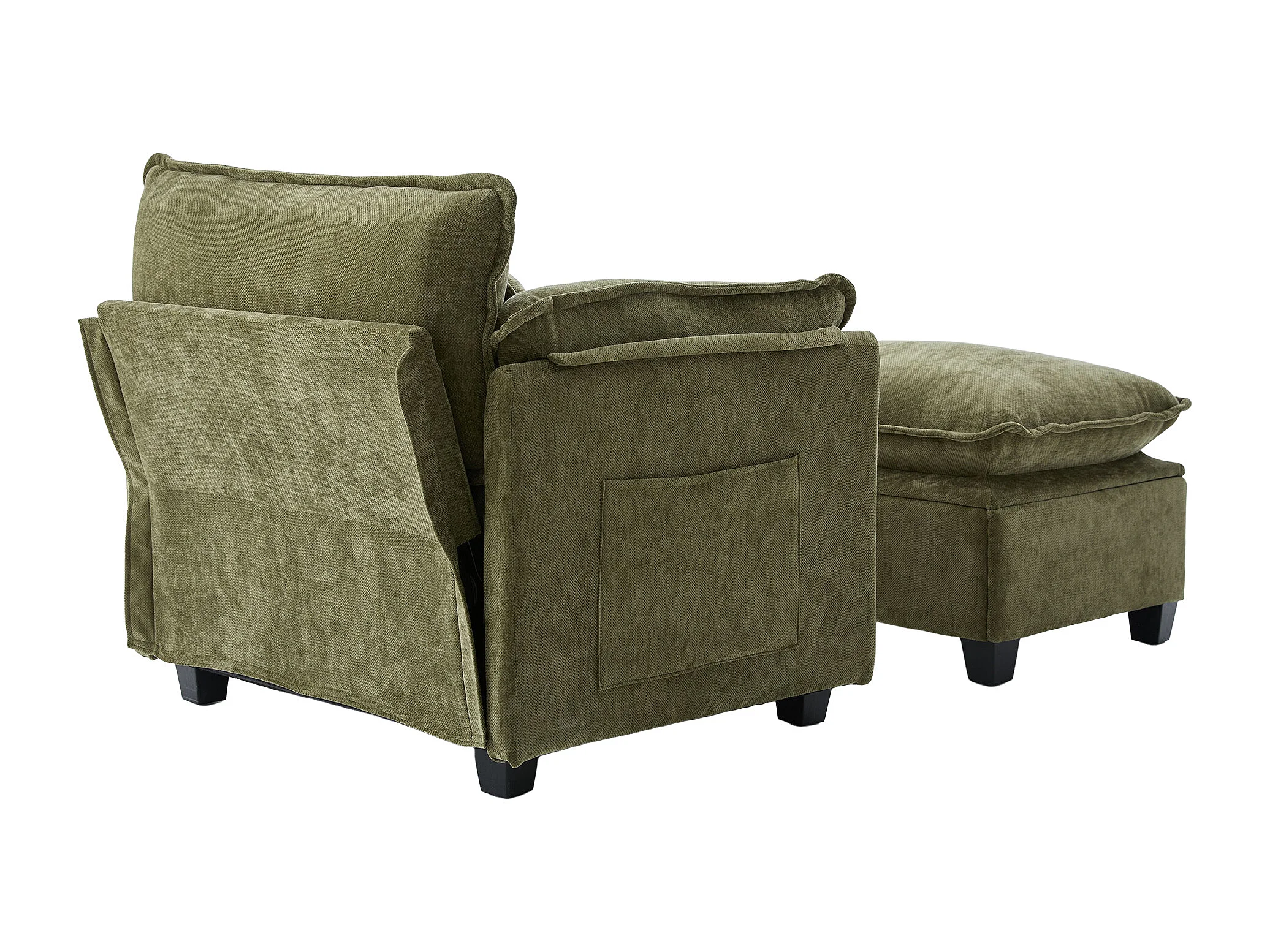 Fauteuil met opbergruimte voetenbank en kussen - Chenille stof - Olijfgroen