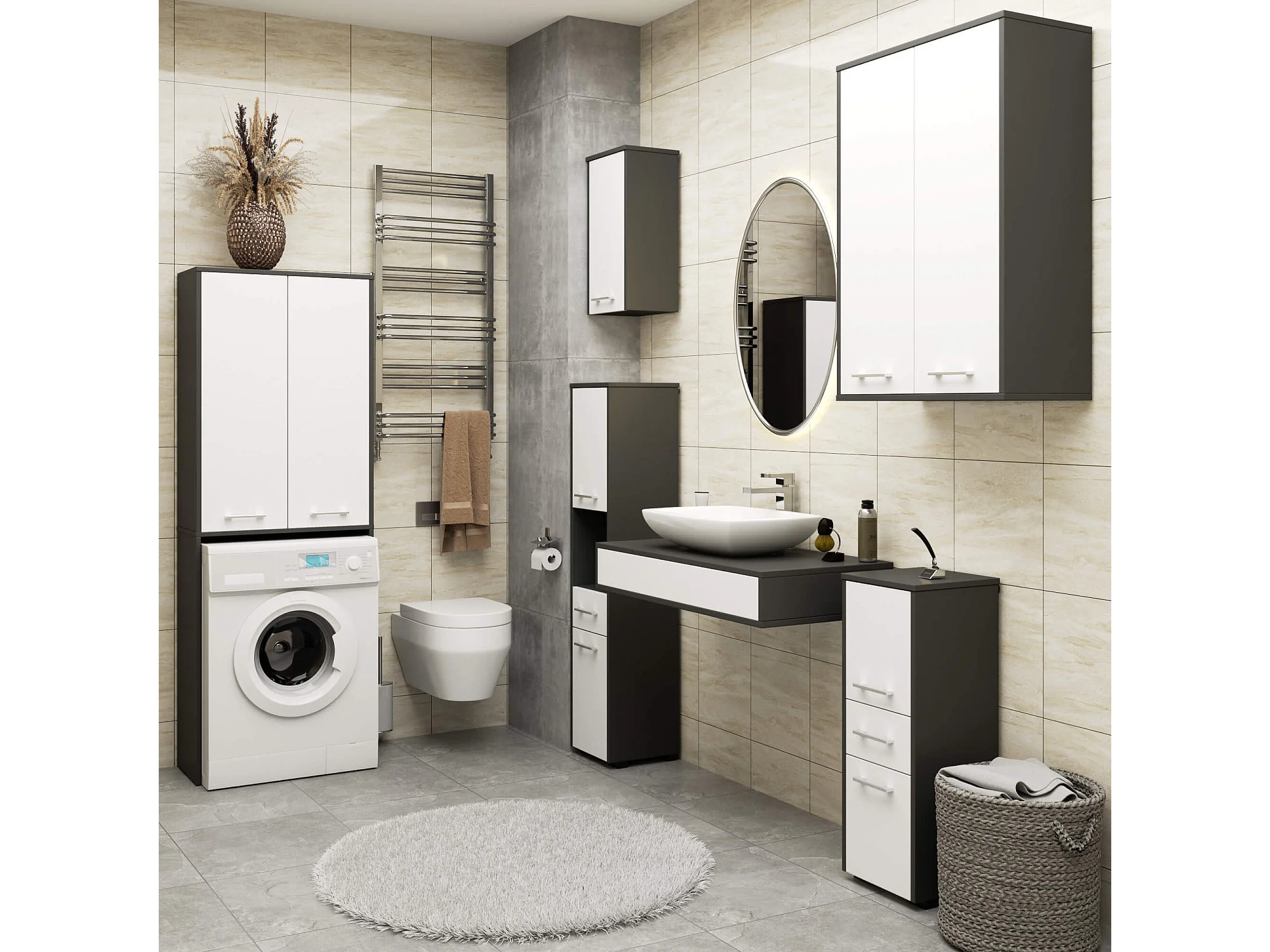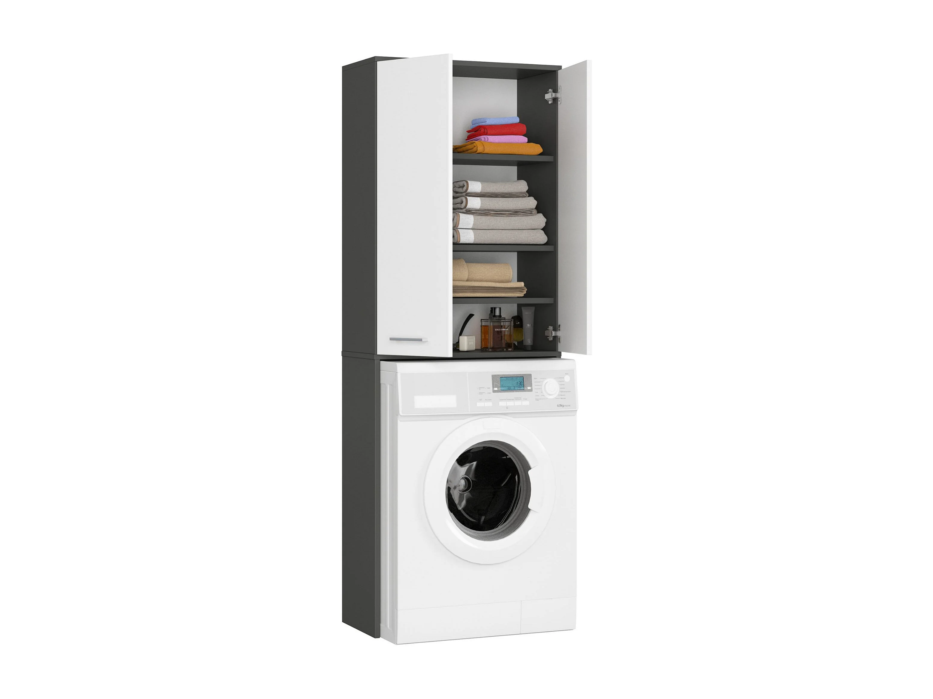 Badkamerkast voor Wasmachine FIN / Hoge Wasmachinekast met 2 Deuren / AKORD Furniture Factory / Grafietgrijs - Wit / 64 x 180 x 30 cm