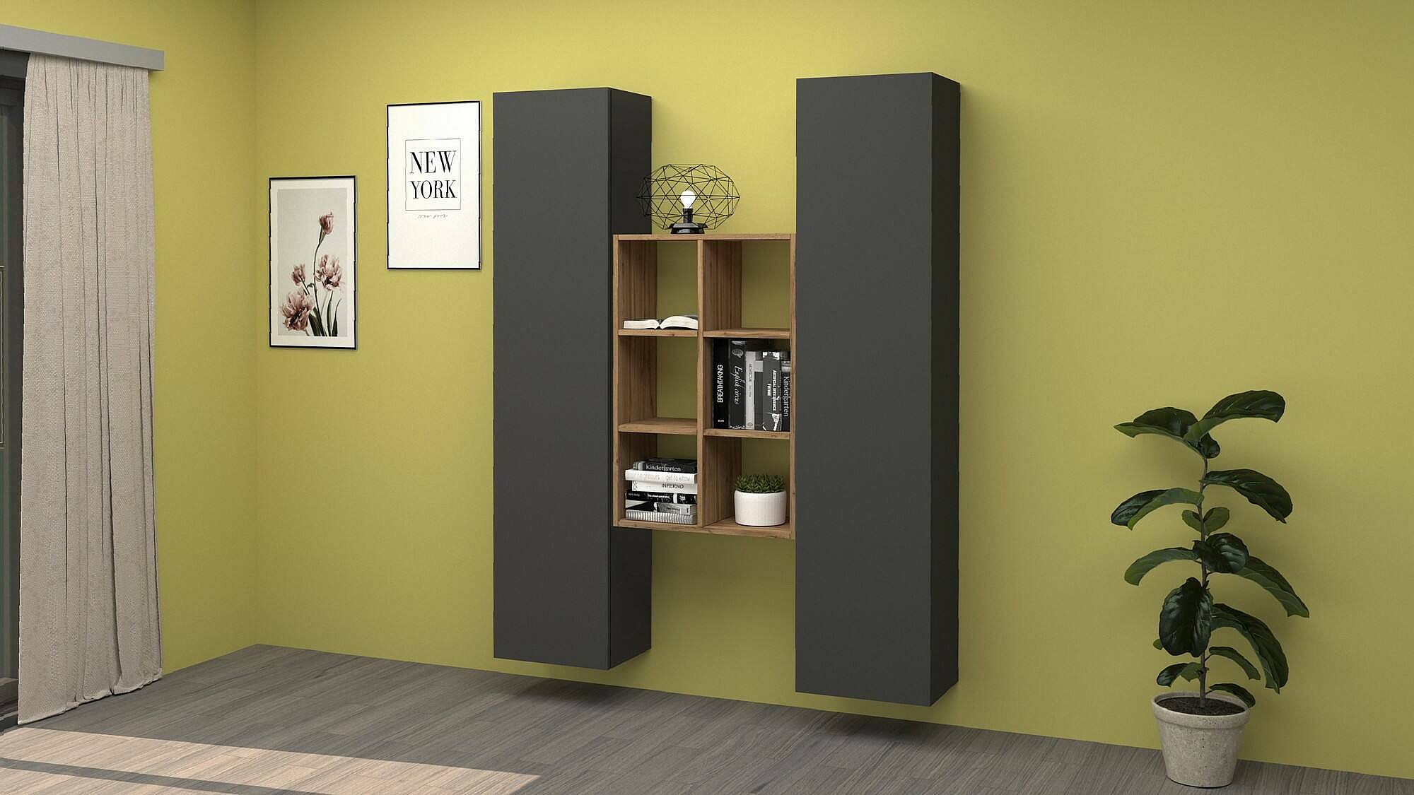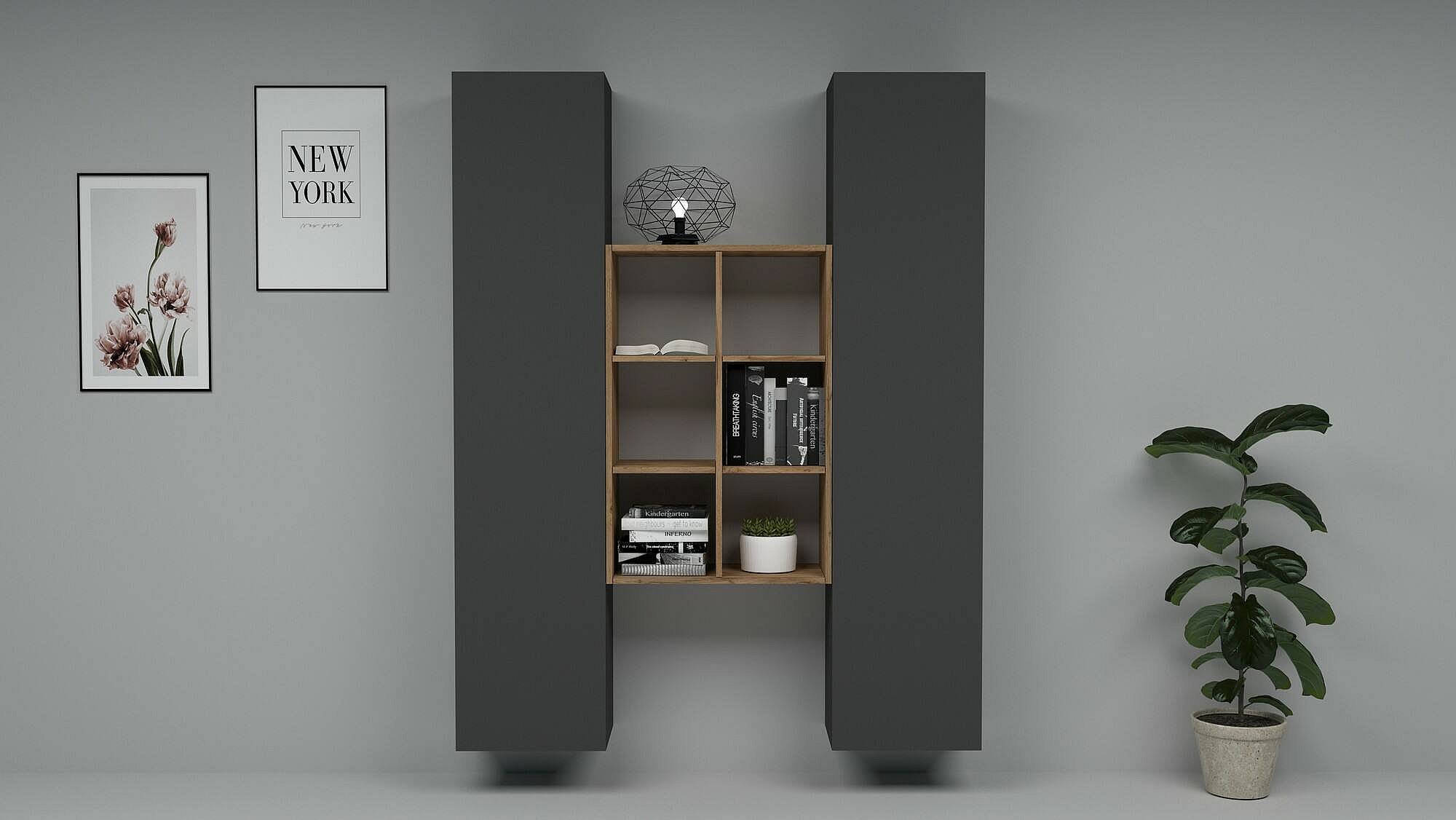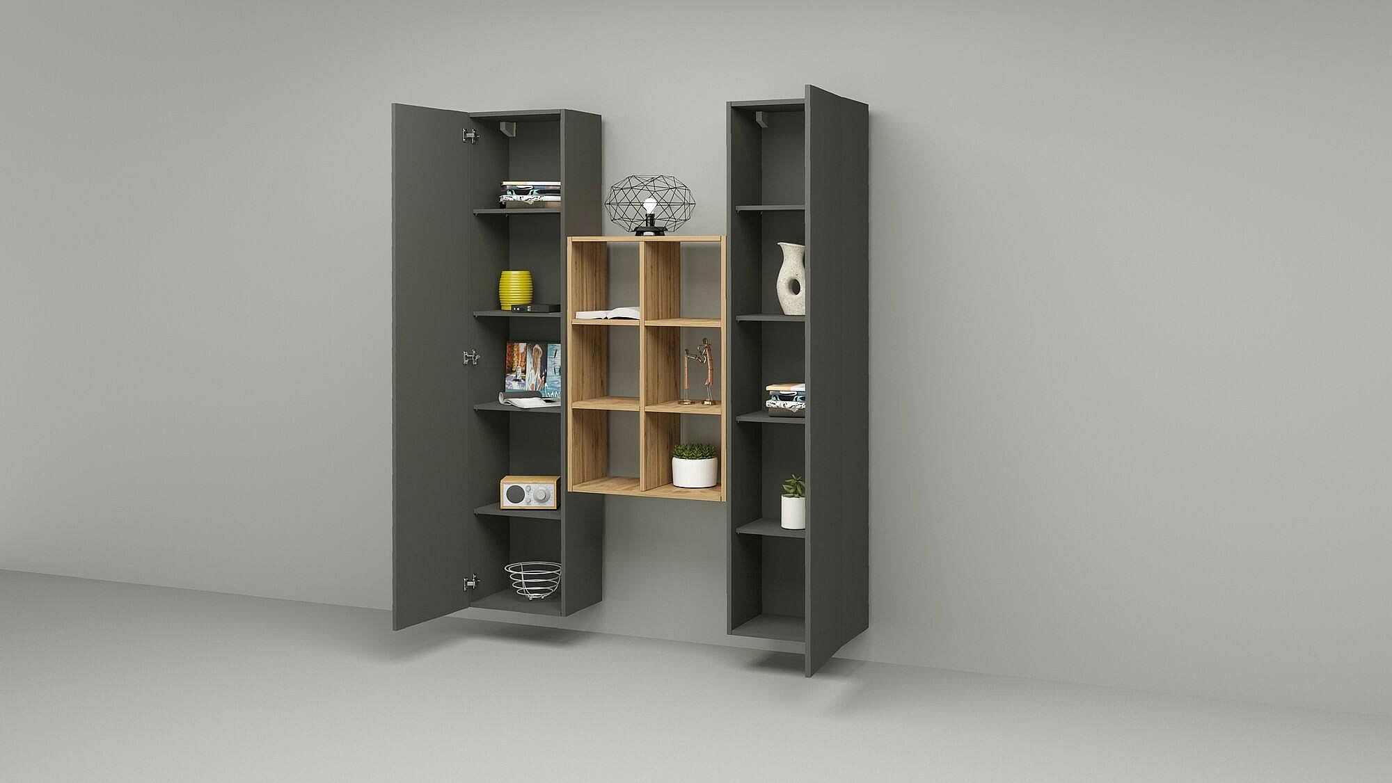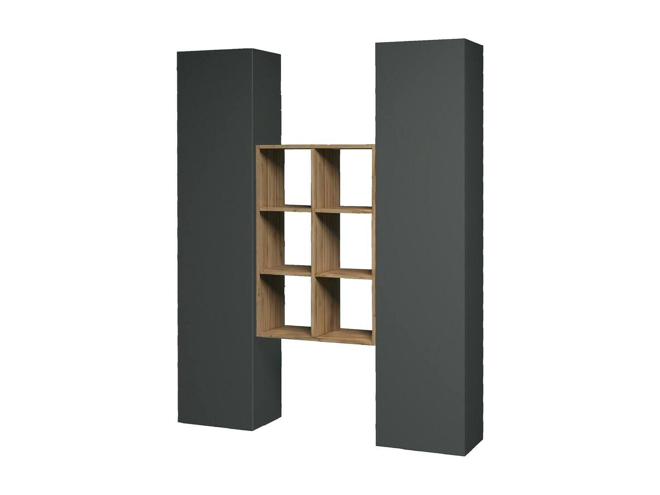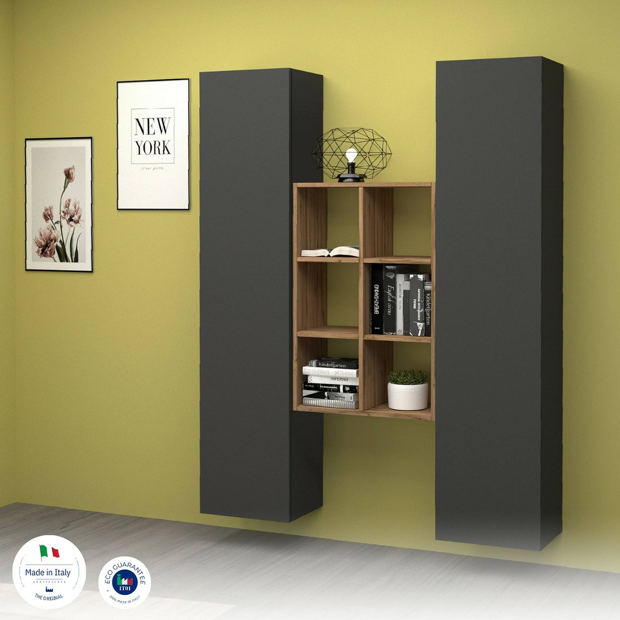 Franco dressoir, Woonkamerset met 2 deuren en planken, Woonkamerbuffet, Keukendressoir, 100% Made in Italy, 140x30h180 cm, Antraciet en Esdoorn