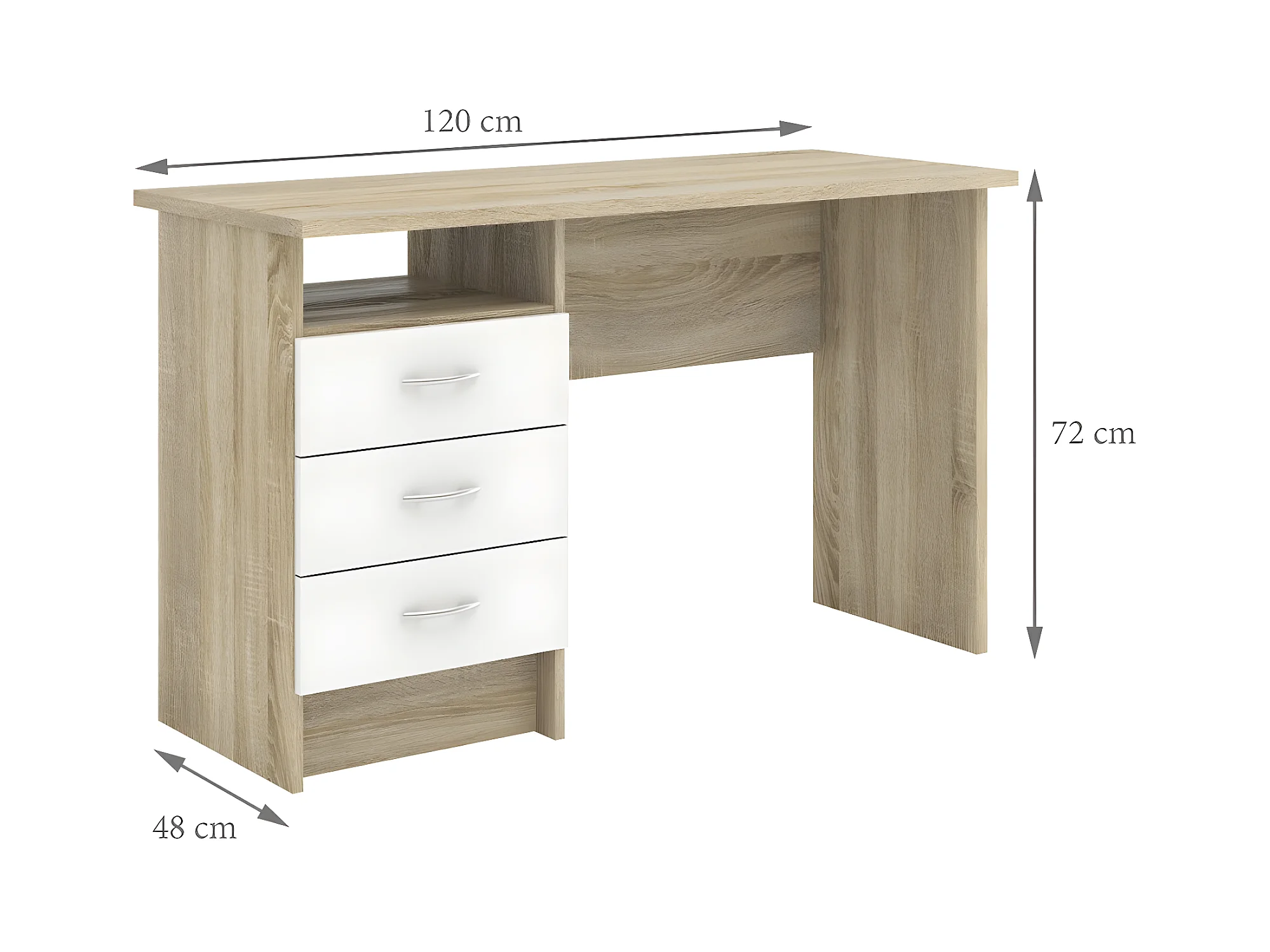 Lineair bureau met drie laden, kleur wit eiken, afmetingen 120 x 72 x 48 cm
