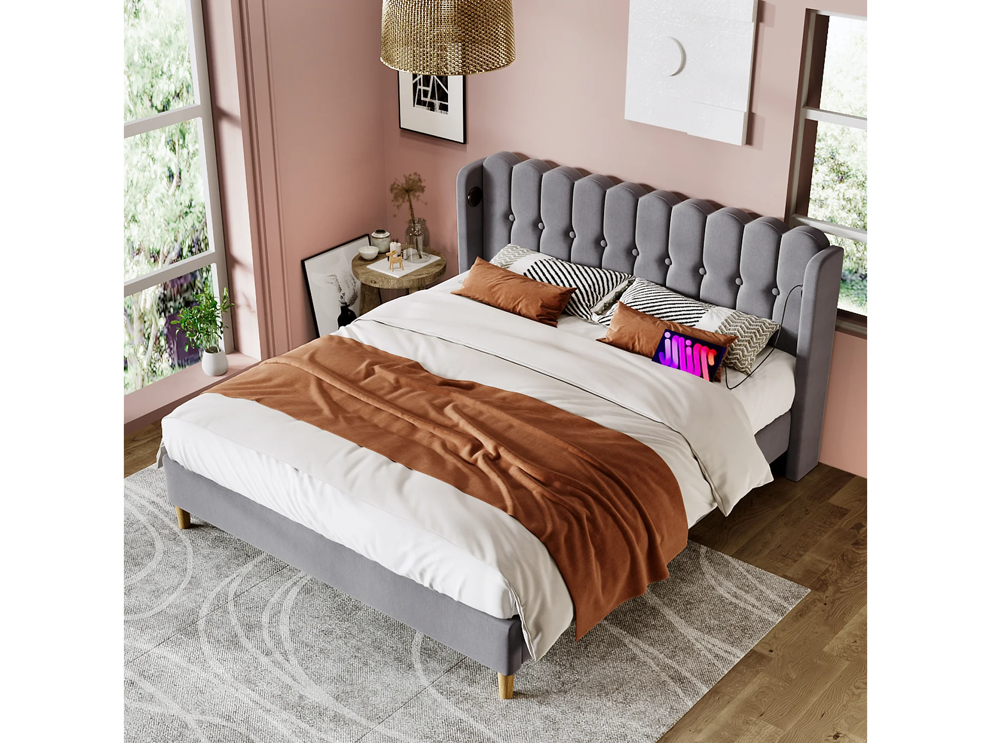 Gepolsterd Bed Double USB Type C Met Sommier, 160×200, Lin Gris, Cadre Voor Chambre ou Invités (met Matelas)