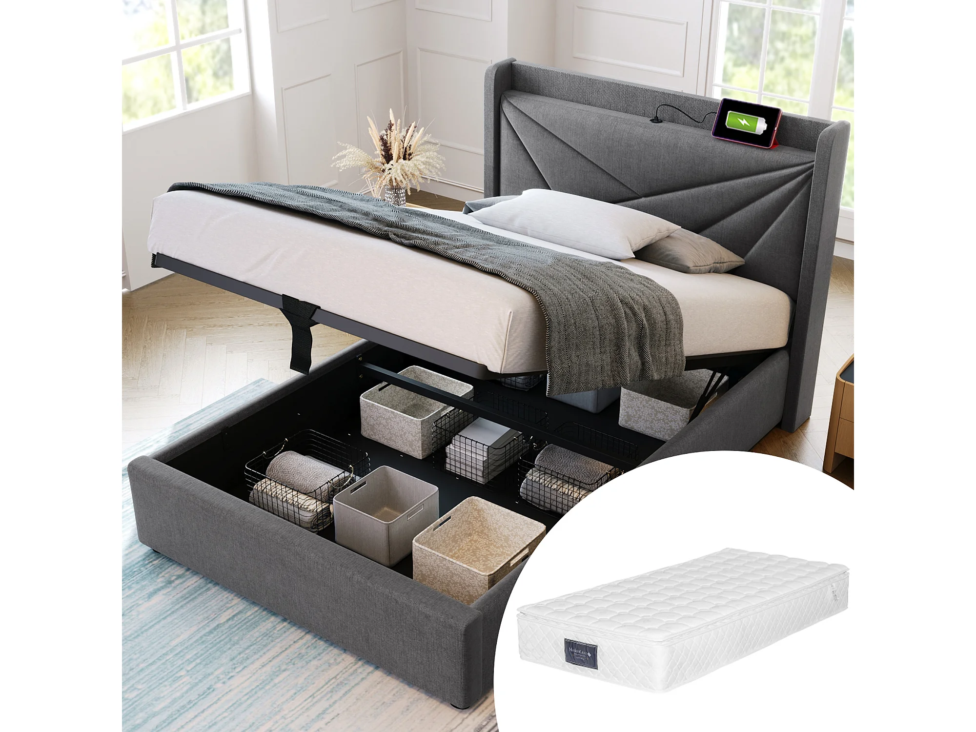 Gepolsterd Bed Eenpersoons Met Opbergruimte 90x200 Cm, Opbergruimte, Hoofdeinde Met USB Type-c, Cadre En Linnen, Met Lattenbodem En Matras