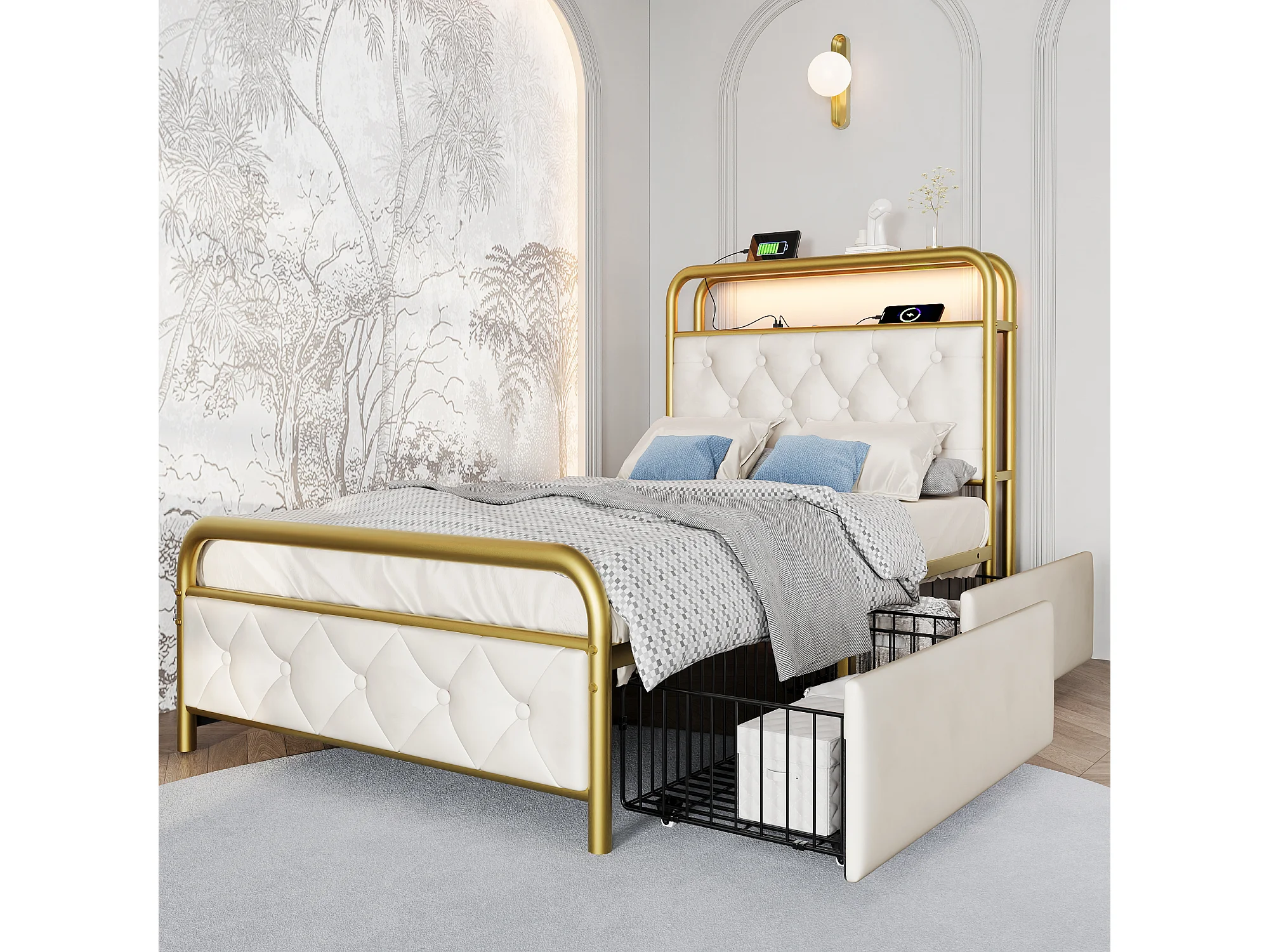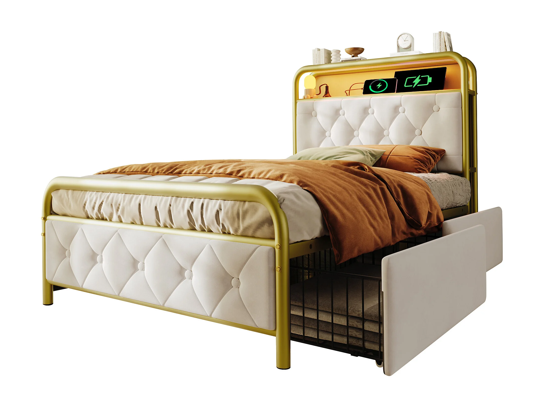 Gepolsterd Bed Eenpersoons Met USB Type C, Fonction Van Charge, App-control, LED, Metaal 90x200, 2 Lades, Velours (met Matras)