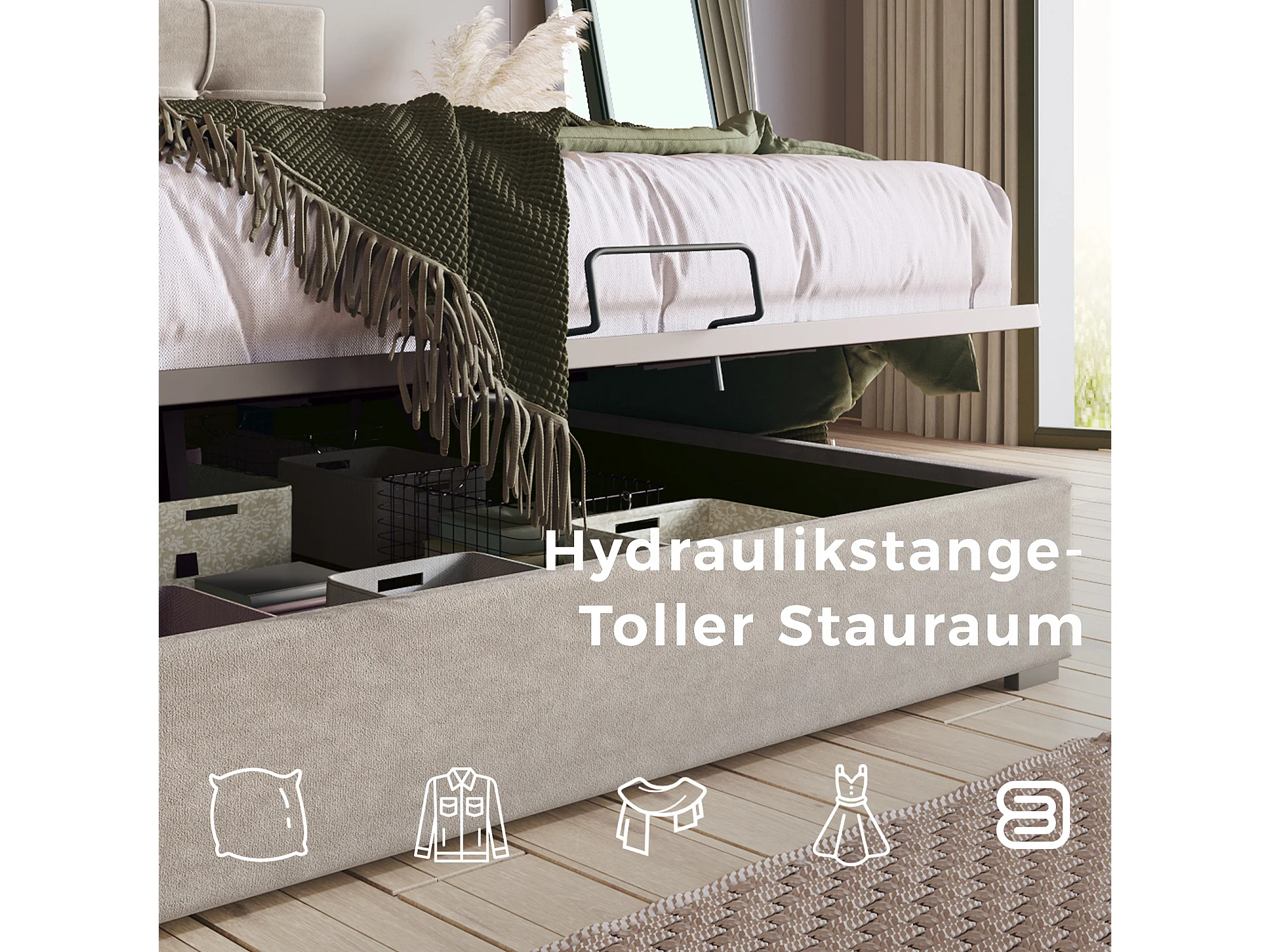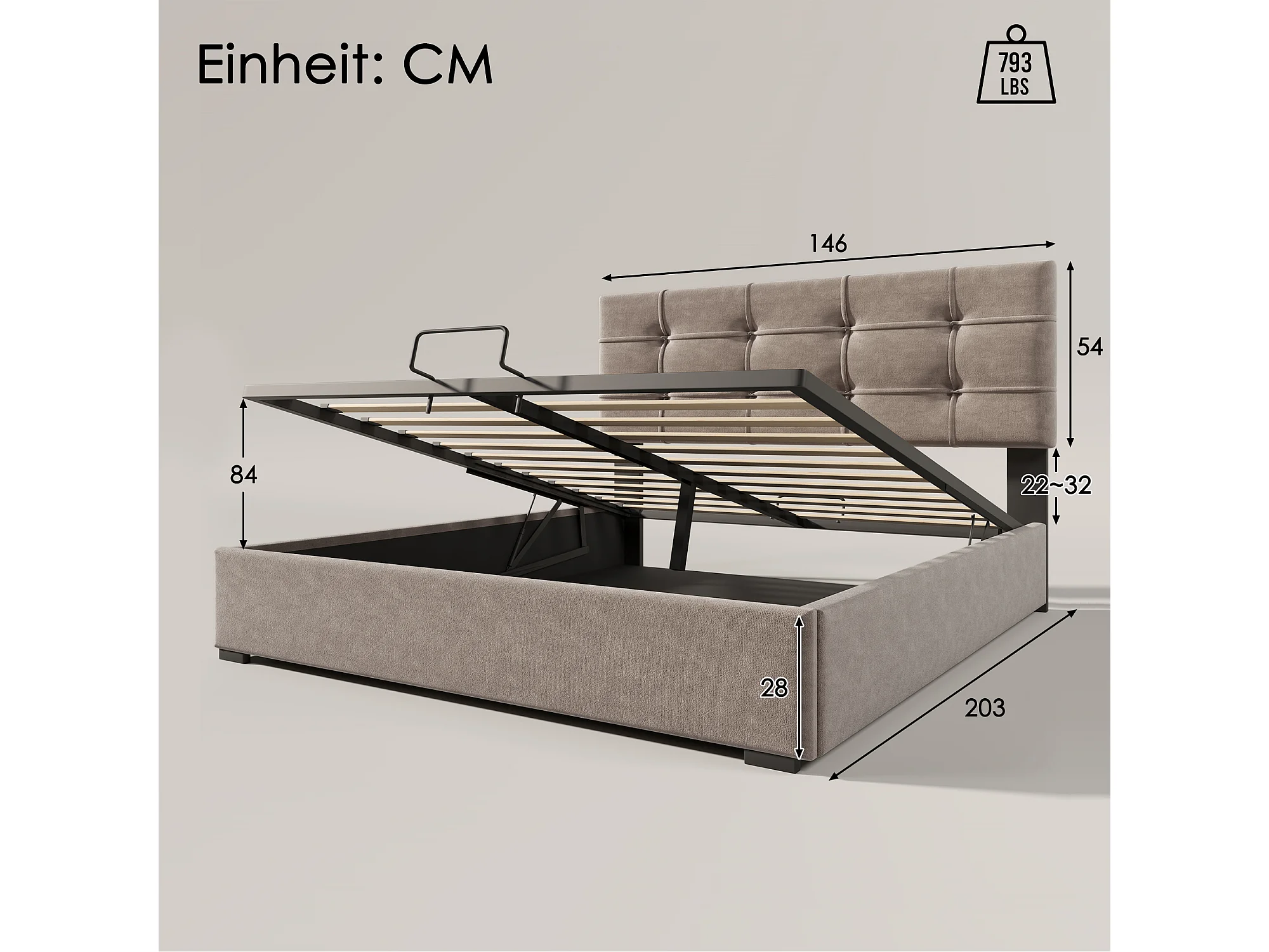 Gepolsterd Bed Tweepersoons Hydraulisch 140x200 Cm, Tête Réglable, Lattenbodem Metaal, Cadre Velours, Opbergruimte Geïntegreerd, Licht Grijs, Met Matras