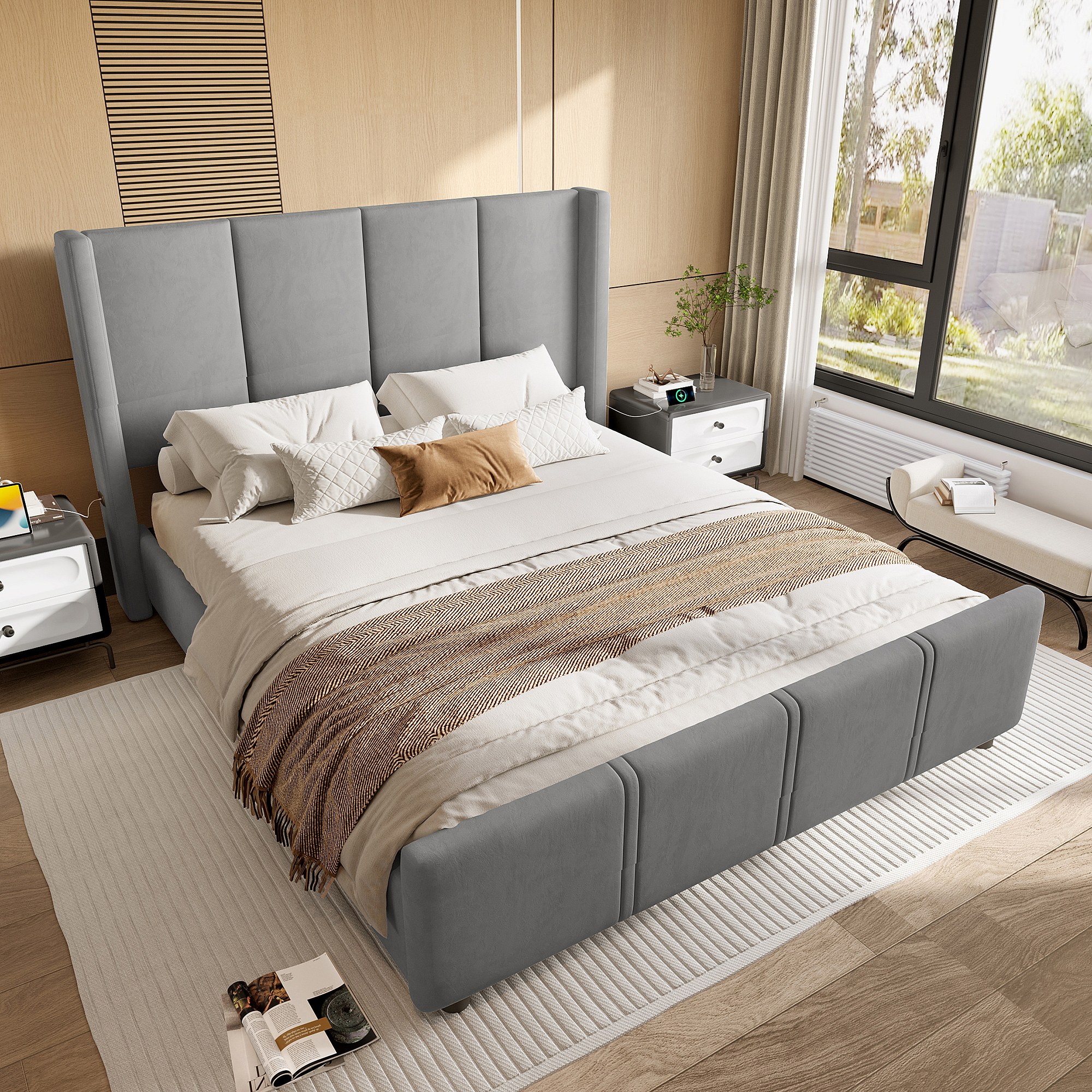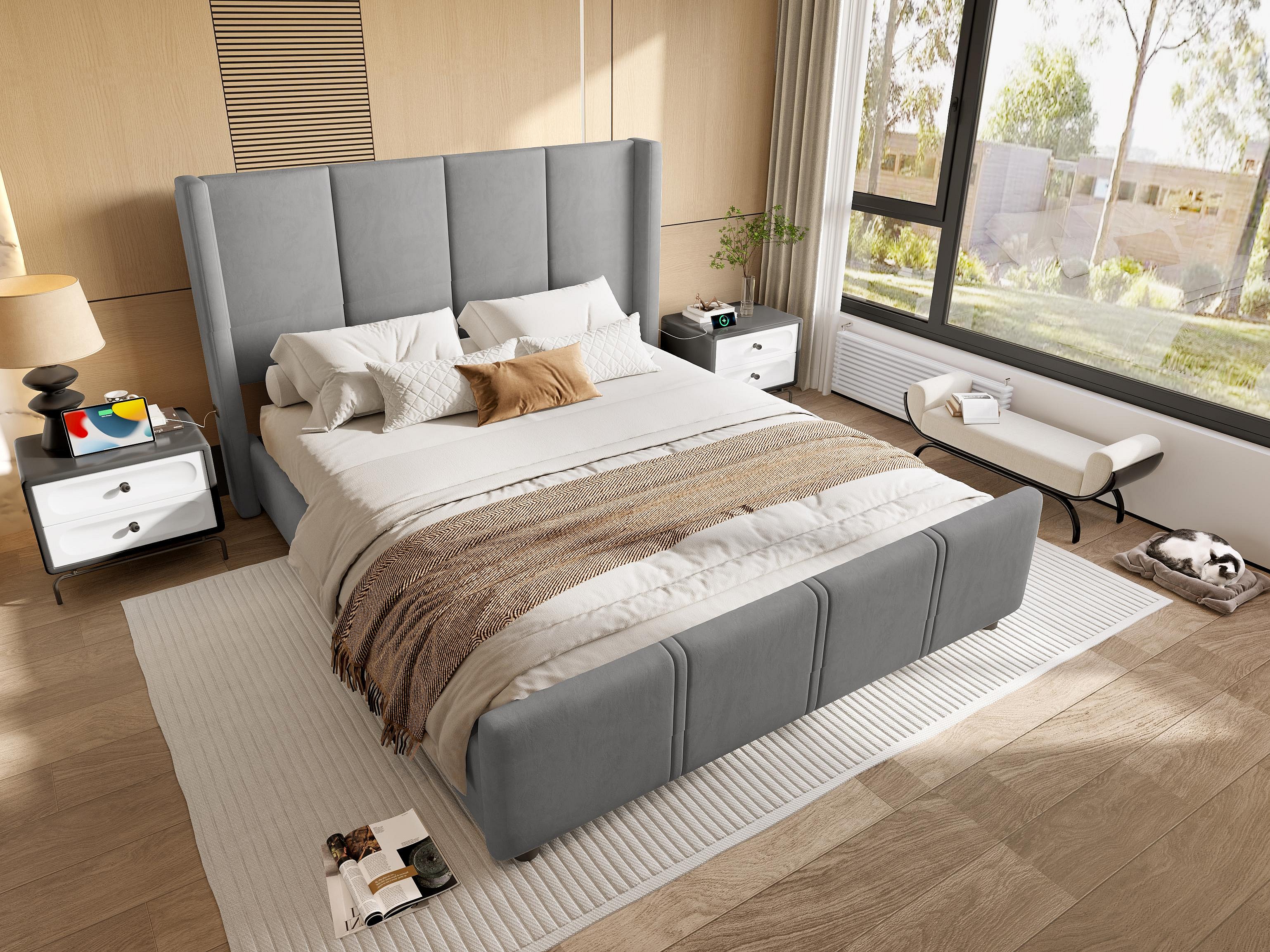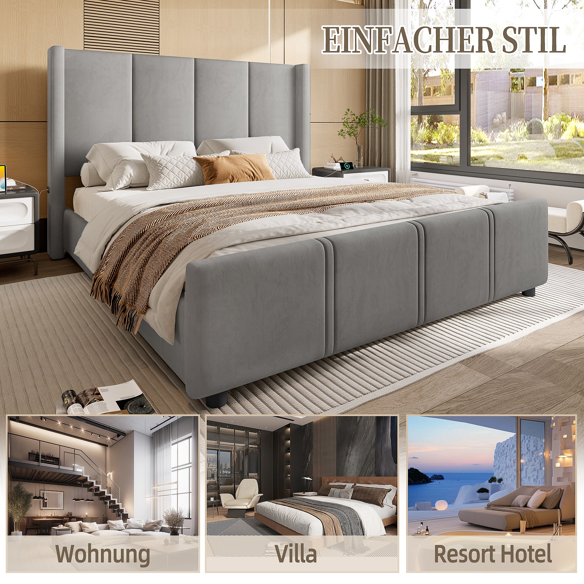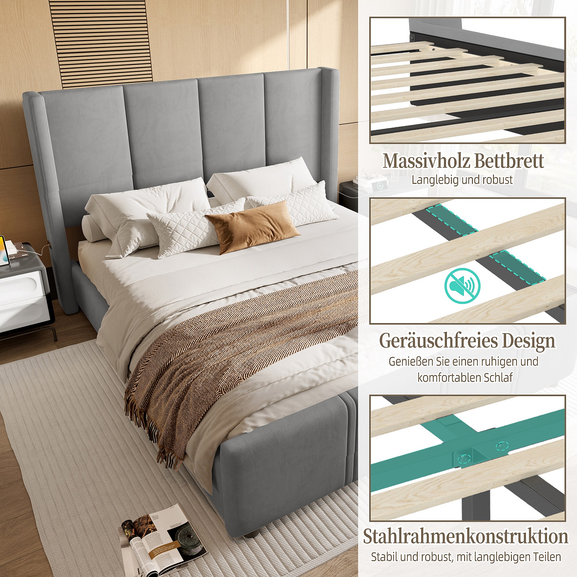Gepolsterd dubbelbed 140x200 cm - met hoog hoofdeinde & voeteneinde in luxe fluweelstof | Geïntegreerde USB/Type-C aansluiting