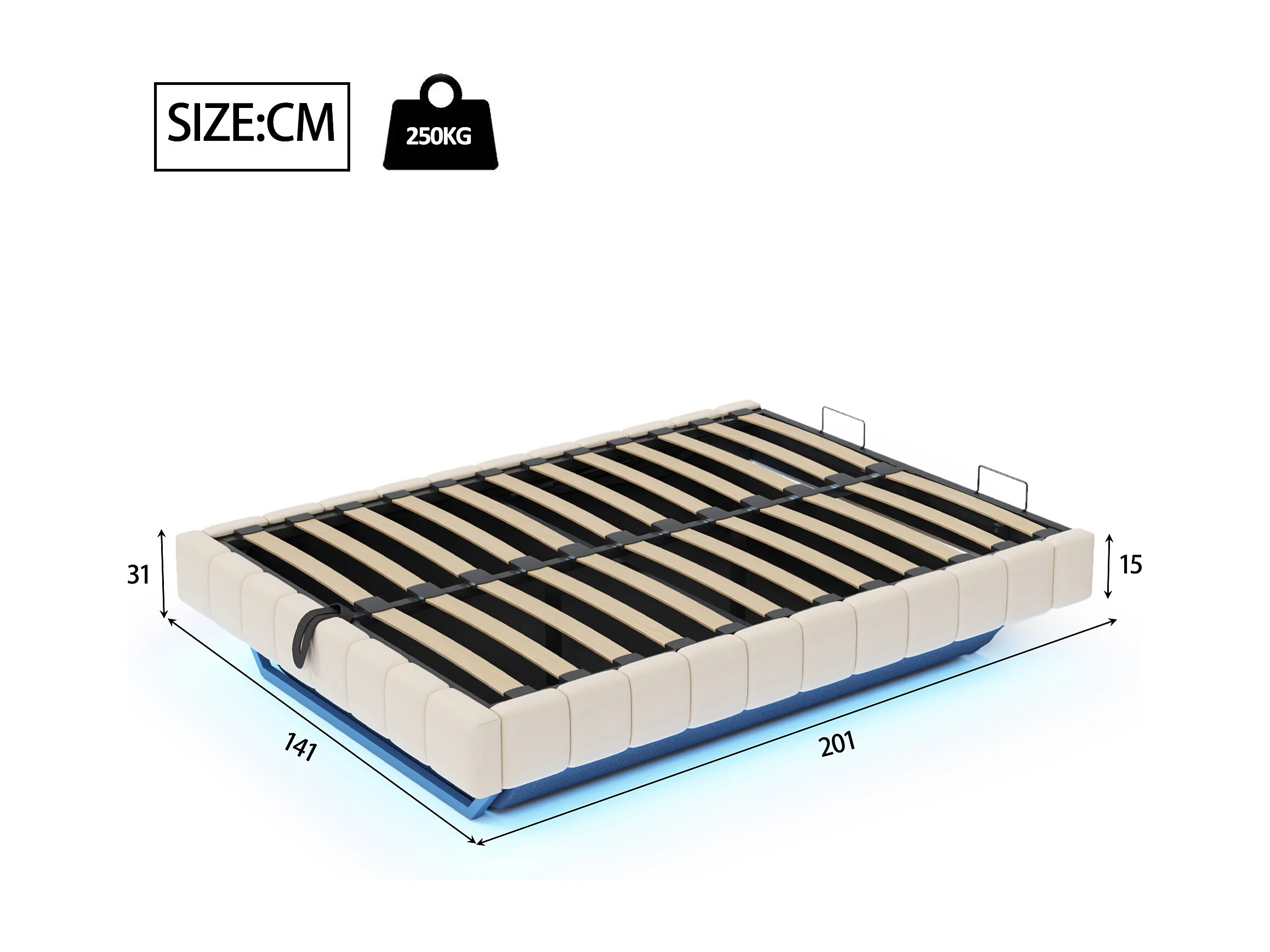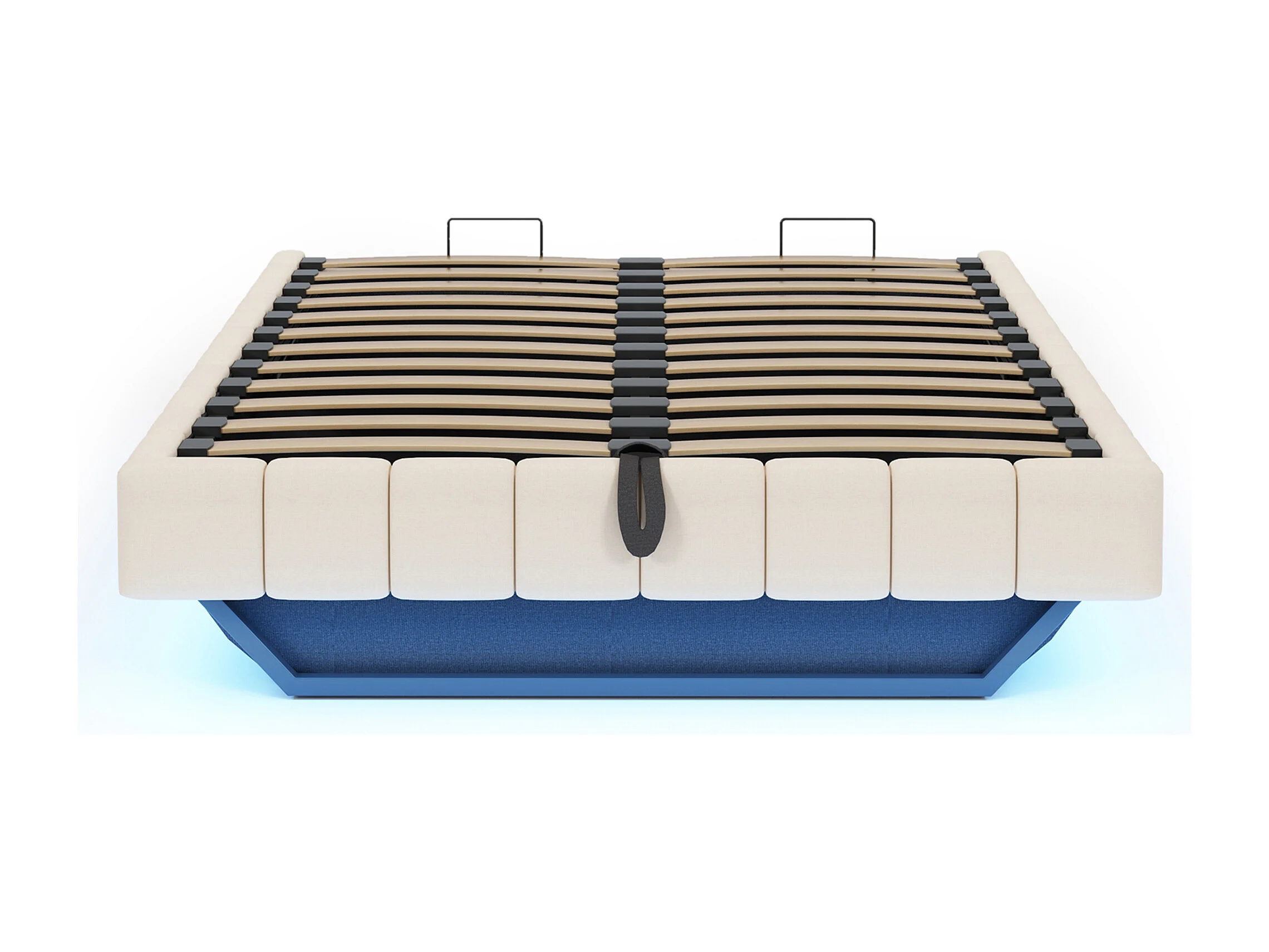 Gestoffeerd bed 140x200 cm zonder hoofdeinde – hydraulisch zwevend frame, LED, geïntegreerde opbergruimte – Beige linnen (zonder matras)