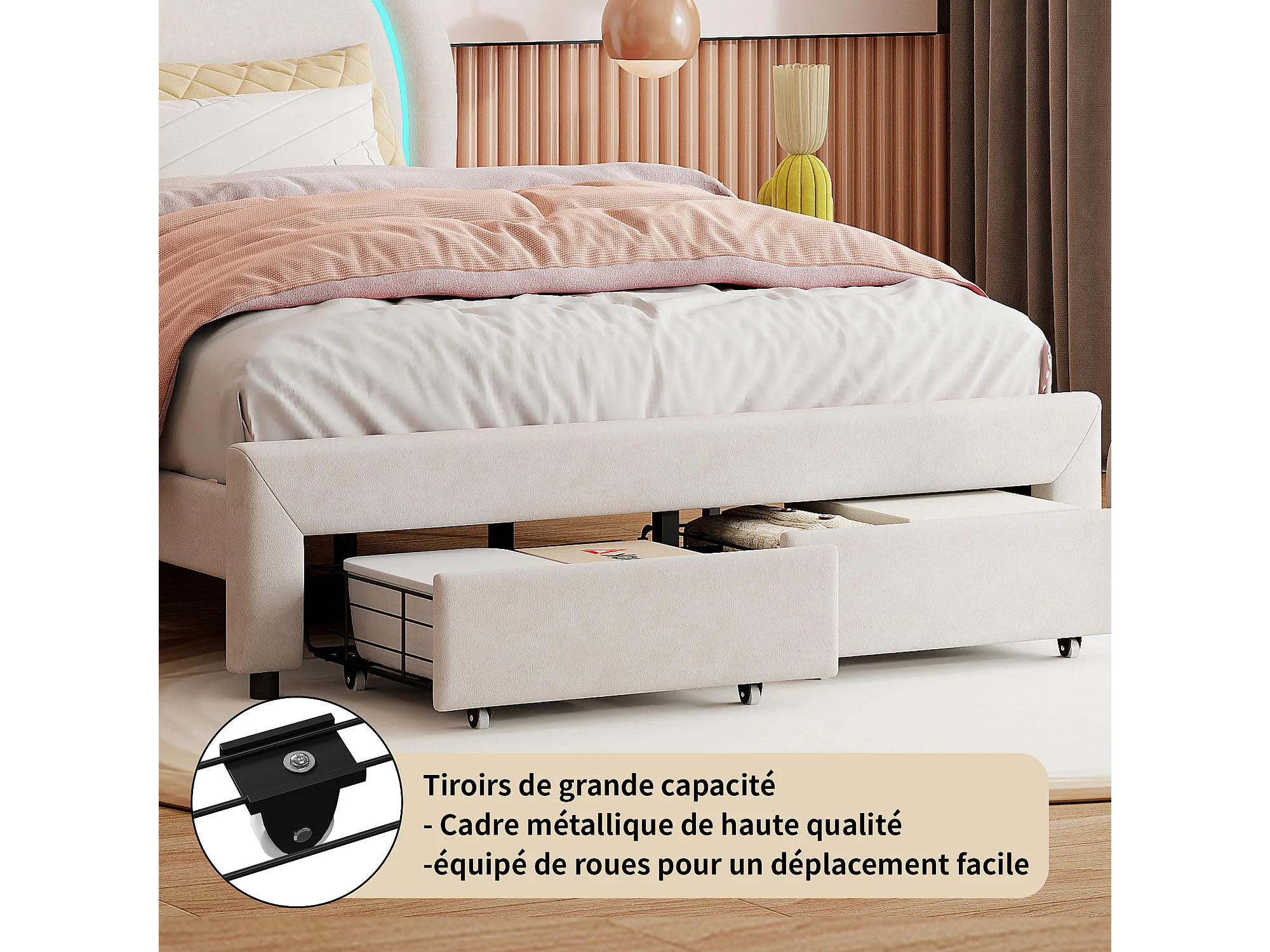 Bed van 140x200 cm in beige fluweel met lades, hoofdbord met veelkleurige LED's, USB/Type-C en opbergruimte onder het bed