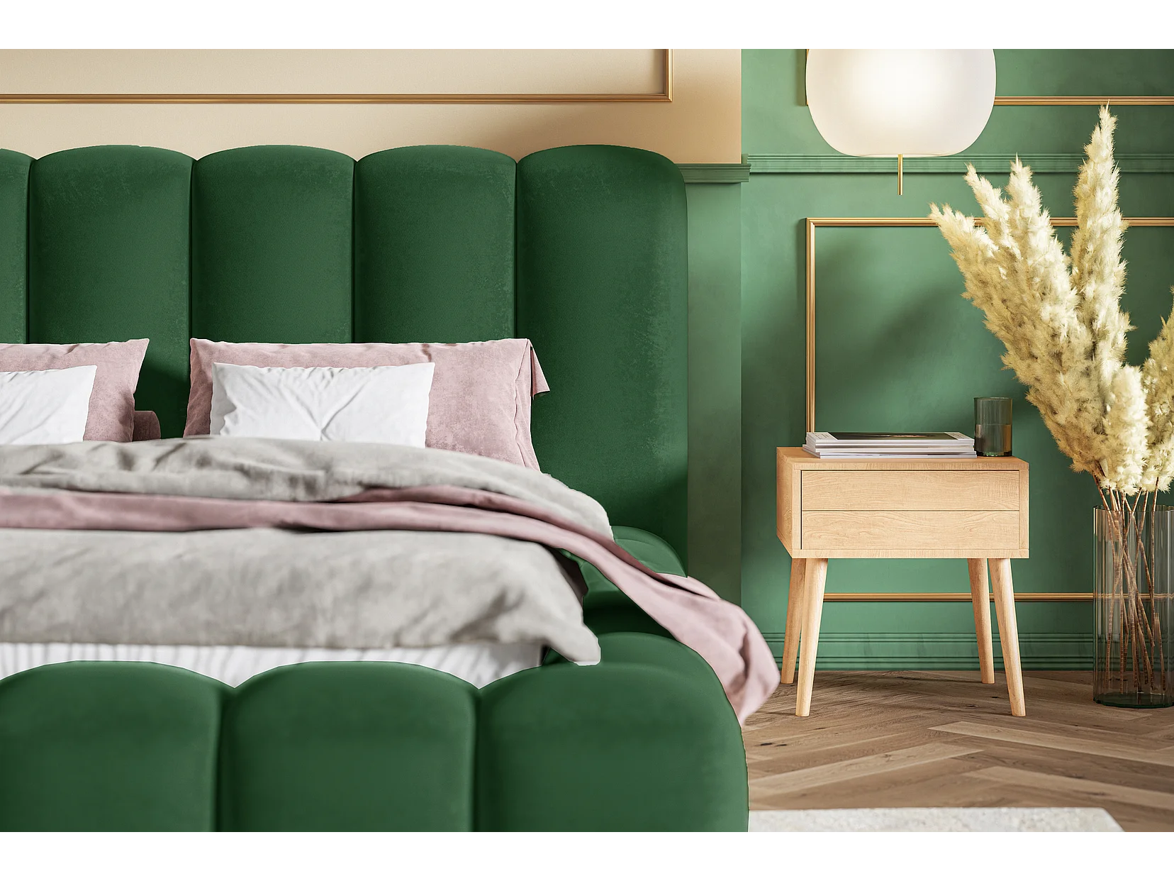 Gestoffeerd bed 160x200 Madeno - metalen lattenbodem, opbergruimte - fluweel, Groen (Amor Velvet 4311)