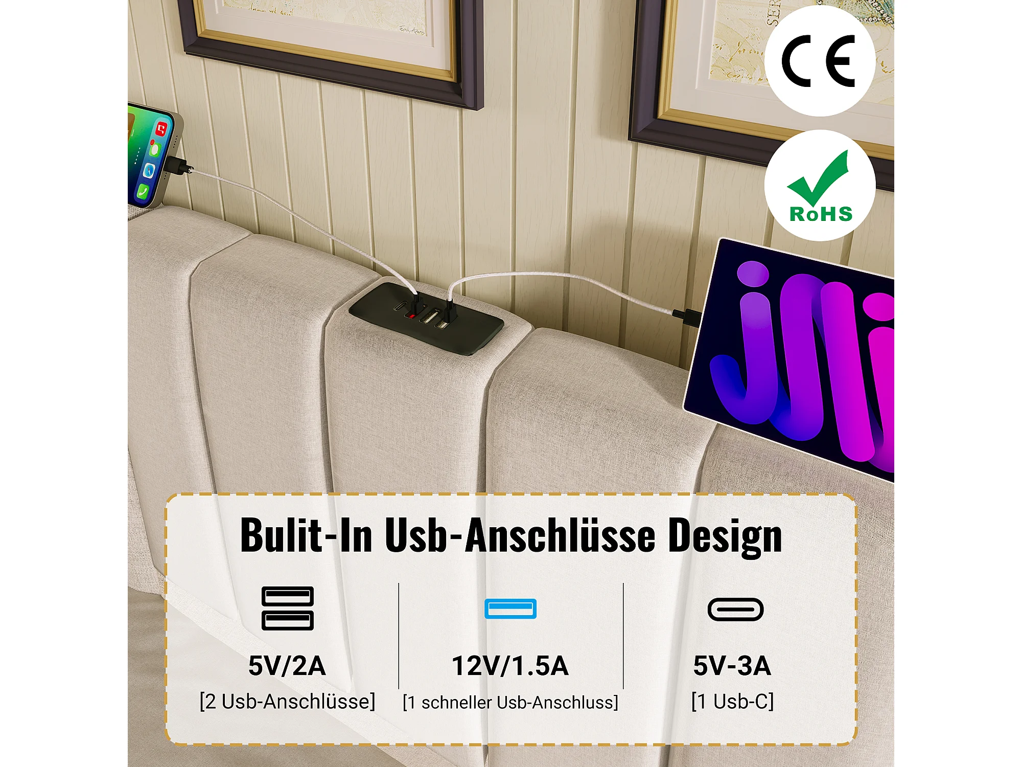 Gestoffeerd bed 180x200 cm,tweepersoonsbed met opbergruimte,LED-verlichting en USB-C-oplader