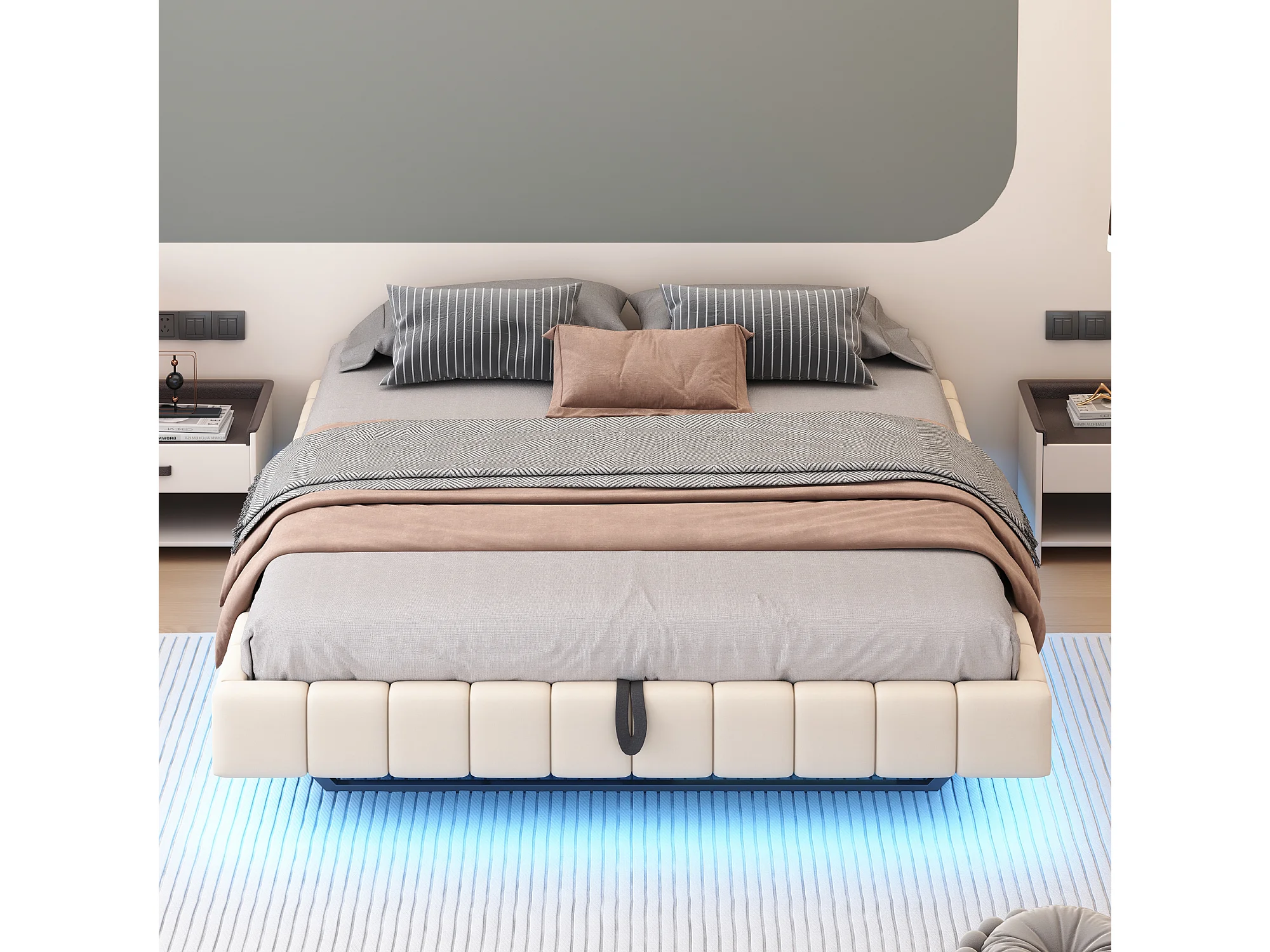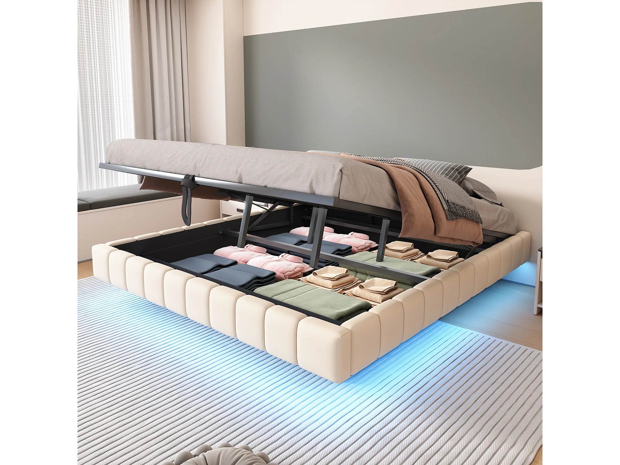 Gestoffeerd bed 180x200 cm zonder hoofdeinde – hydraulisch zwevend frame, LED, geïntegreerde opbergruimte – Beige linnen (zonder matras)