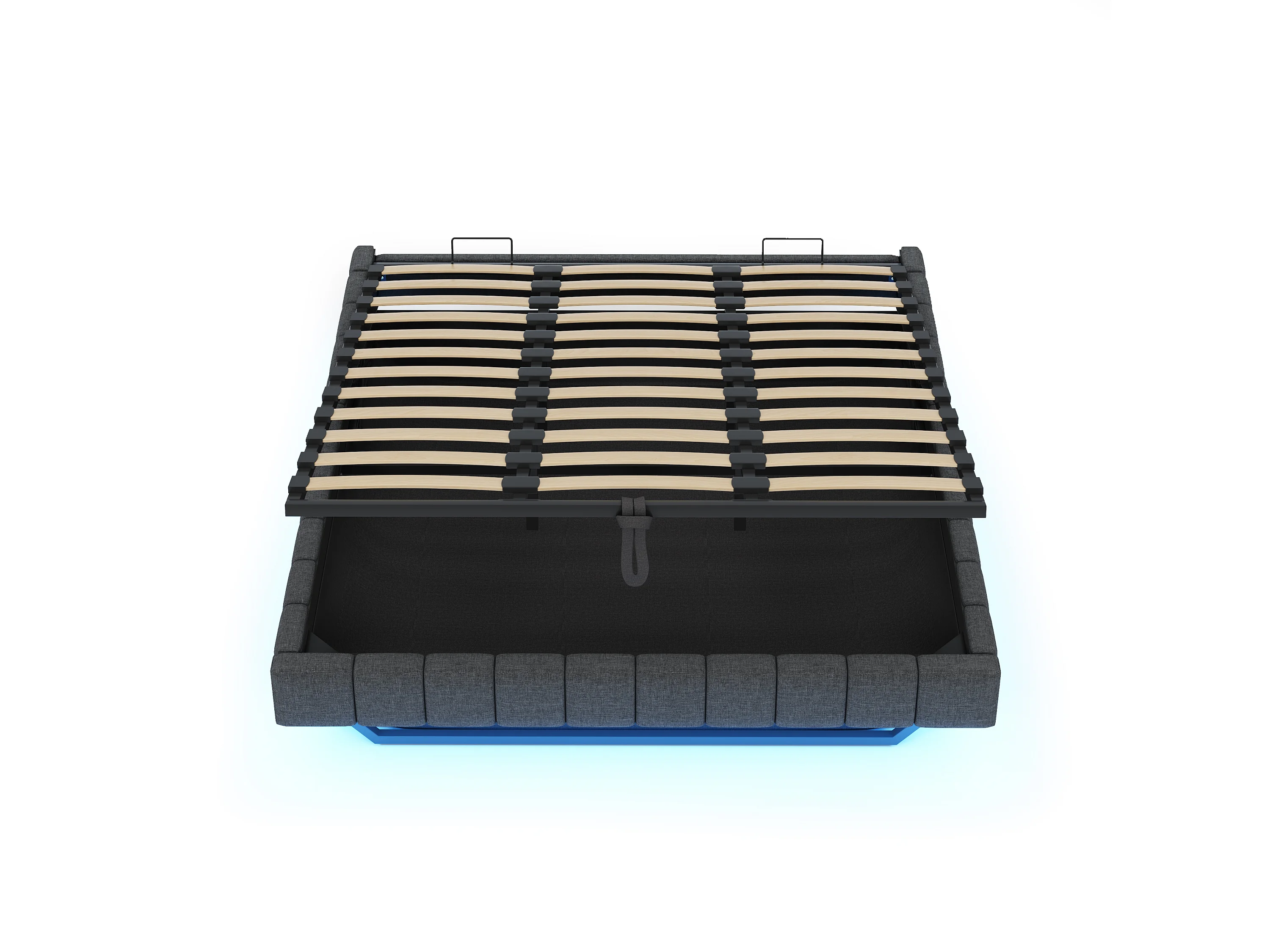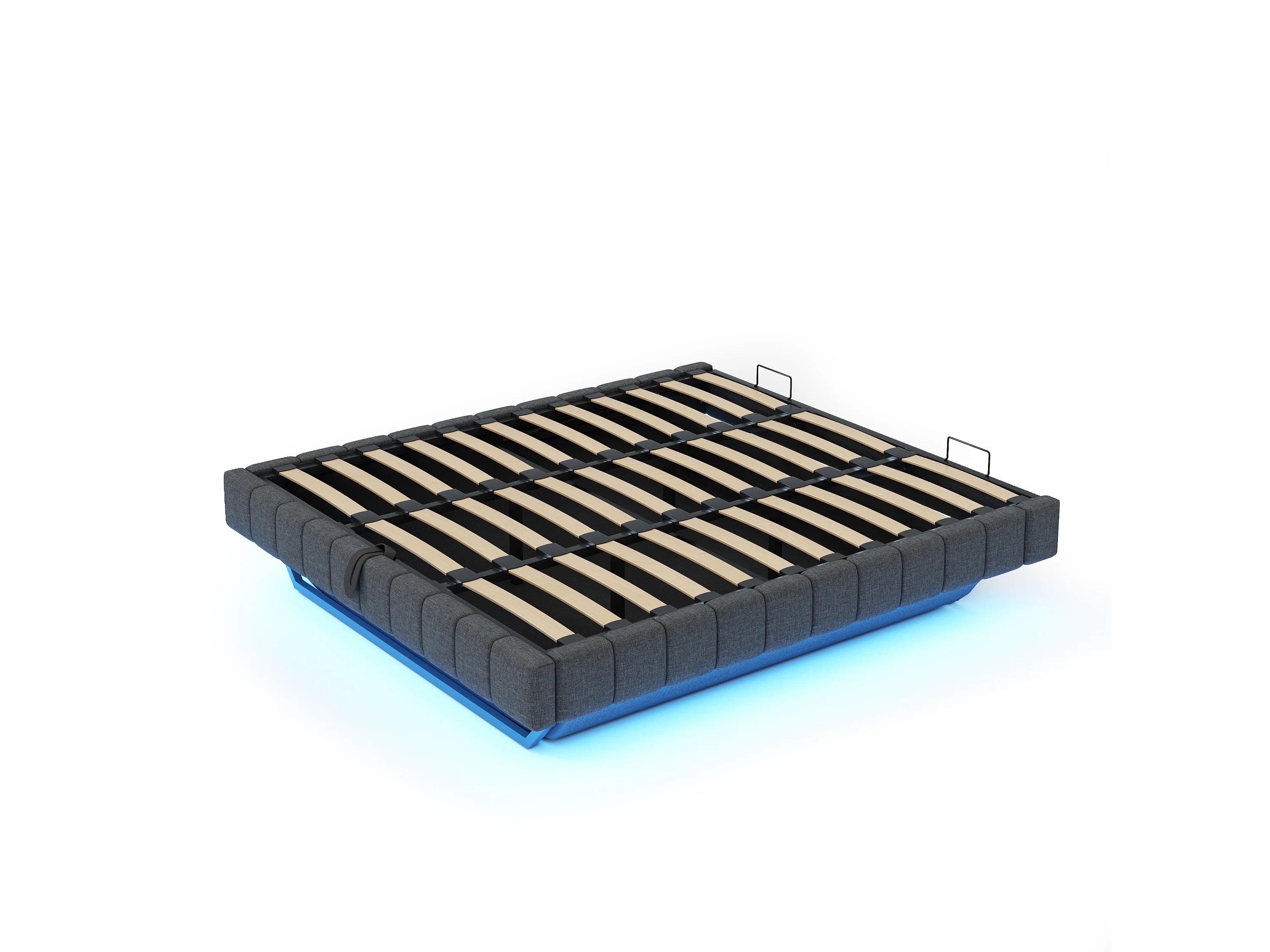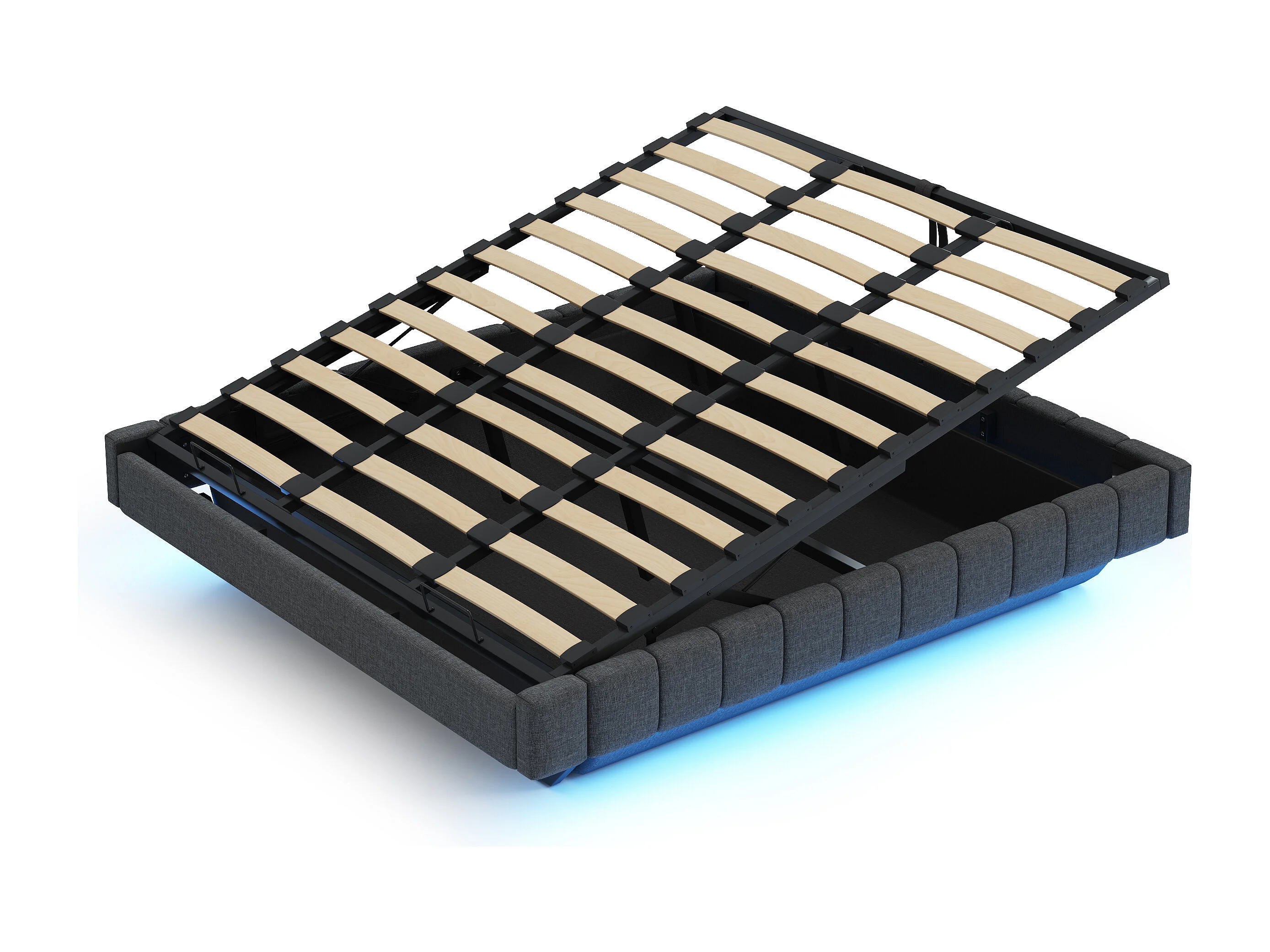 Gestoffeerd bed 180x200 cm zonder hoofdeinde – hydraulisch zwevend frame, LED, geïntegreerde opbergruimte – grijs linnen (zonder matras)