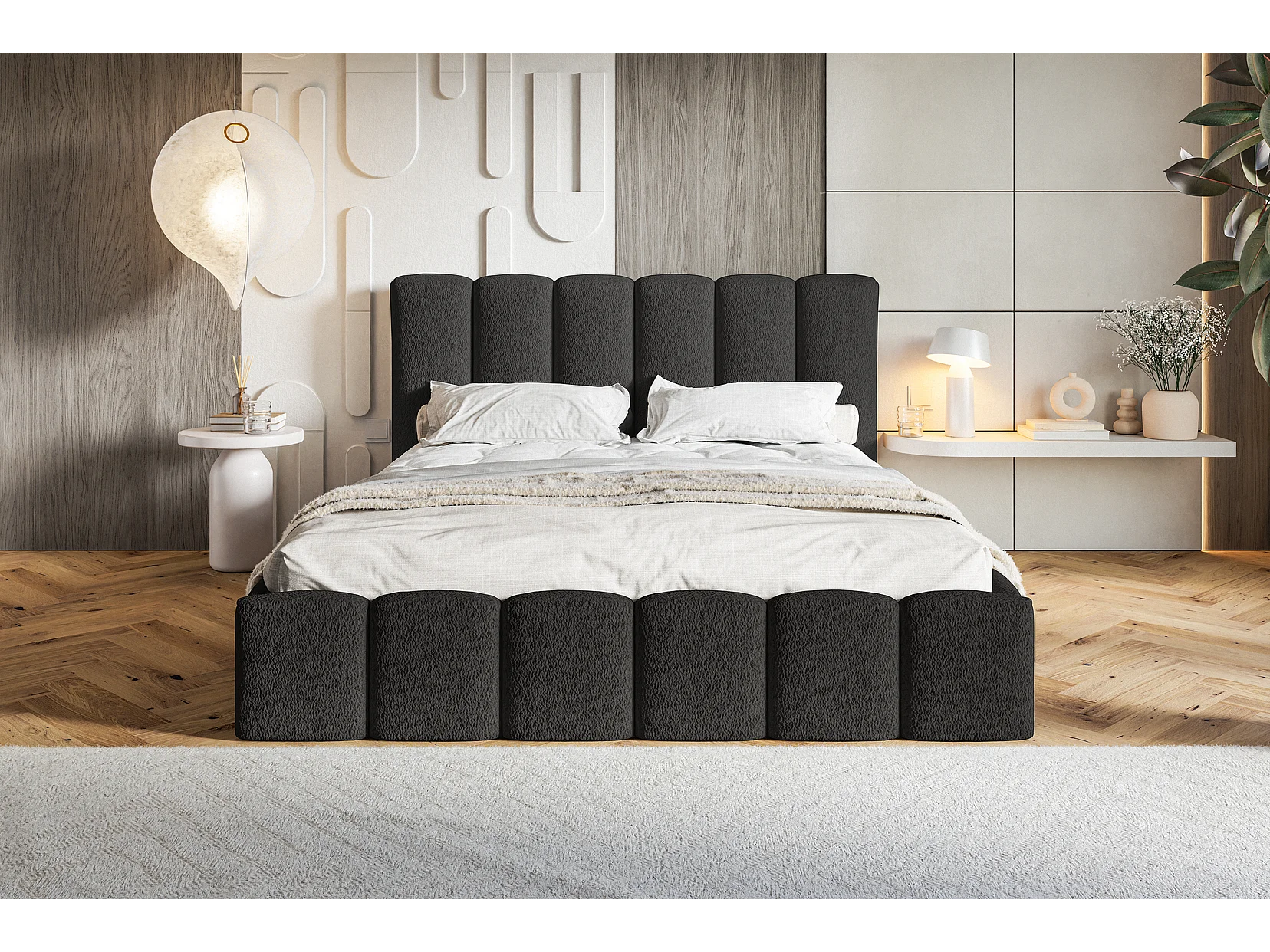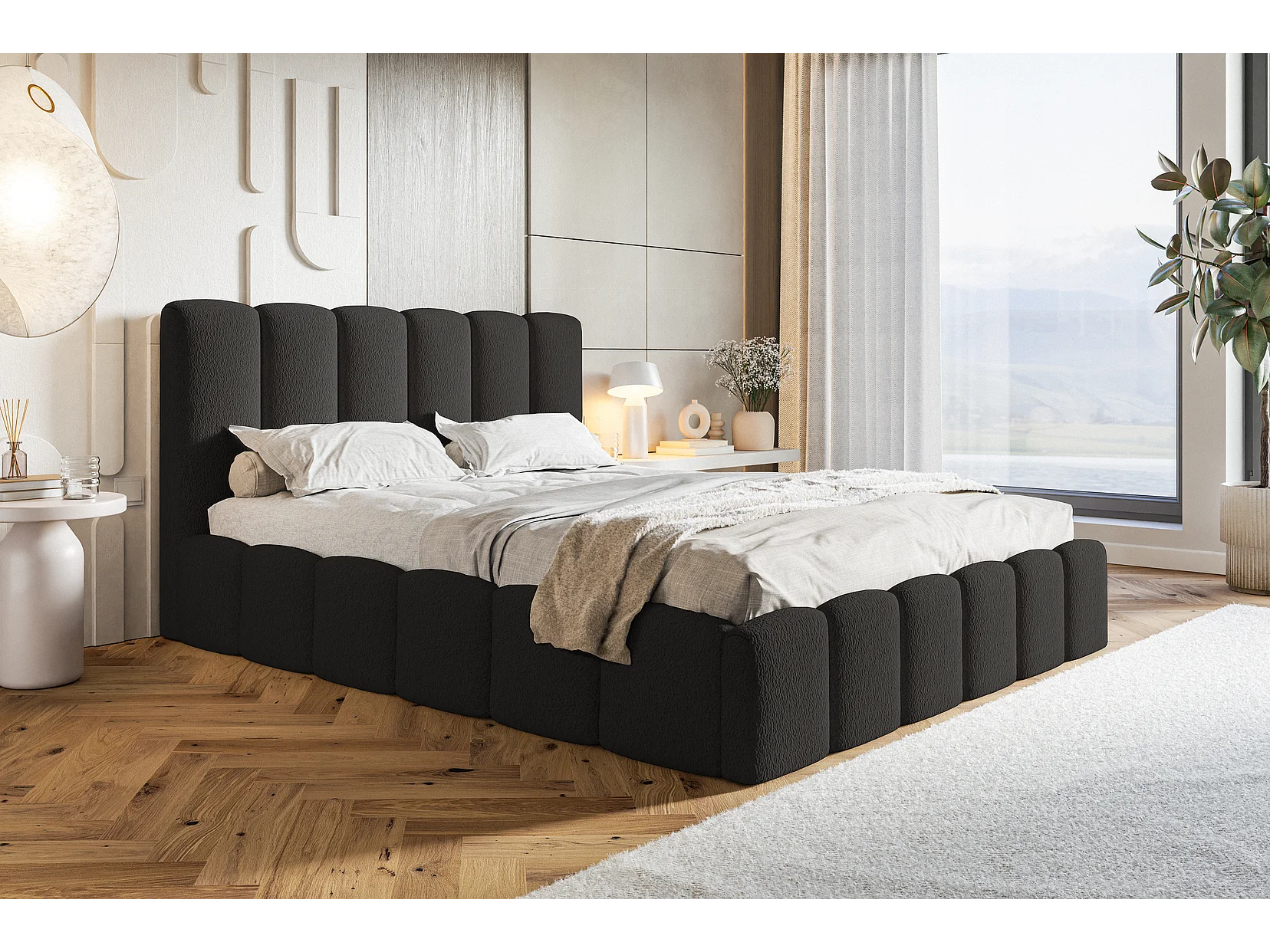 Gestoffeerd bed 180x200 Palermo met metalen lattenbodem - opbergruimte, Bouclé Zwart (Anthology 19)