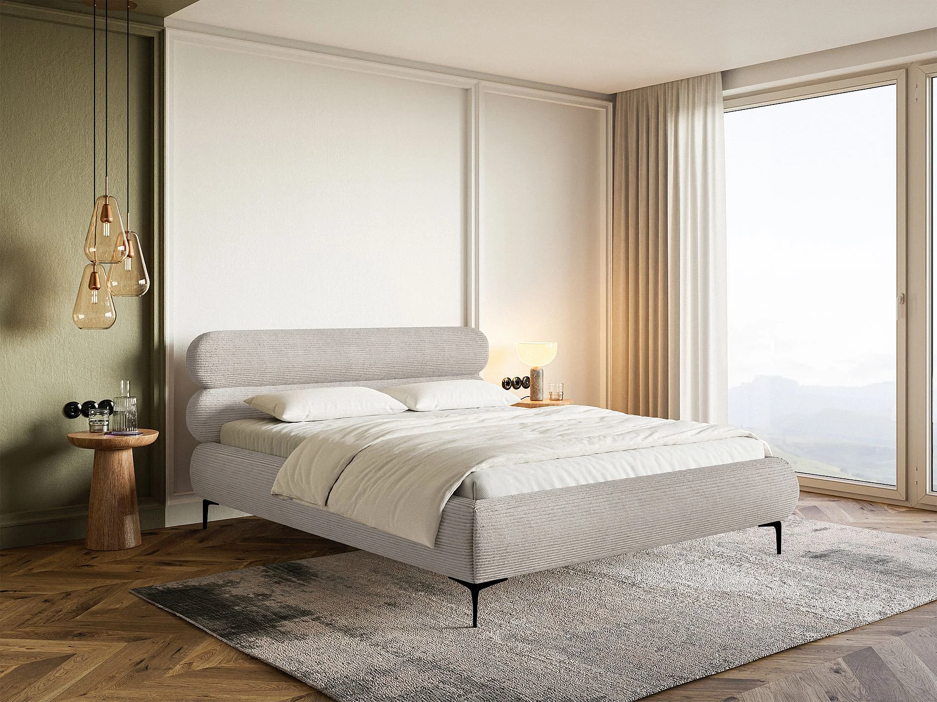 Gestoffeerd bed 180×200 – ribfluweel en zwarte poten – greige – ROULE CORD