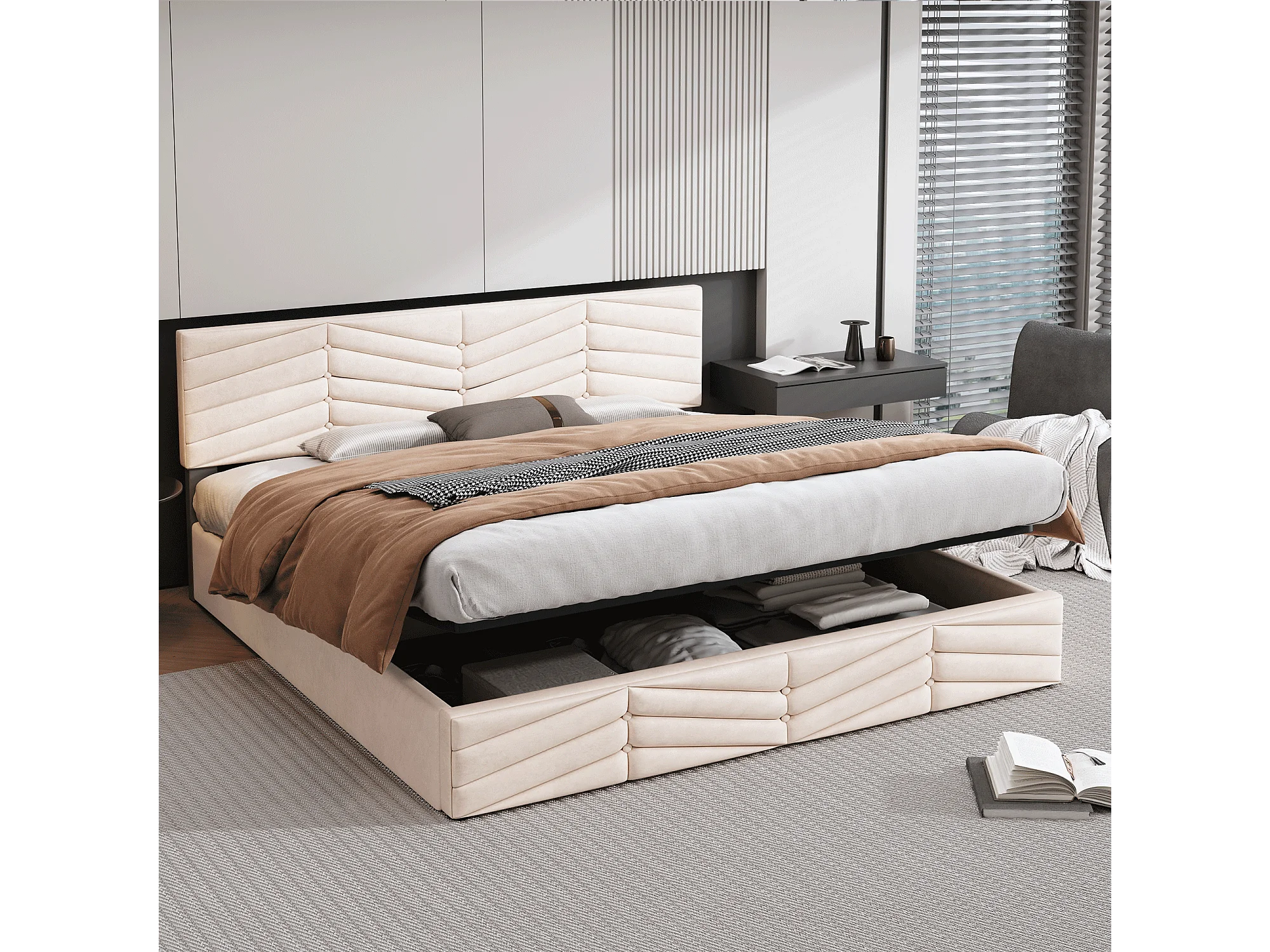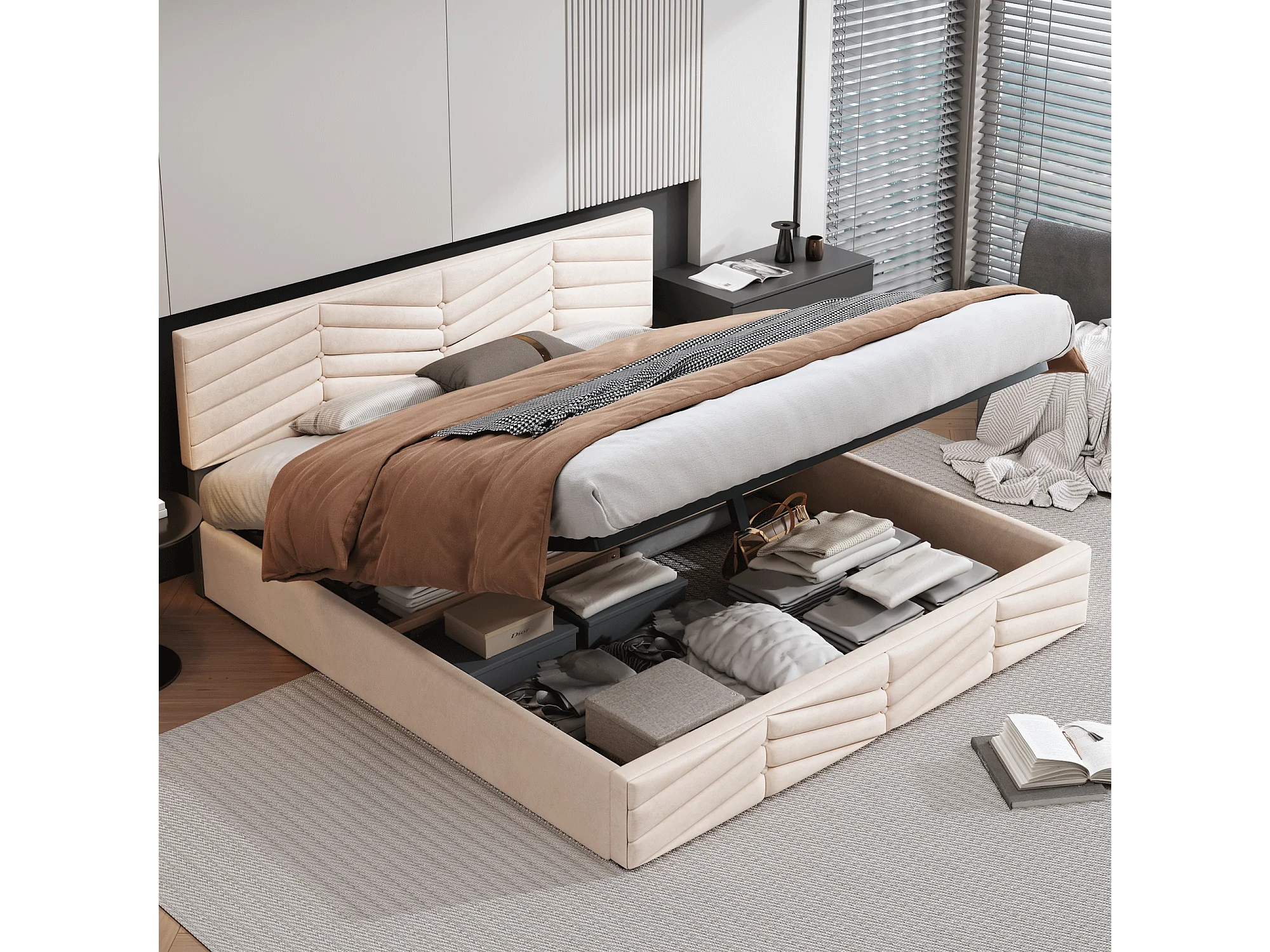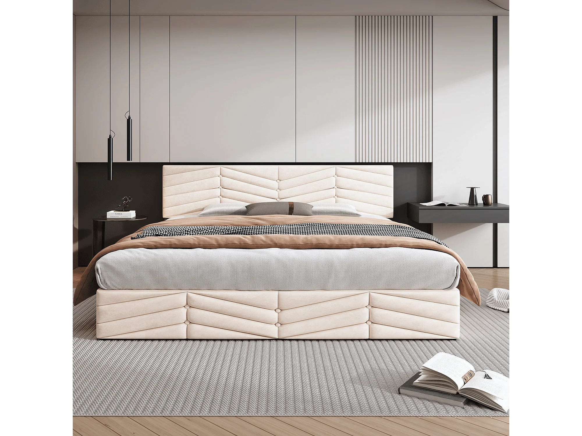 Gestoffeerd bed, met hoofdbord, knopen en klinknagels, fluweel, beige, 160x200 cm (165x205,5x90/95 cm)