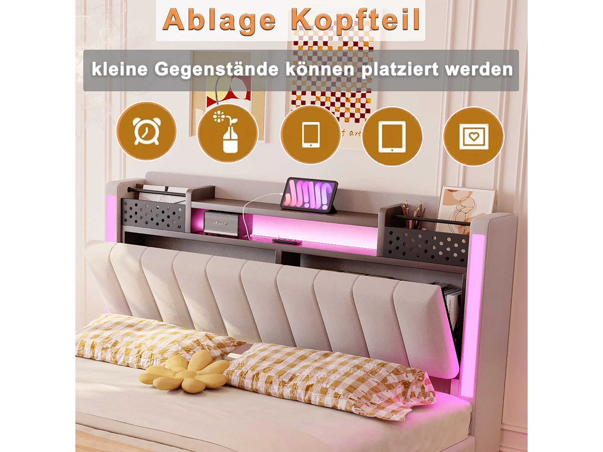 Gestoffeerd bed met LED, USB-aansluiting, opbergruimte in het hoofdeinde, beige linnen, zwevend design (222x145,5x111 cm)