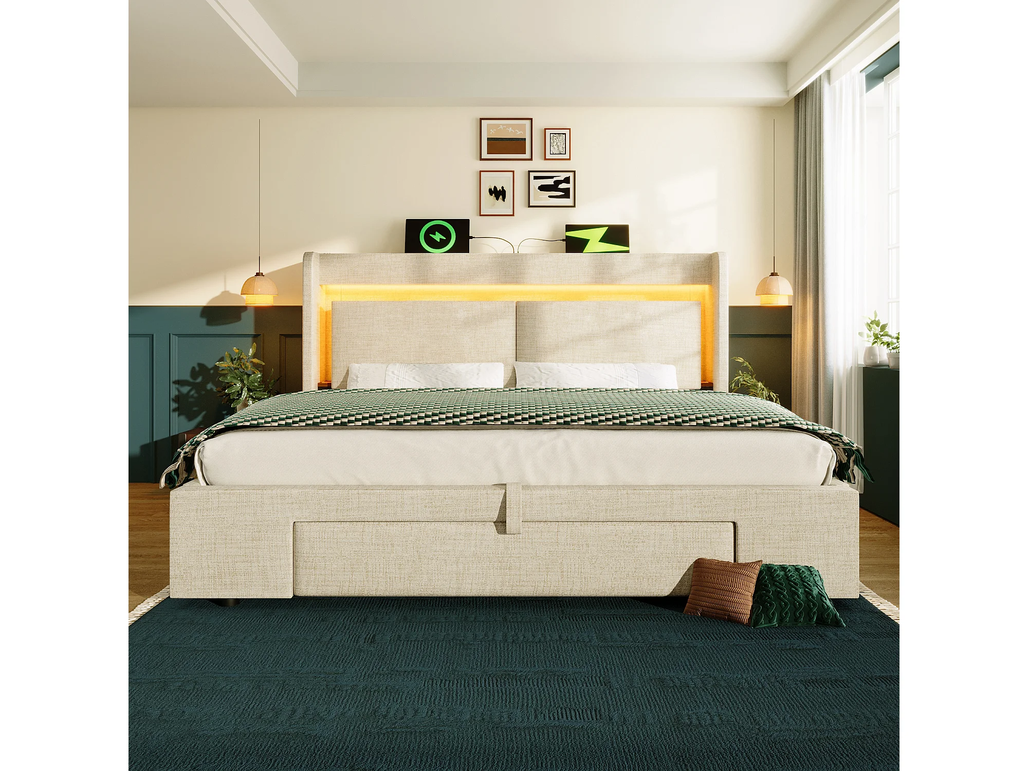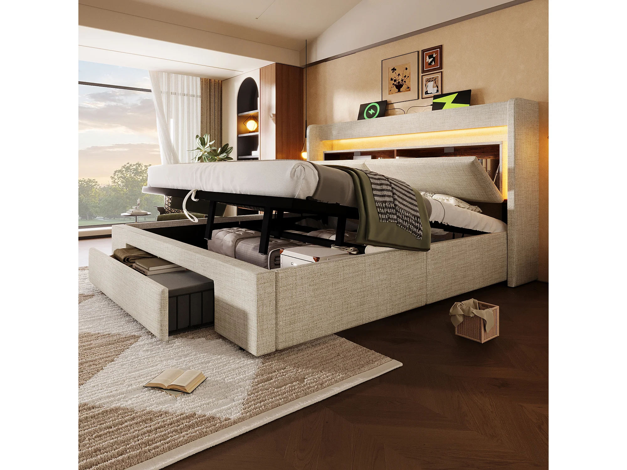Gestoffeerd hydraulisch opbergbed - 180 x 200 cm - met opbergbaar hoofdeinde + LED's + USB + lade - linnen - beige