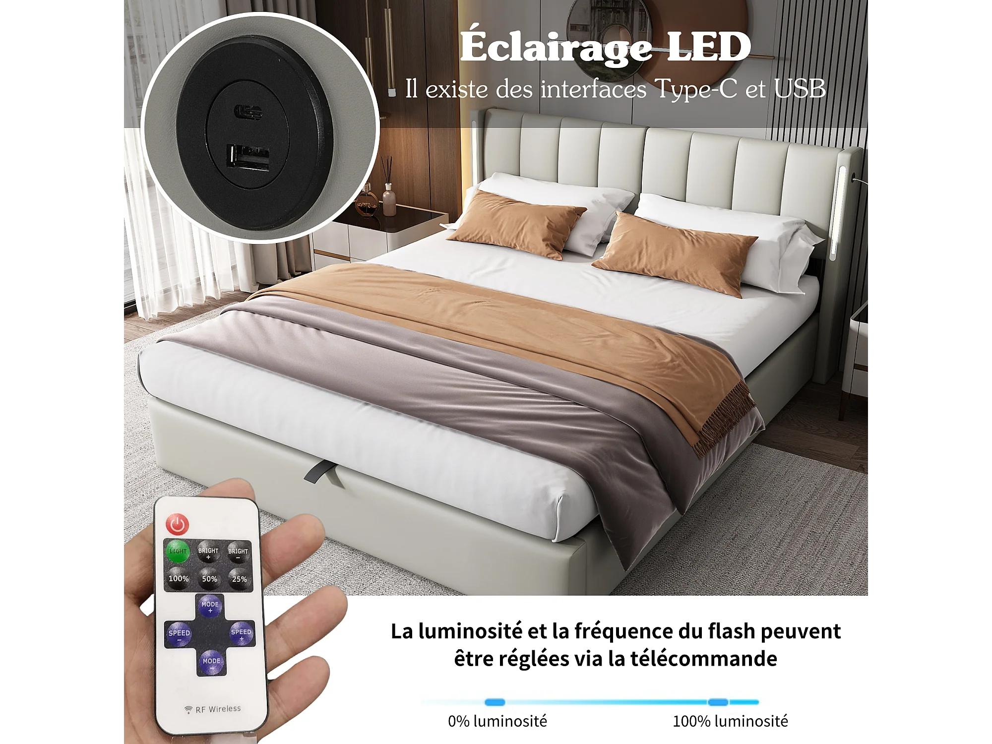 Gestoffeerd LED-bed met hydraulische basis, LED-verlichting, USB, opbergruimte, verstelbaar hoofdeinde, grijs fluweel (140x190 cm)