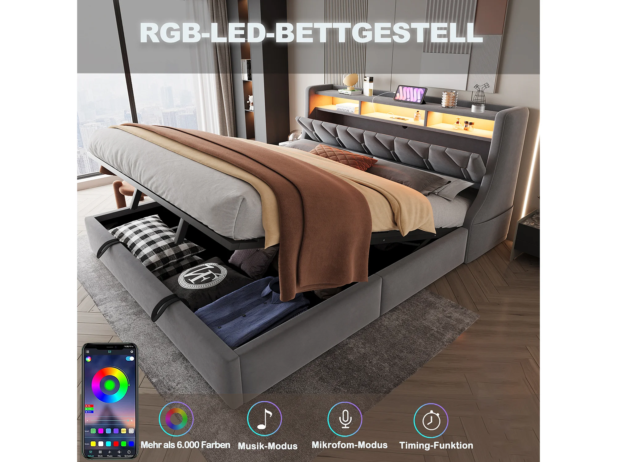 Gestoffeerd opbergbed - 180 x 200 cm - hydraulisch - neerklapbaar hoofdeinde met opbergruimte + LED-verlichting - MDF - grijs
