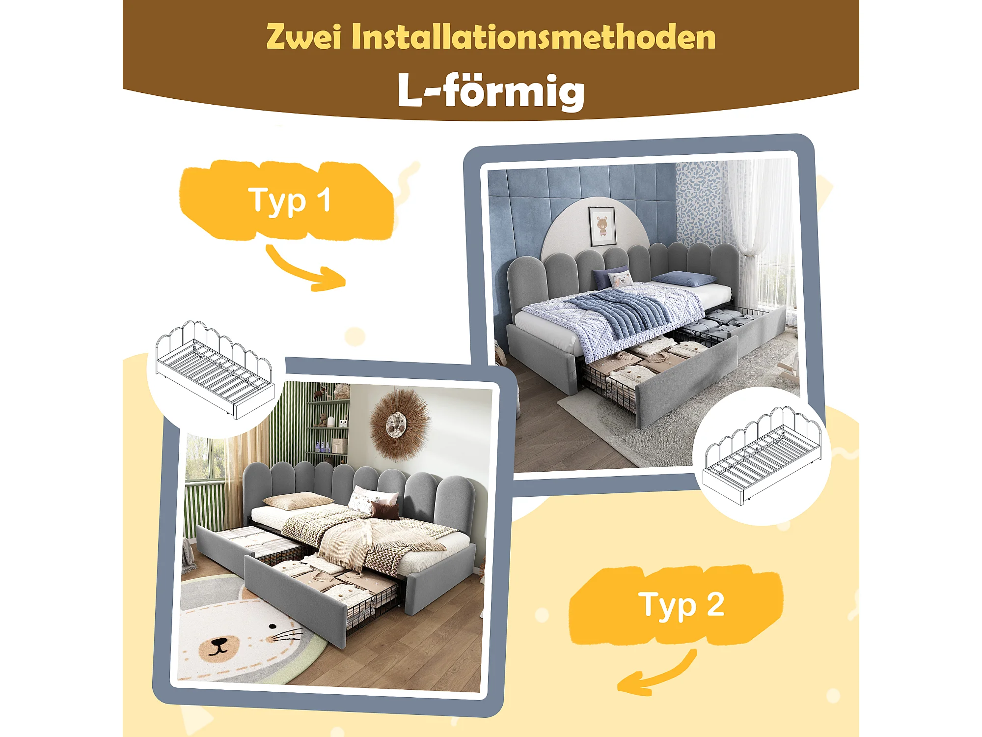 Gestoffeerd opbergbed voor kinderen - 90 x 190 cm - met 2 lades + lattenbodem - slaapbank - fluweel - grijs