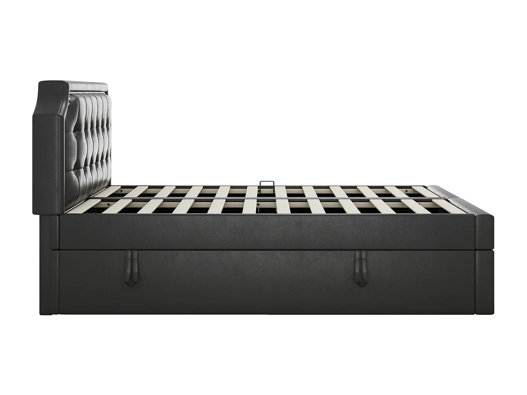 Tweepersoonsbed 140x200cm in zwart PU-leer met hydraulische opbergruimte, LED-hoofdbord met oplaadpoorten en lichtstrip aan het voeteneind van het bed