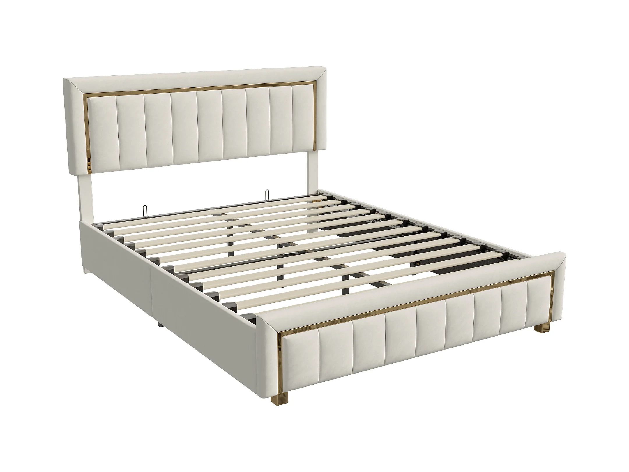 160x200cm fluwelen opbergbed - functioneel opbergbed - tweepersoonsbed - lattenbodem en hydraulische opbergbox - beige