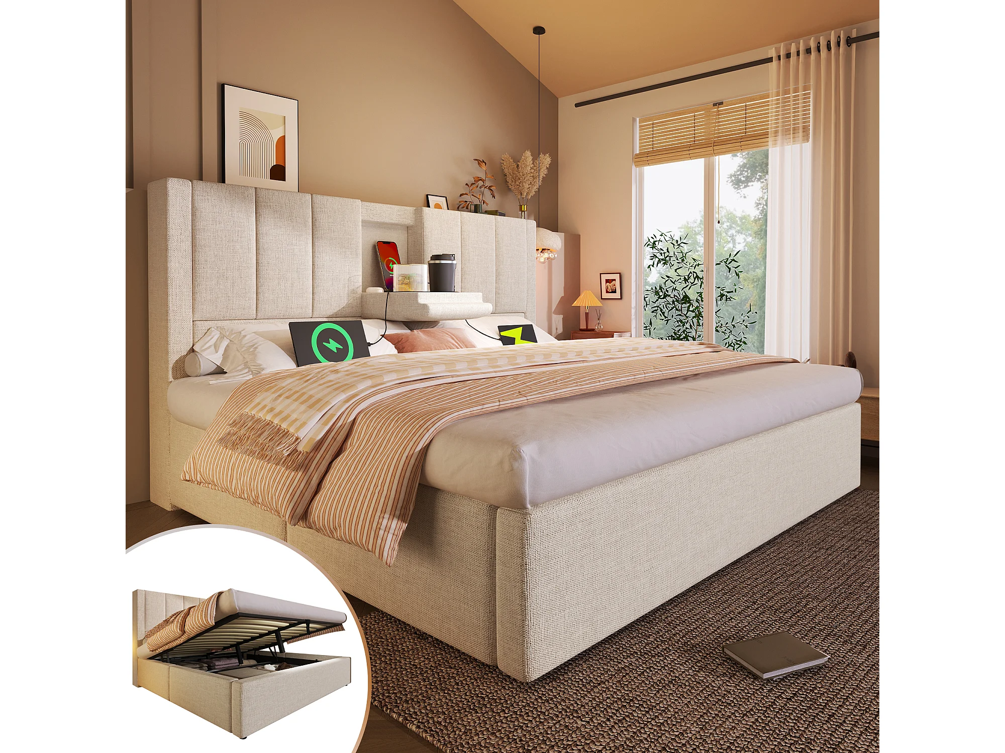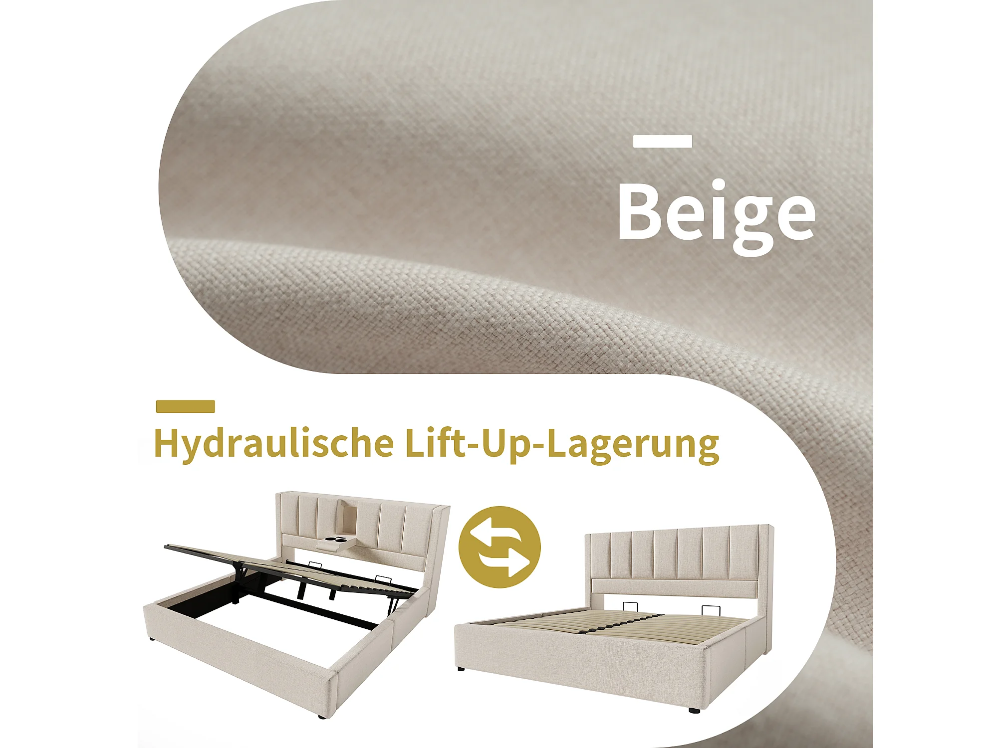 Hydraulisch opbergbed met hoofdeinde + LED's en USB/Type-C-poorten - 180 x 200 cm - linnen - beige