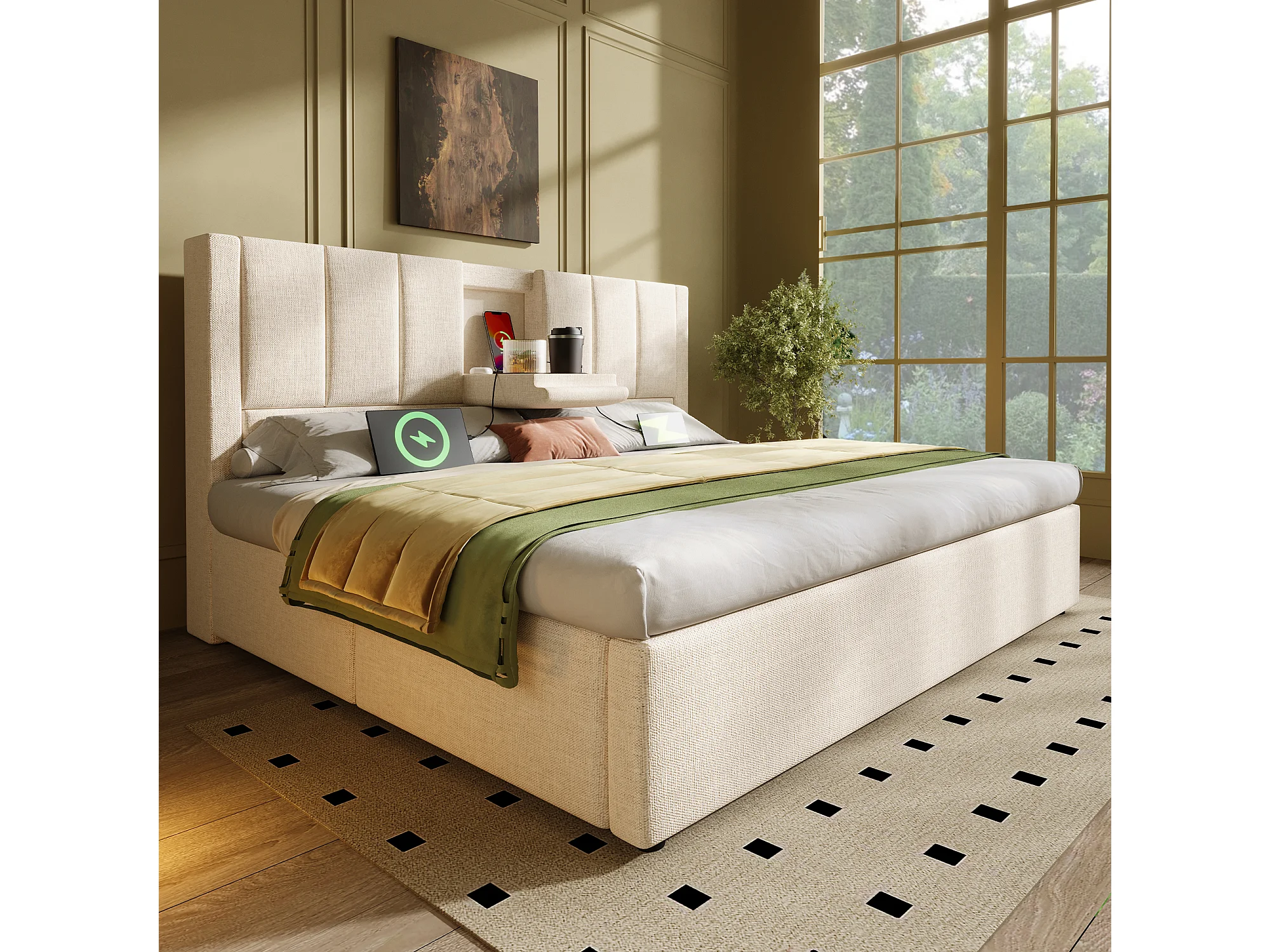 Gestoffeerd tweepersoonsbed met opbergruimte - 180 x 200 cm - met verborgen bekerhouder en oplaadstation - linnen - beige
