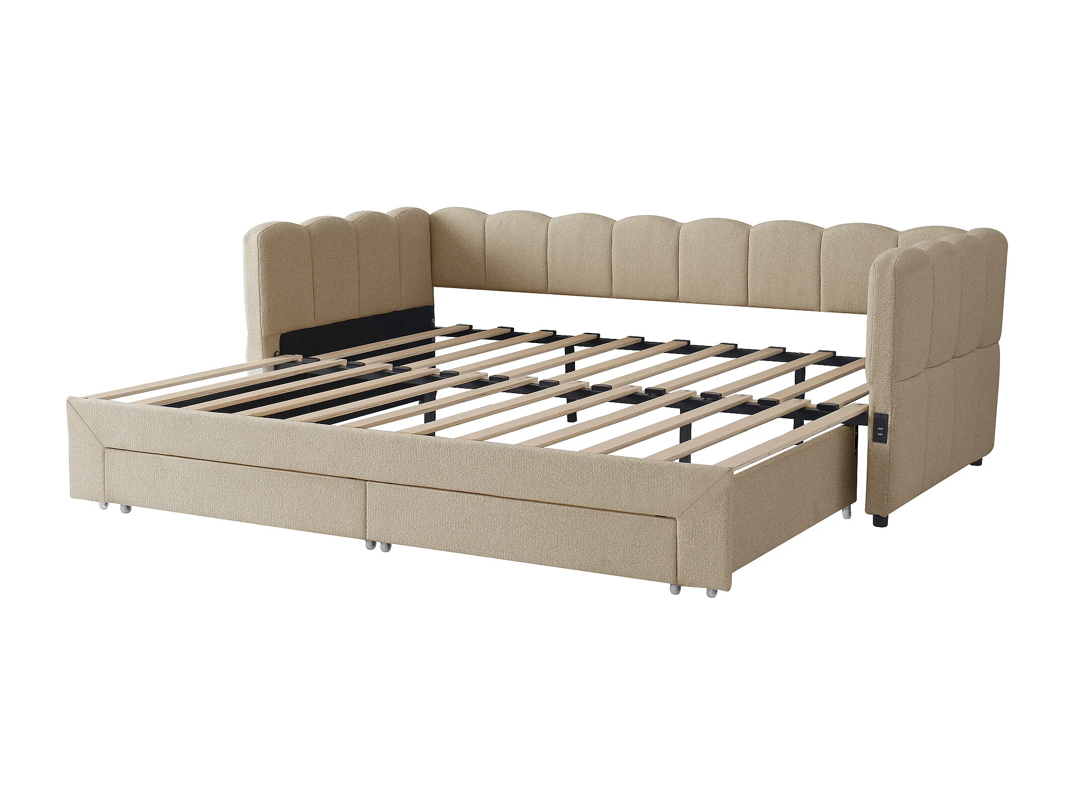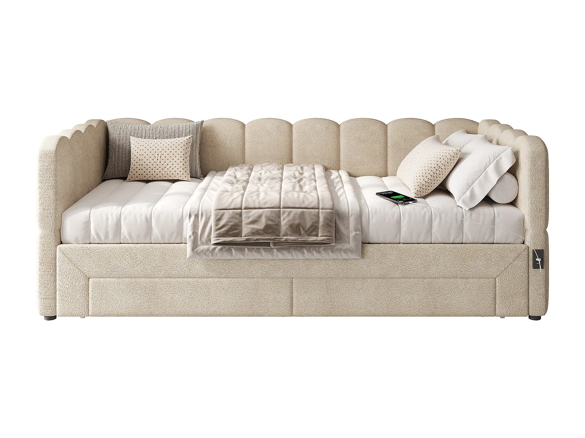 Gestoffeerde slaapbank 90x190cm - met uitschuifbaar bedframe - met 2 lades en USB-poort - Chenille stof - Beige​ (matras niet inbegrepen)
