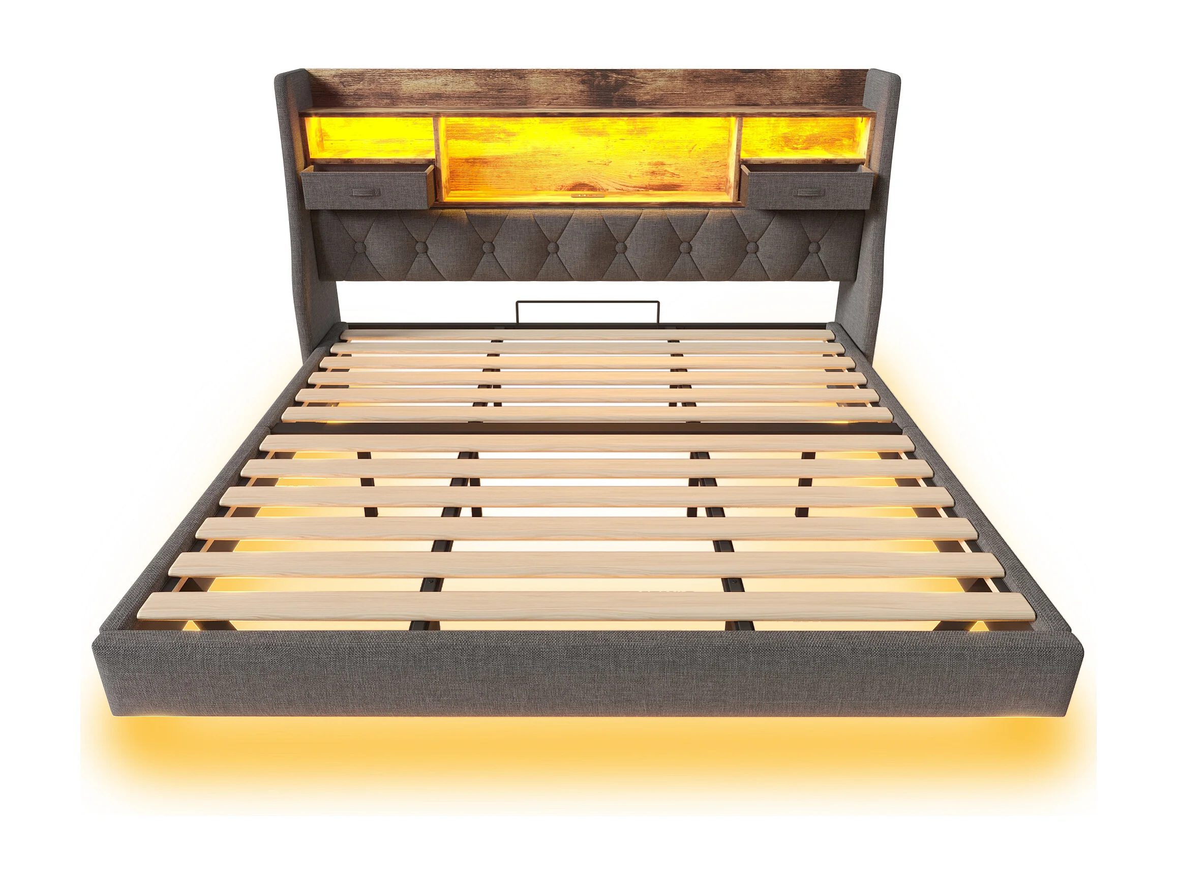 Gestoopt volwassen bed 90x200cm - met LED-verlichting - met 1 Type-C-poort en 3 USB-poorten - hoofdeinde met opbergruimte - linnen - Grijs