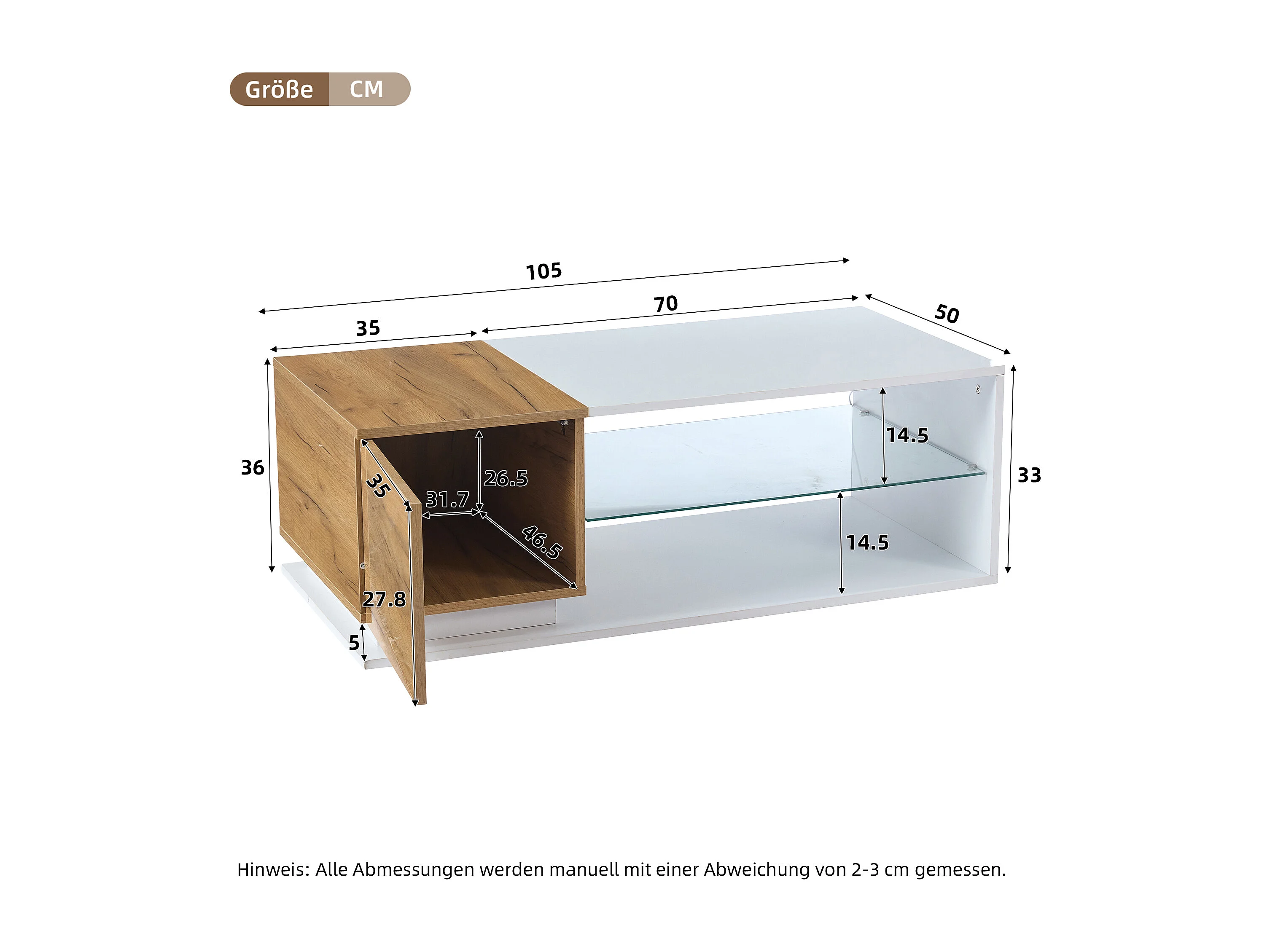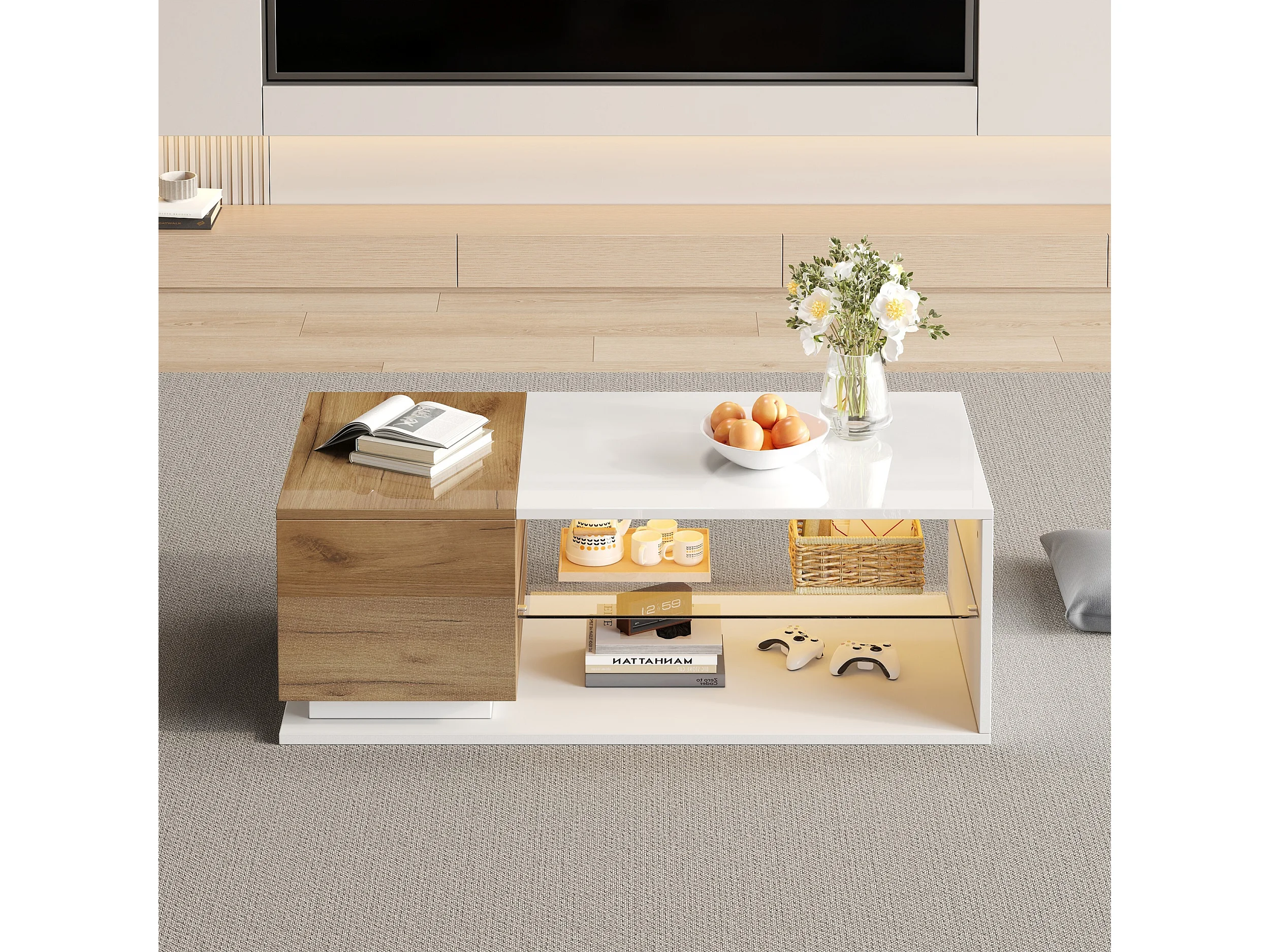 Glanzende salontafel, witte salontafel met 1 eikenhouten deur en open opbergplanken, ledverlichting