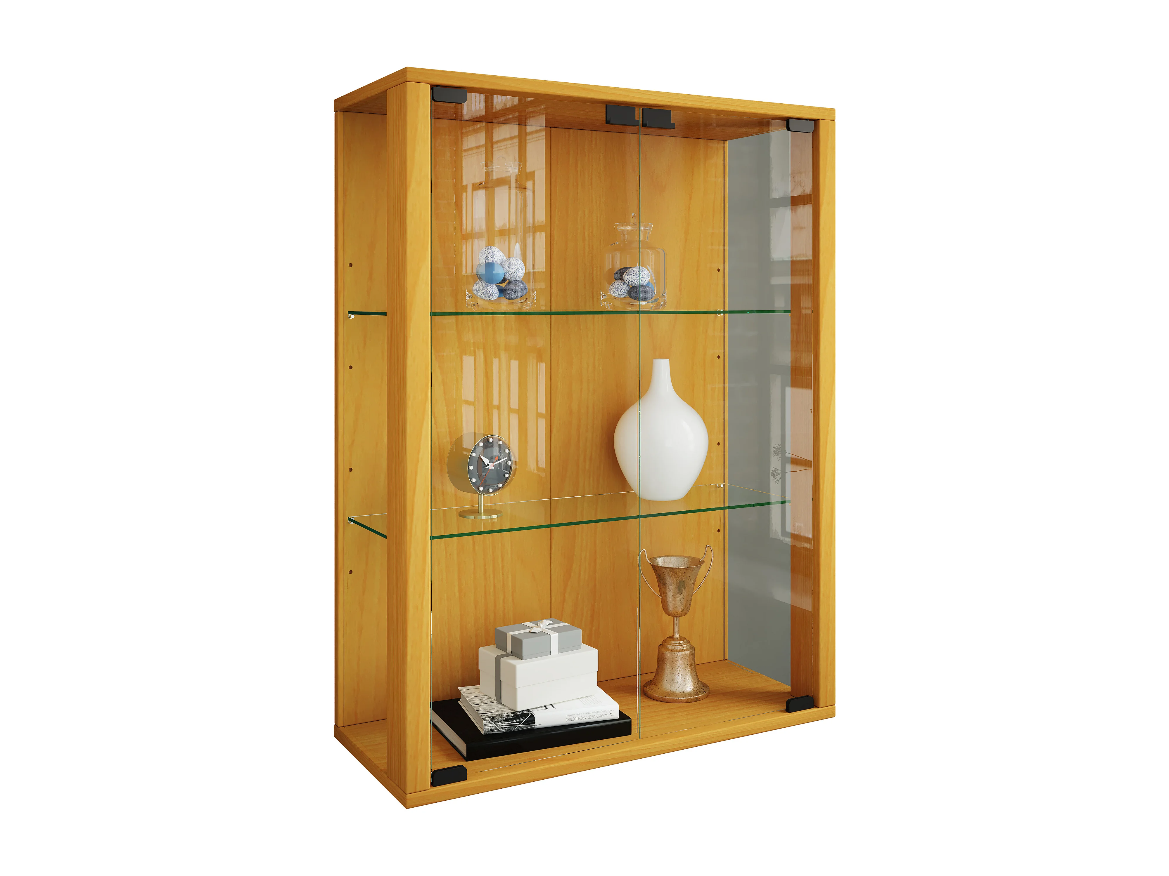 Wandvitrine met 2 deuren & 2 in hoogte verstelbare glasplanken - 80x60x25 cm - Beukenhoutkleur