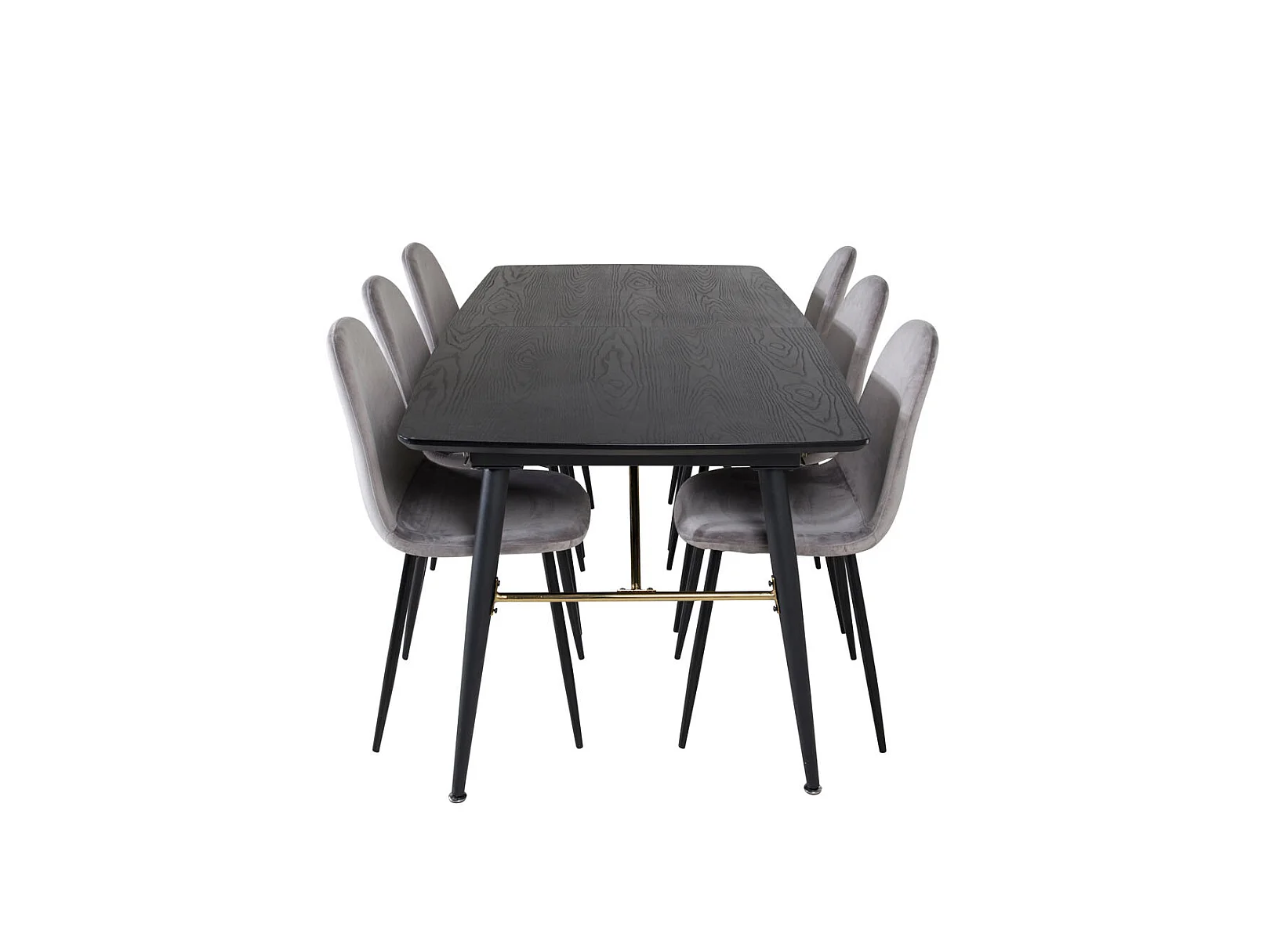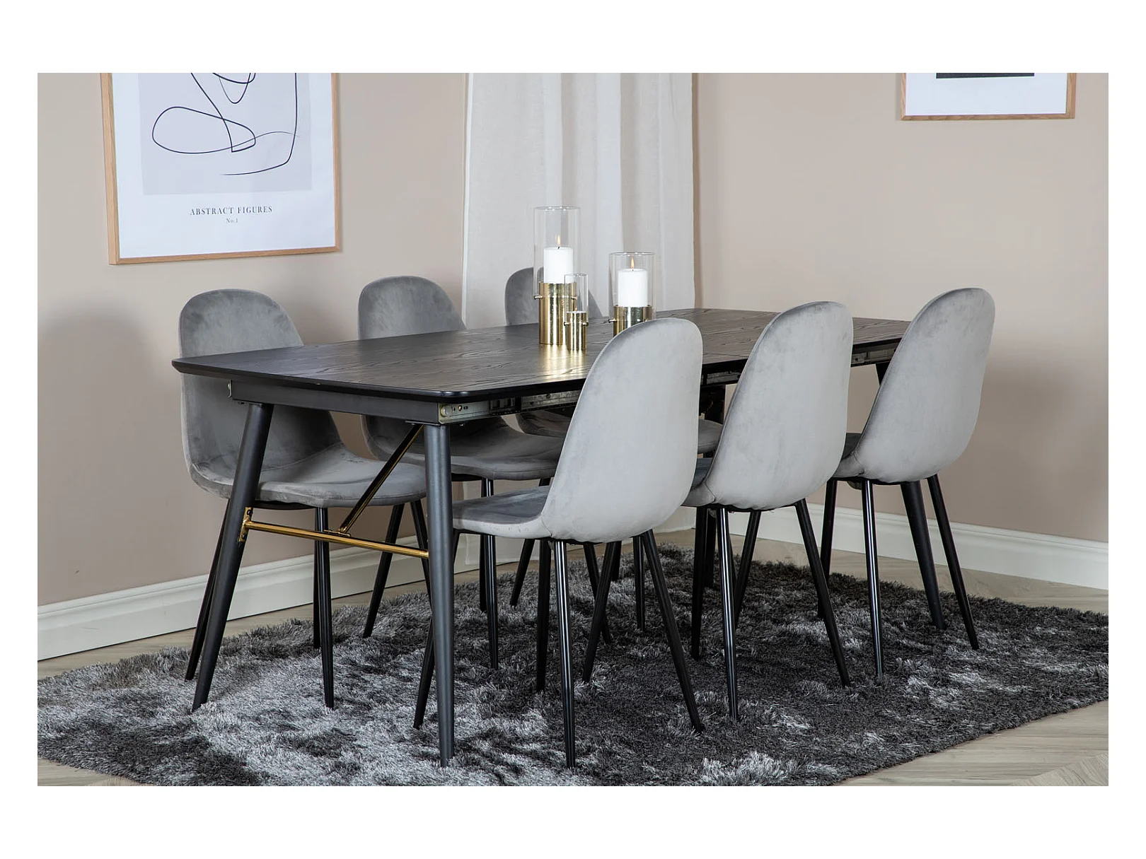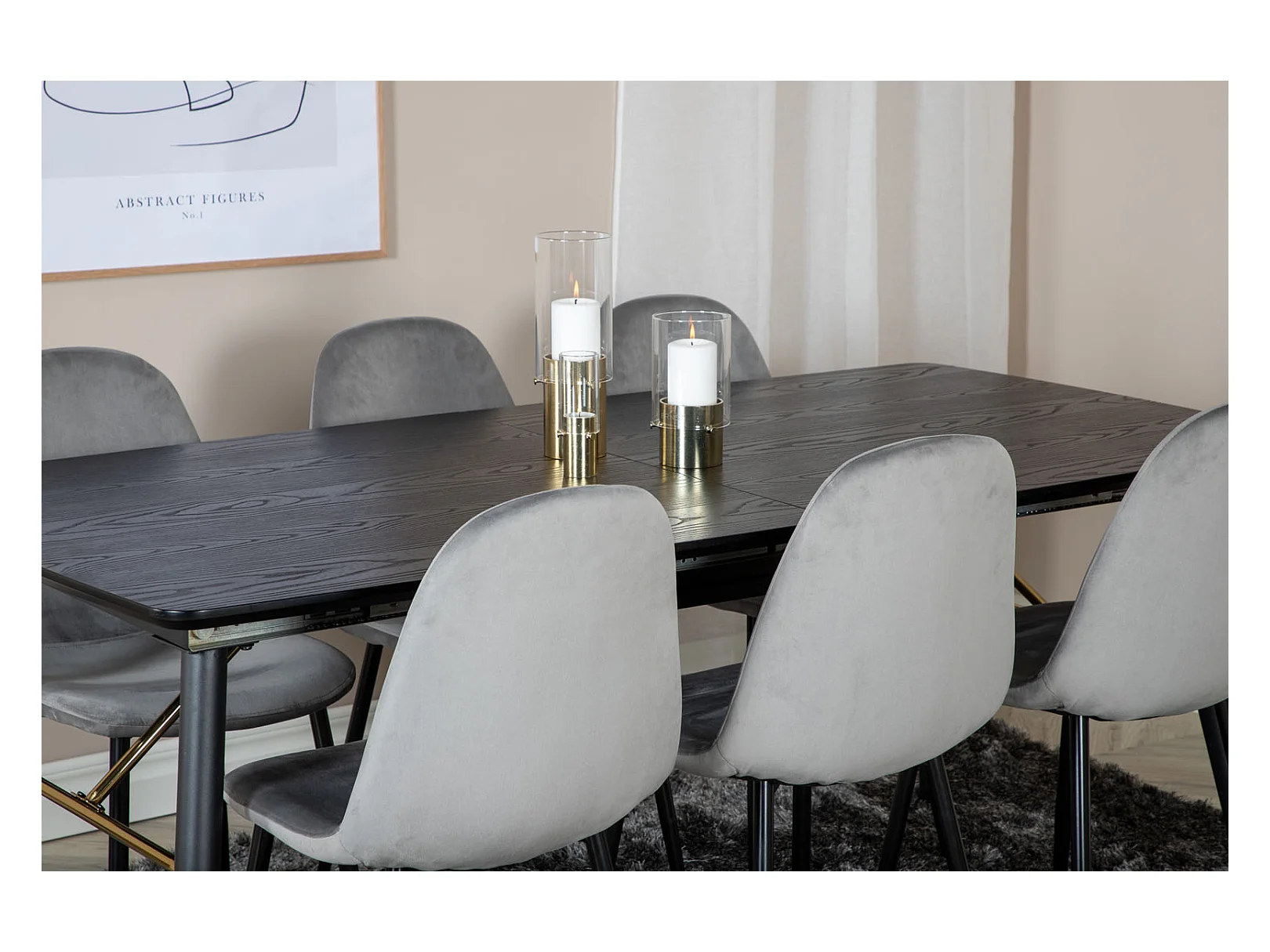 Gold eethoek eetkamertafel uitschuifbare tafel lengte cm 180 / 220 zwart en 6 Polar eetkamerstal velours grijs.