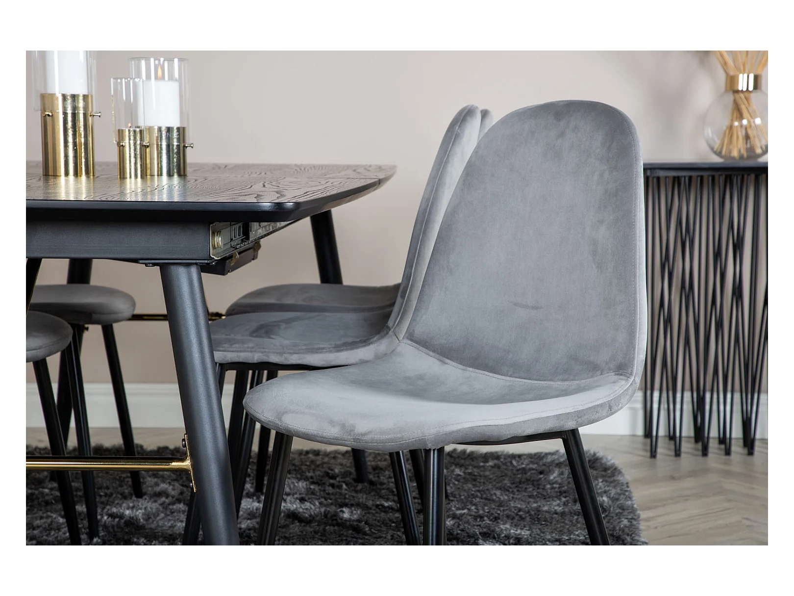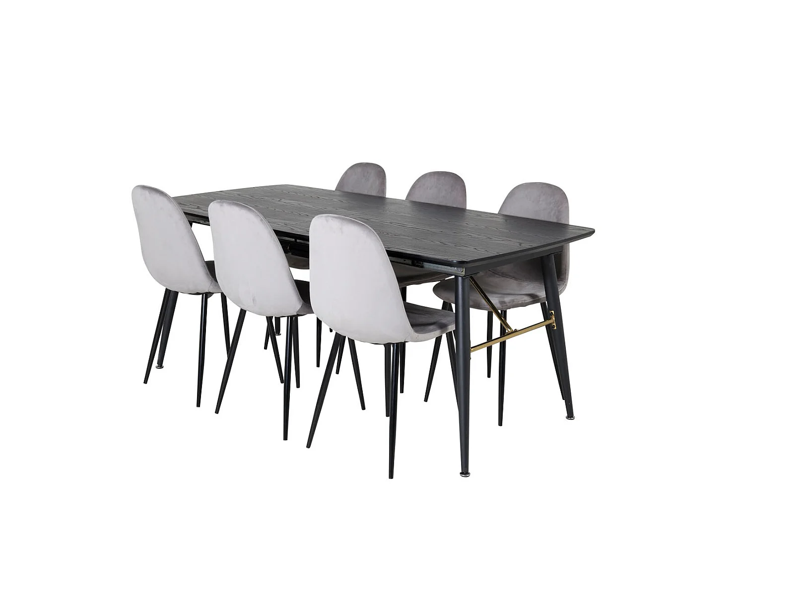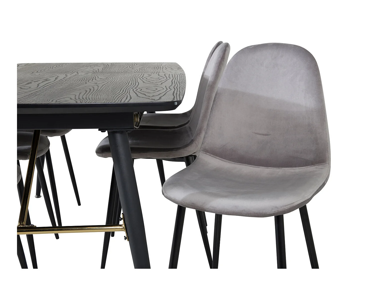 Gold eethoek eetkamertafel uitschuifbare tafel lengte cm 180 / 220 zwart en 6 Polar eetkamerstal velours grijs.