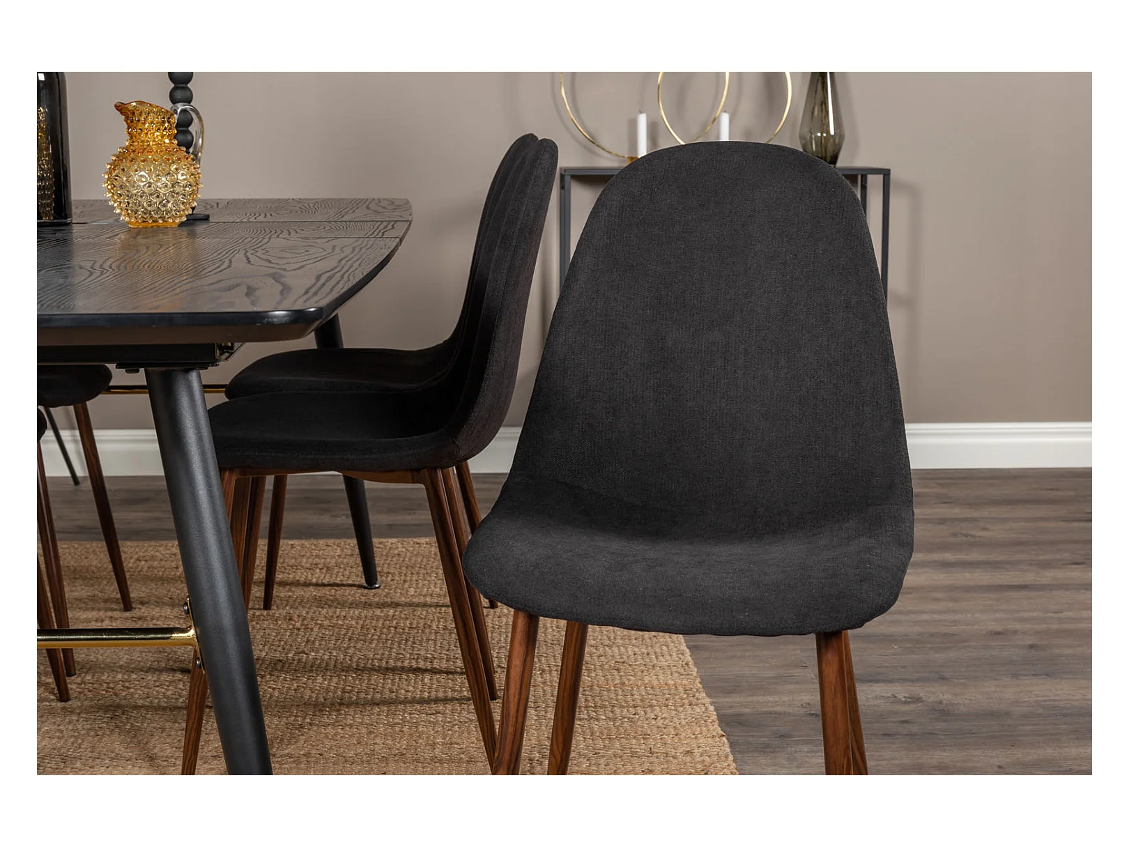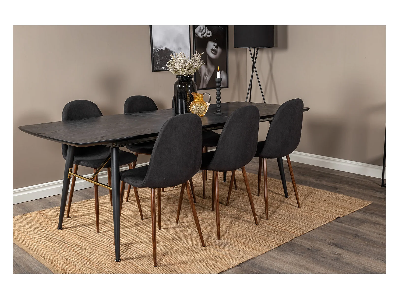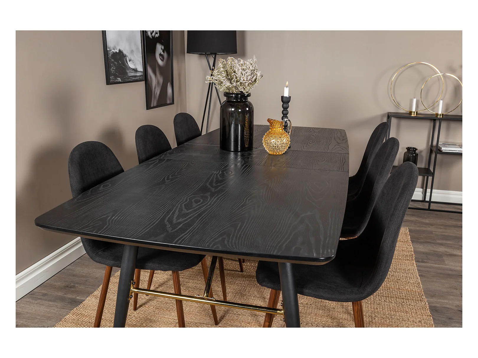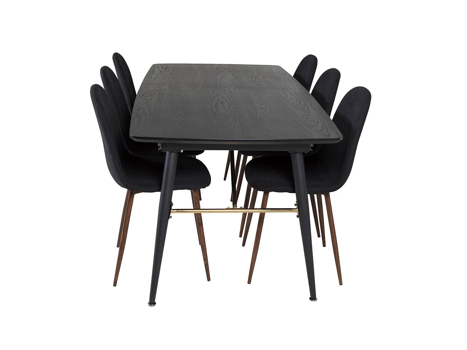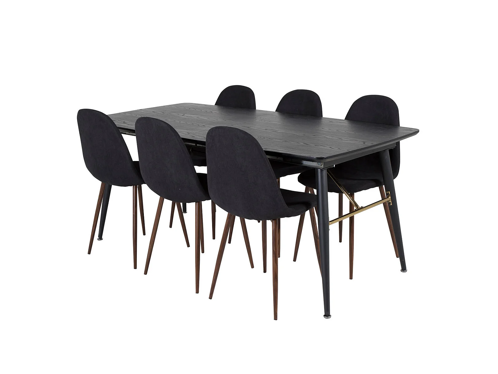 Gold eethoek eetkamertafel uitschuifbare tafel lengte cm 180 / 220 zwart en 6 Polar eetkamerstal zwart.