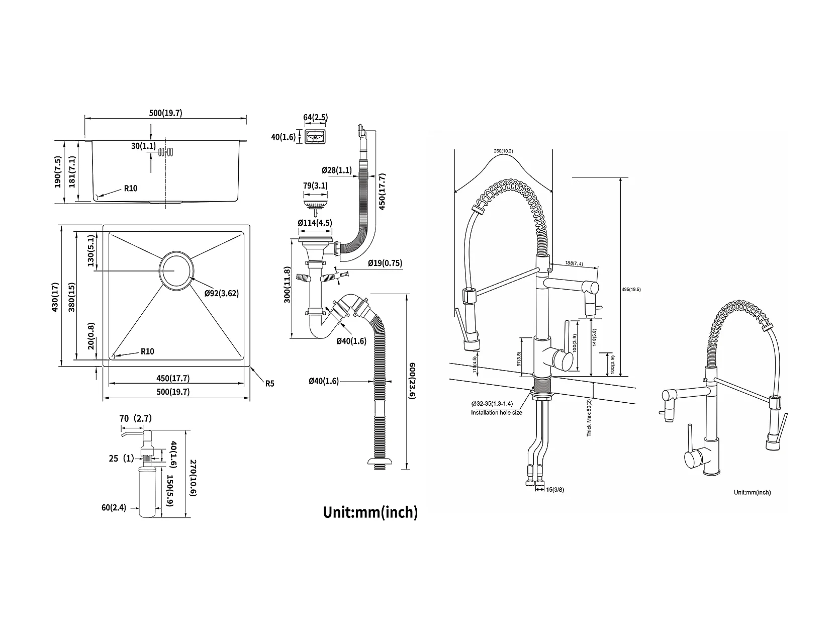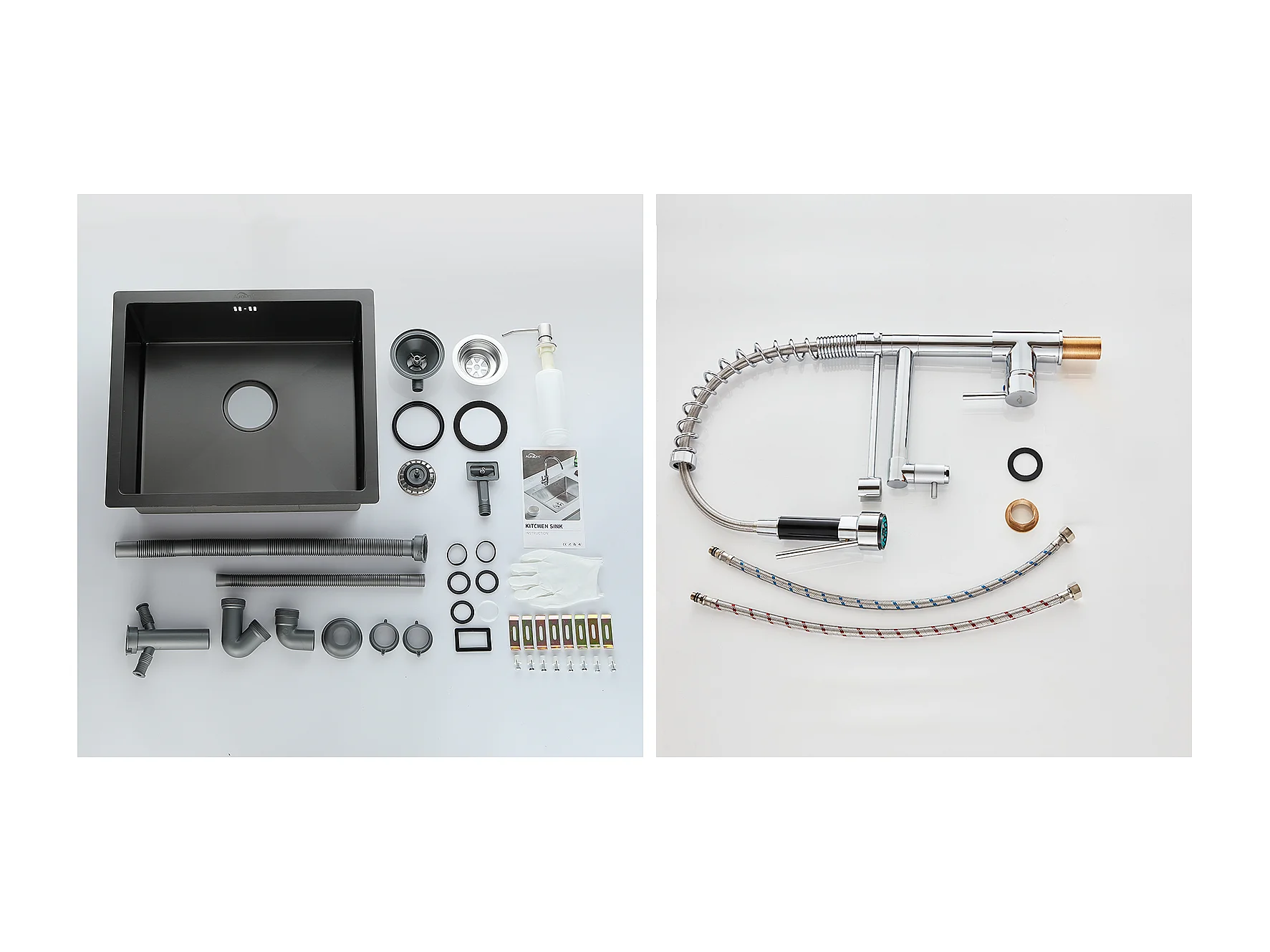 GootsteenZwart 1 Bak 50x43x18,5CM, Roestvrij Staal, met Zeepdistructor + 360° Draaibare Keukenkraan Uittrekbare Handdouche