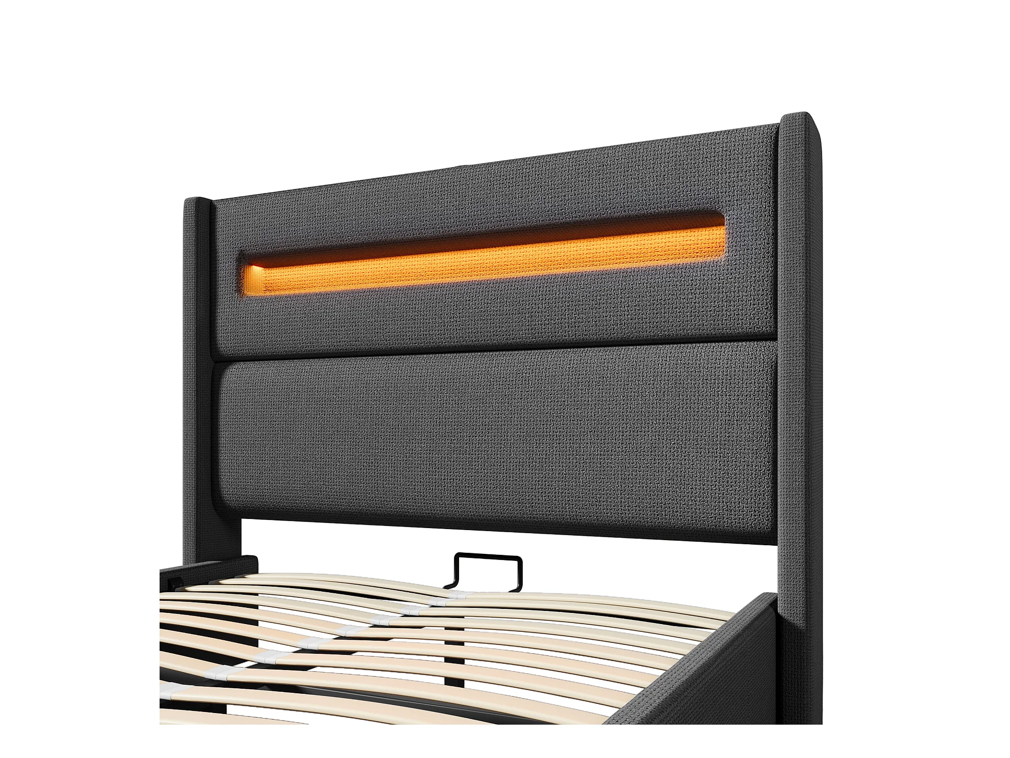 Volwassen opbergbed 140x200cm met LED en USB, stopcontact, grijs linnen hoofdeinde, zonder bedbodem, met matras